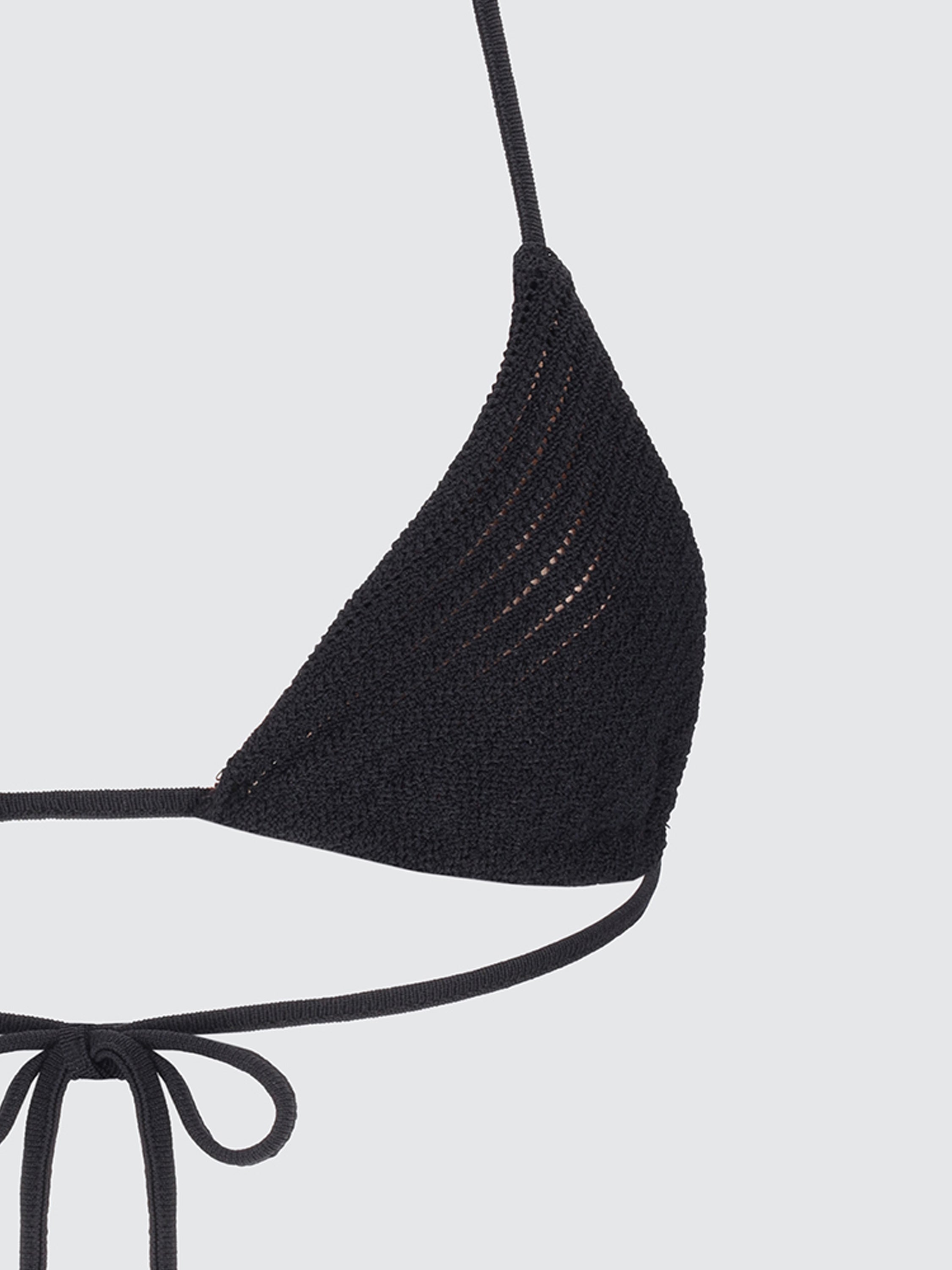 Questo bikini di Laneus è un modello che rievoca subito il mare, realizzato in maglia con una lavorazione traforata diagonale presenta il triangolo con un fiocco al collo abbinato a uno slip con lacetti regolabili.