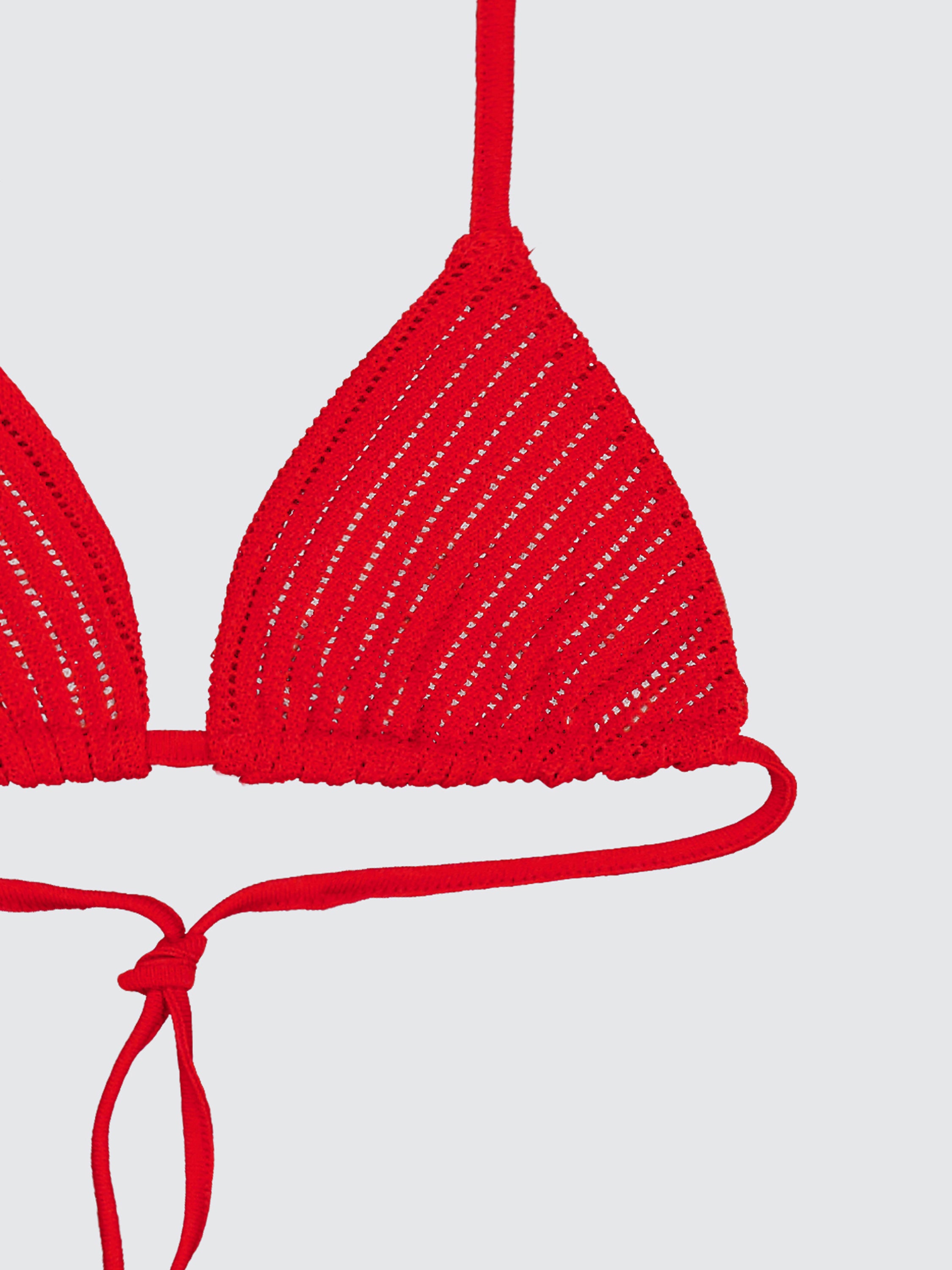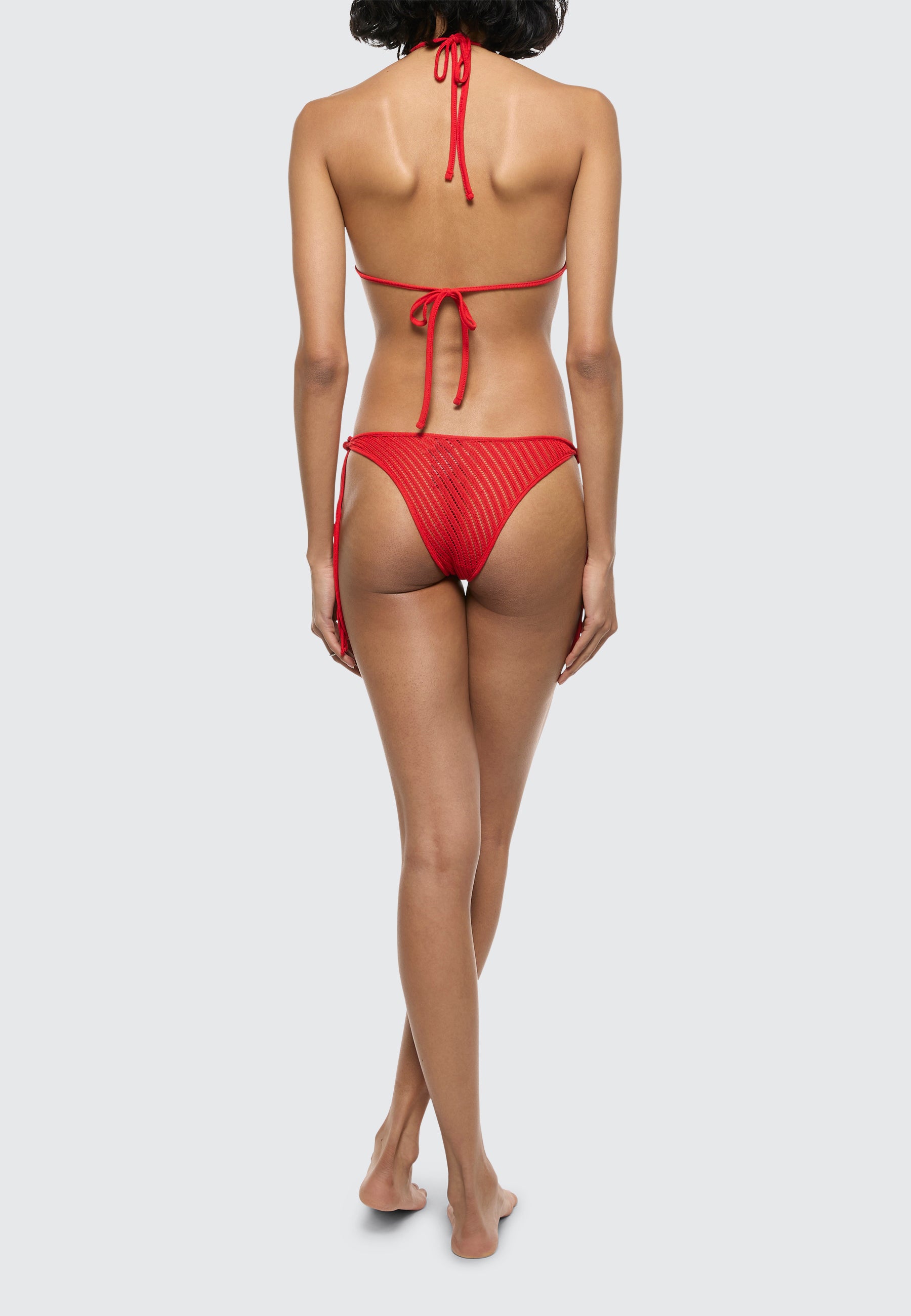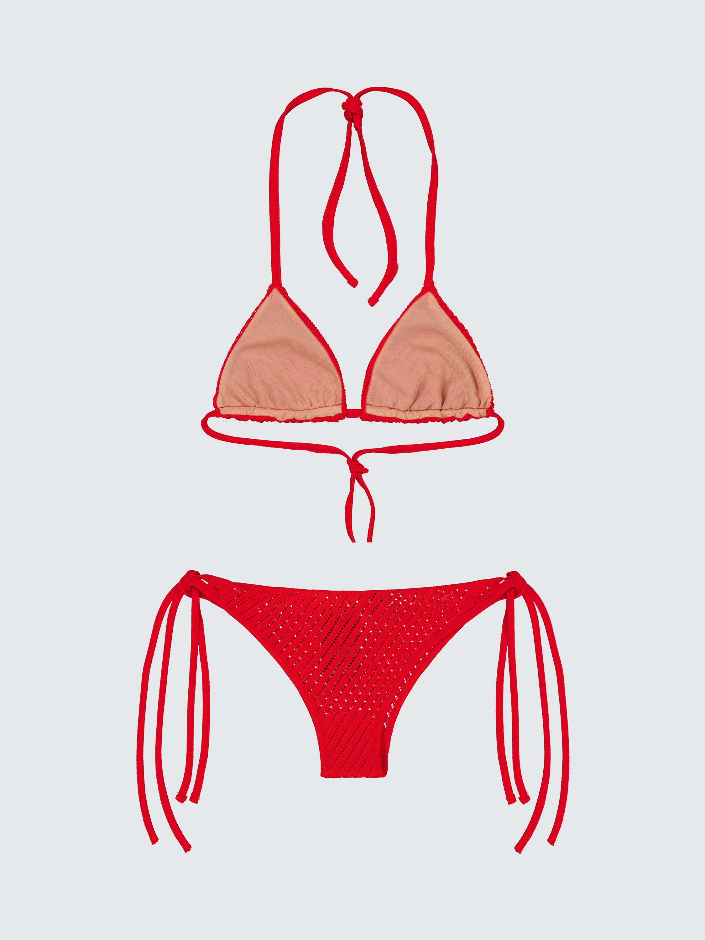 Questo bikini di Laneus è un modello che rievoca subito il mare, realizzato in maglia con una lavorazione traforata diagonale presenta il triangolo con un fiocco al collo abbinato a uno slip con lacetti regolabili.