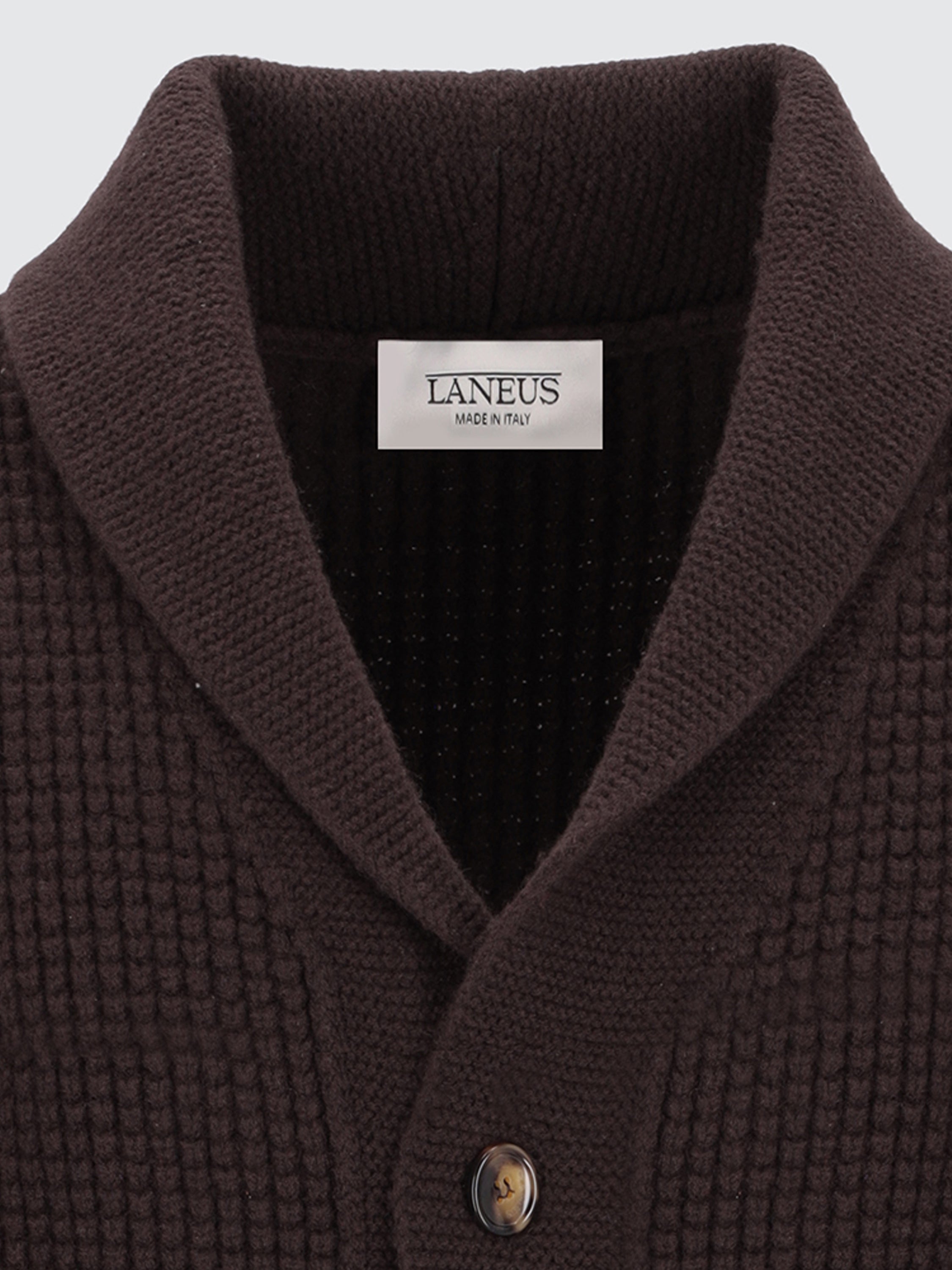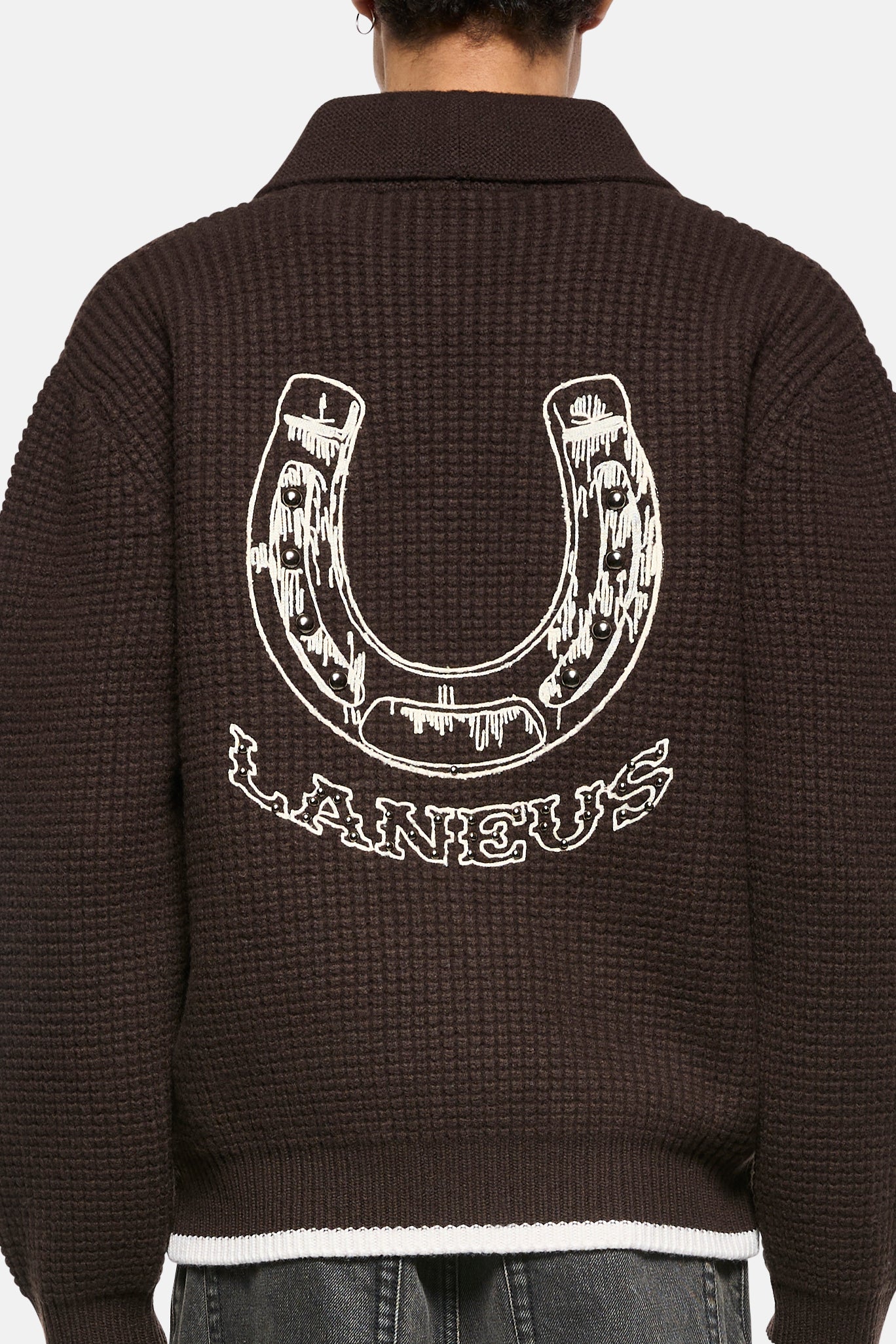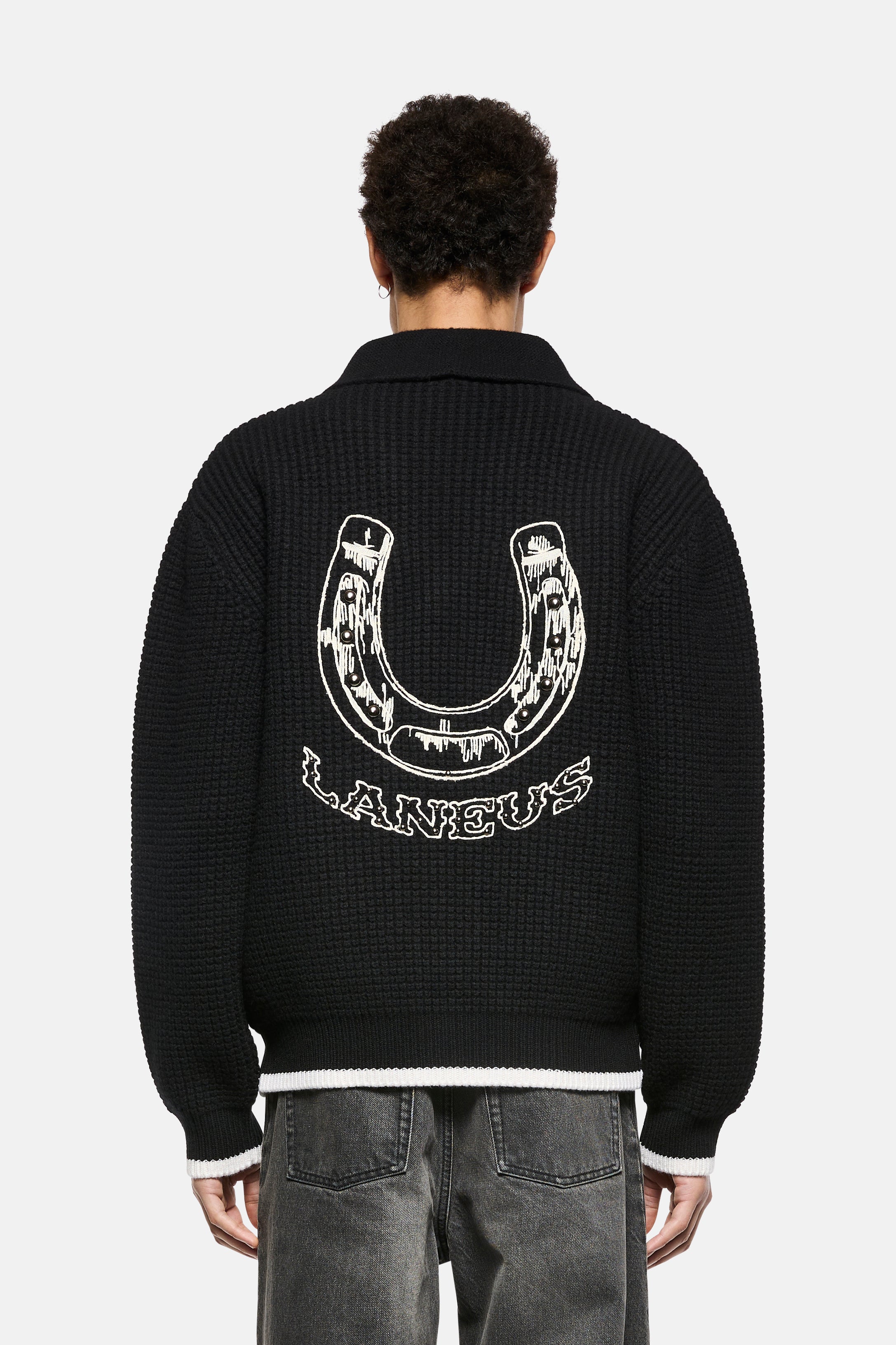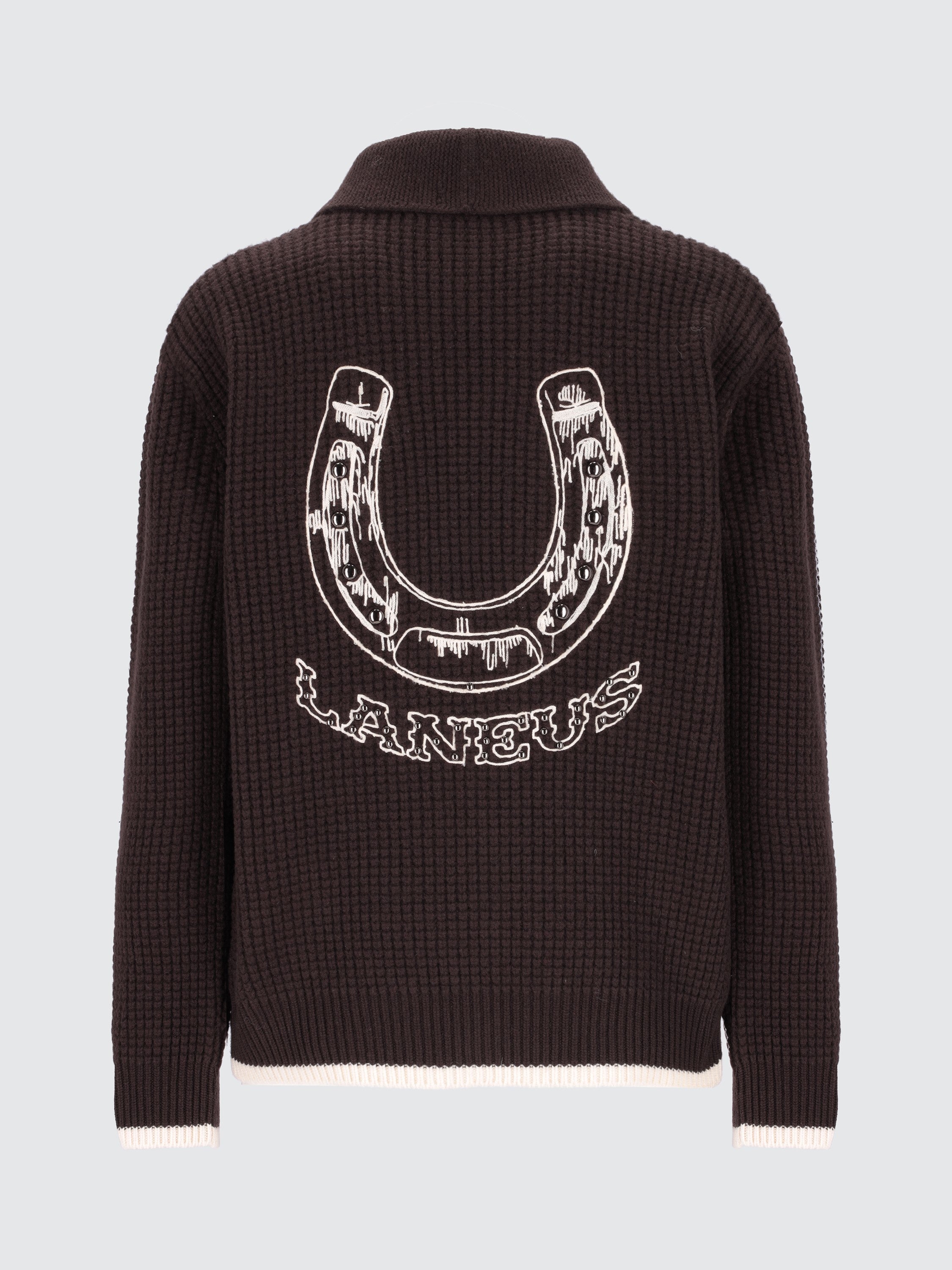 Questo bomber firmato Laneus è realizzato in 100% lana Merinos Supergeelong, lavorata in un compatto punto waffle che dona struttura e profondità al capo. La vestibilità è regular e il design è impreziosito da un collo sciallato, chiusura frontale con bottoni, due tasche a letto sul davanti e bordi a contrasto, che aggiungono un tocco grafico al look. Il retro è decorato con un ricamo materico raffigurante un ferro di cavallo, arricchito da borchie, per un’estetica decisa e contemporanea, in perfetta linea con lo stile distintivo di Laneus. Made in Italy.
