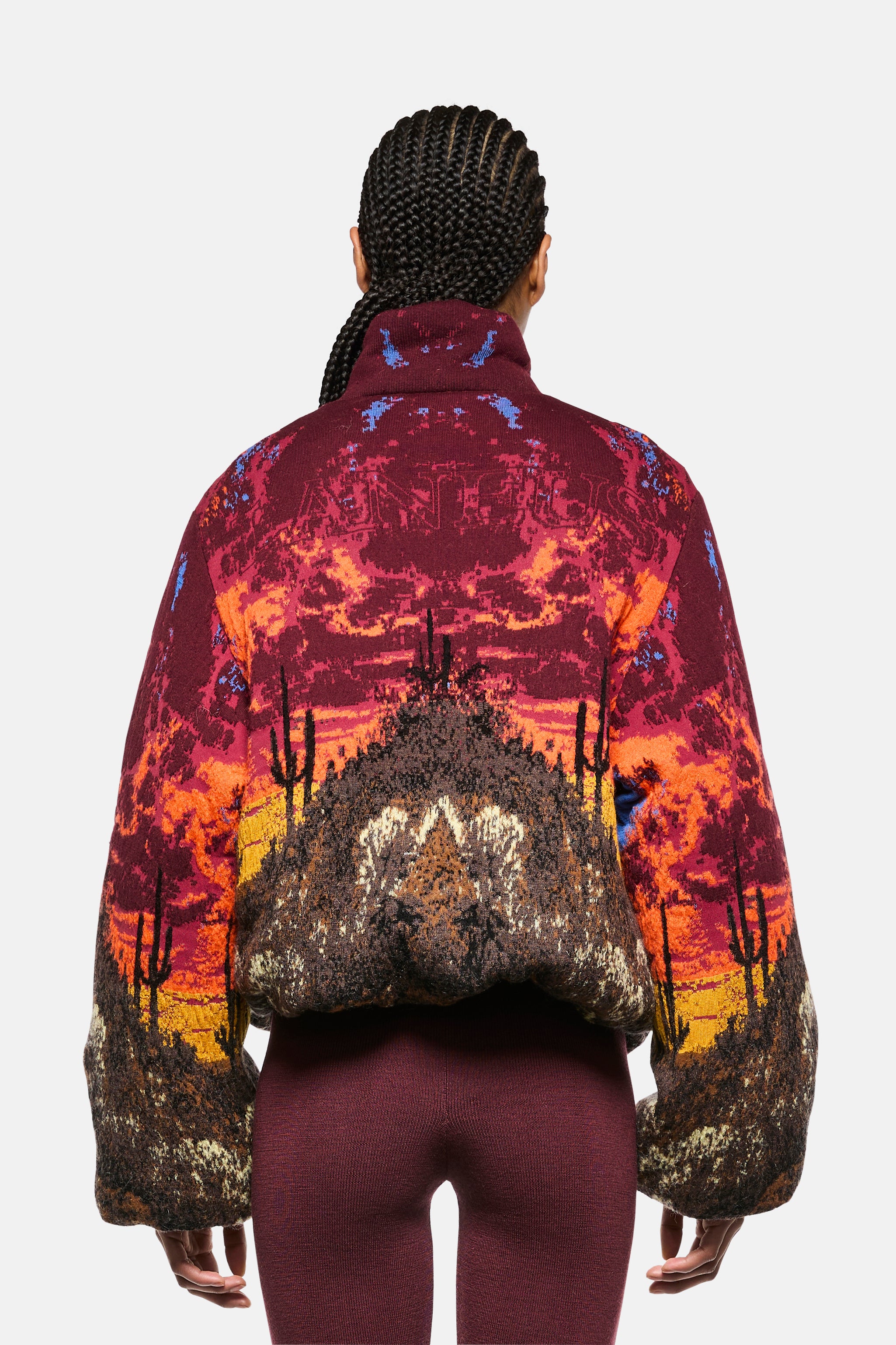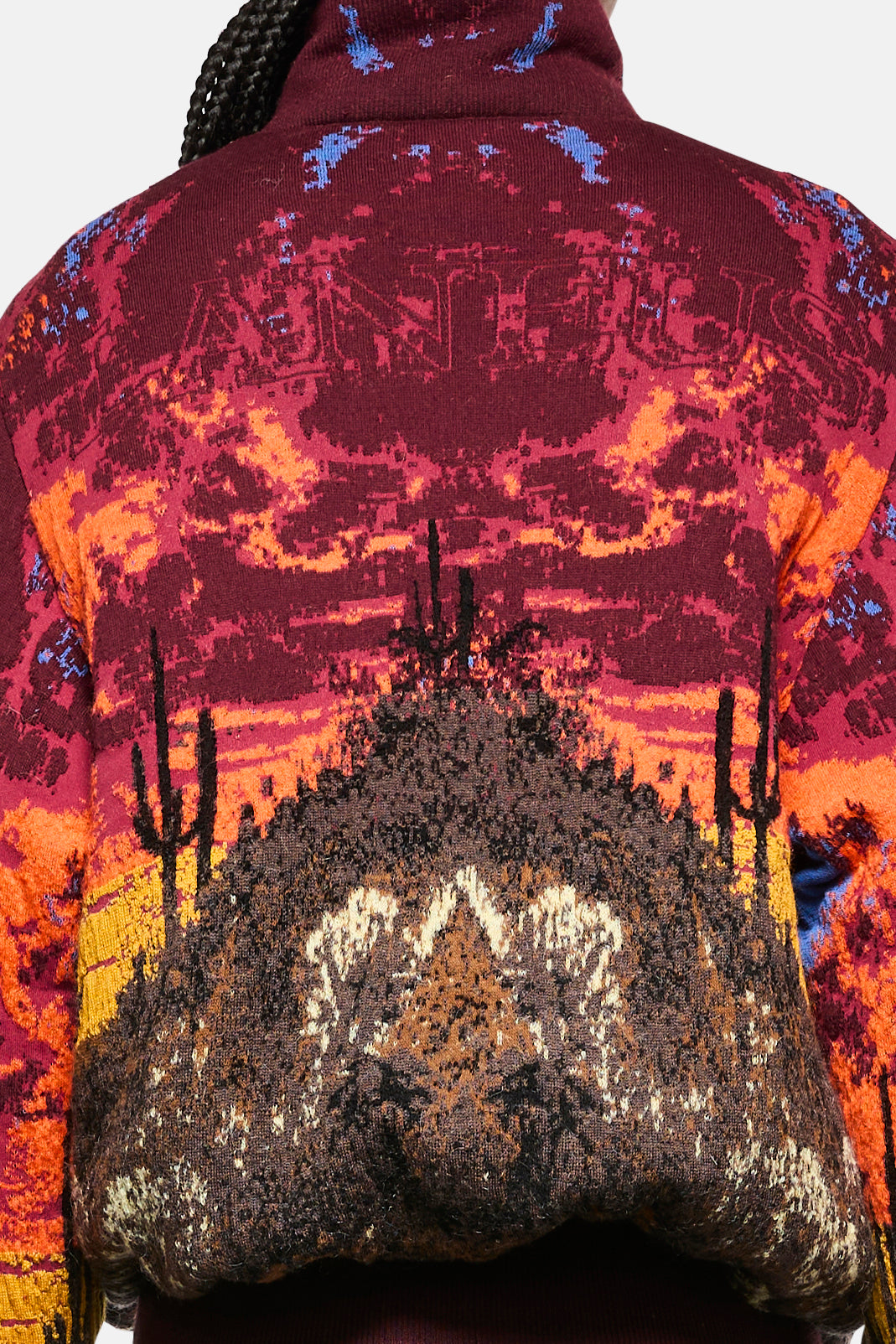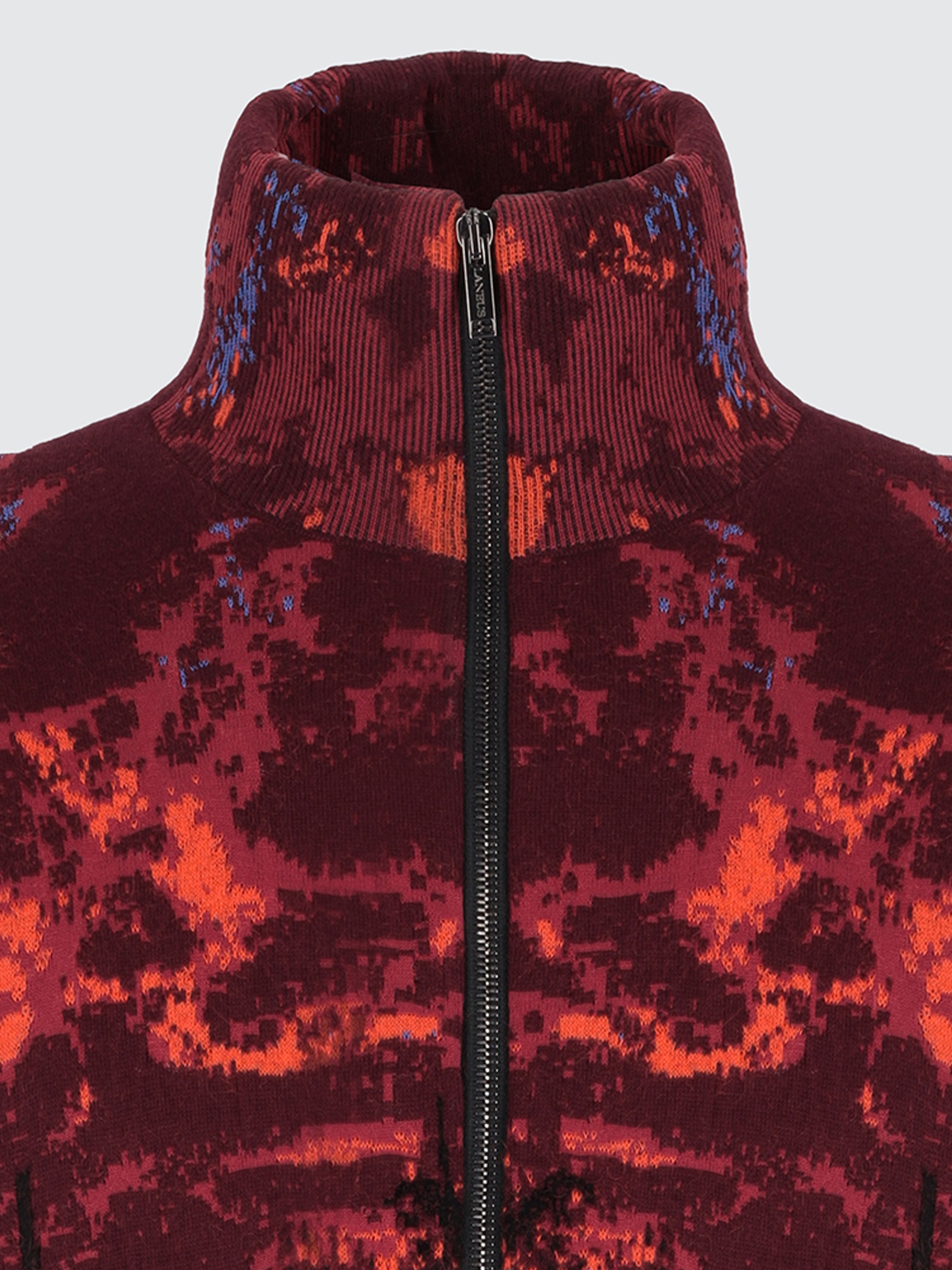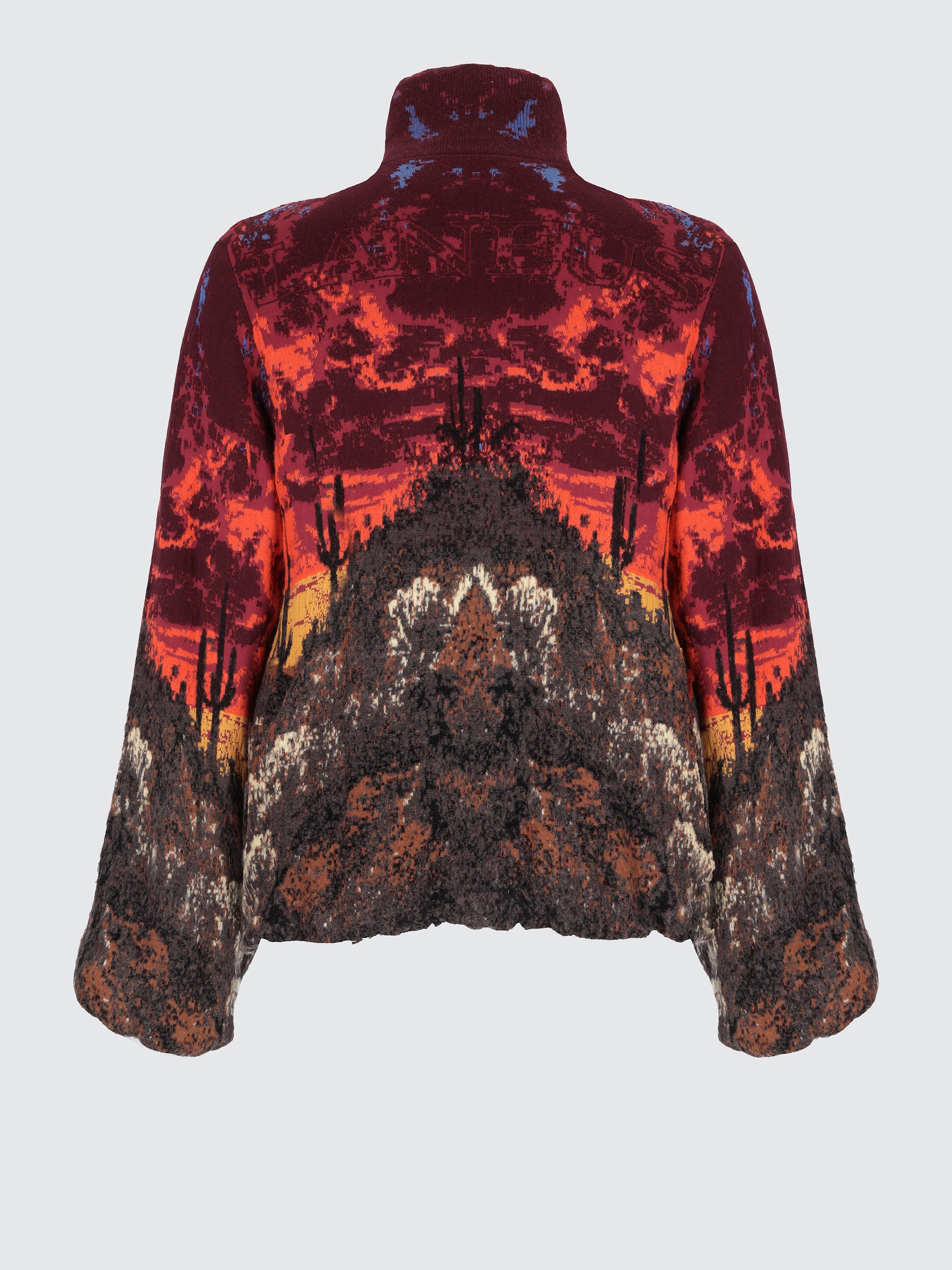 Un capospalla che unisce calore e impatto visivo. Questa giacca imbottita è realizzata in un mix di filati lisci e pelosi con disegno jacquard a 8 colori, per un effetto grafico tridimensionale e vibrante. La palette intensa e il pattern panoramico creano un look statement, mentre l’imbottitura dona volume discreto al capo. Un outerwear distintivo firmato Laneus. Made in Italy.