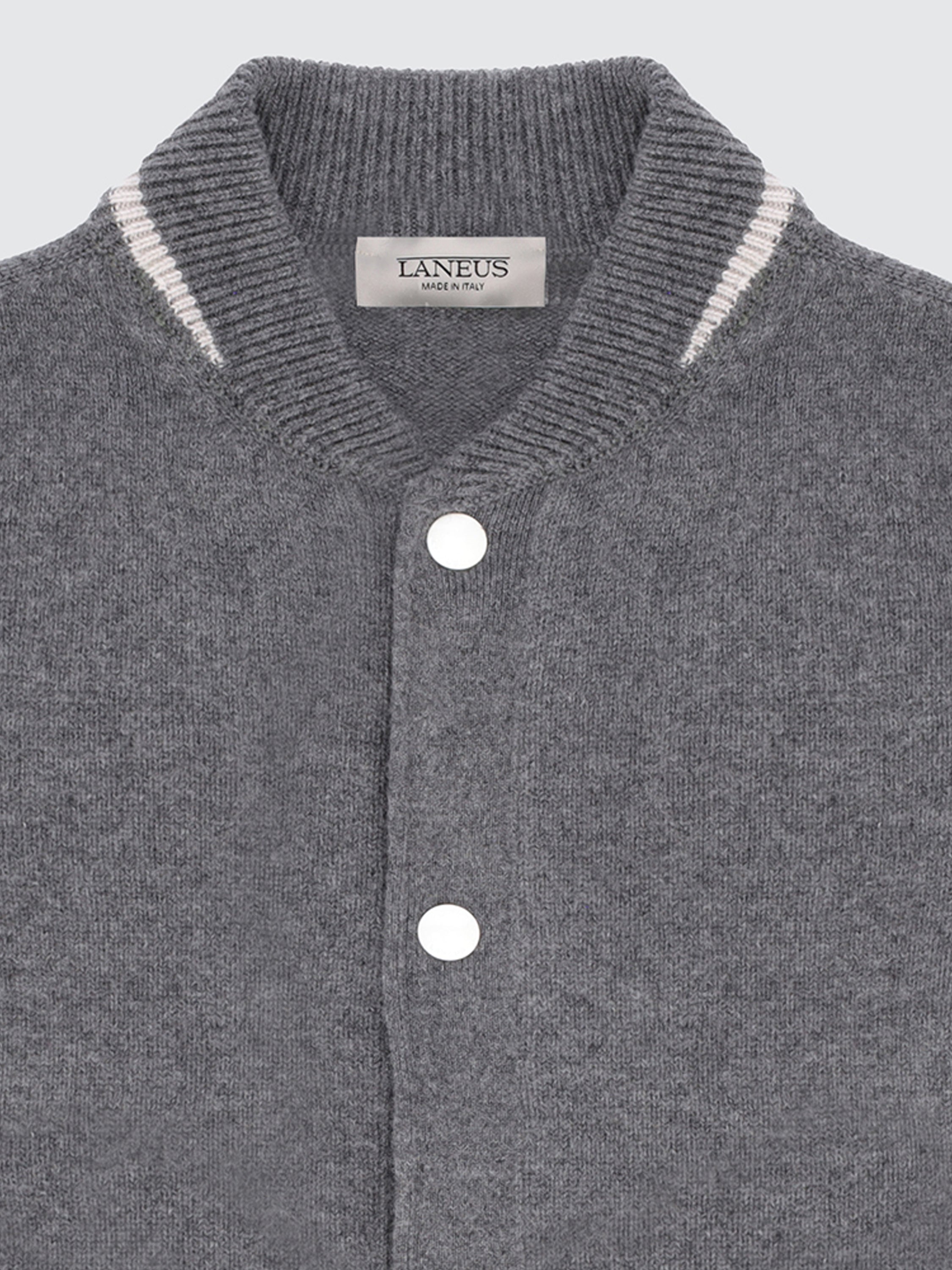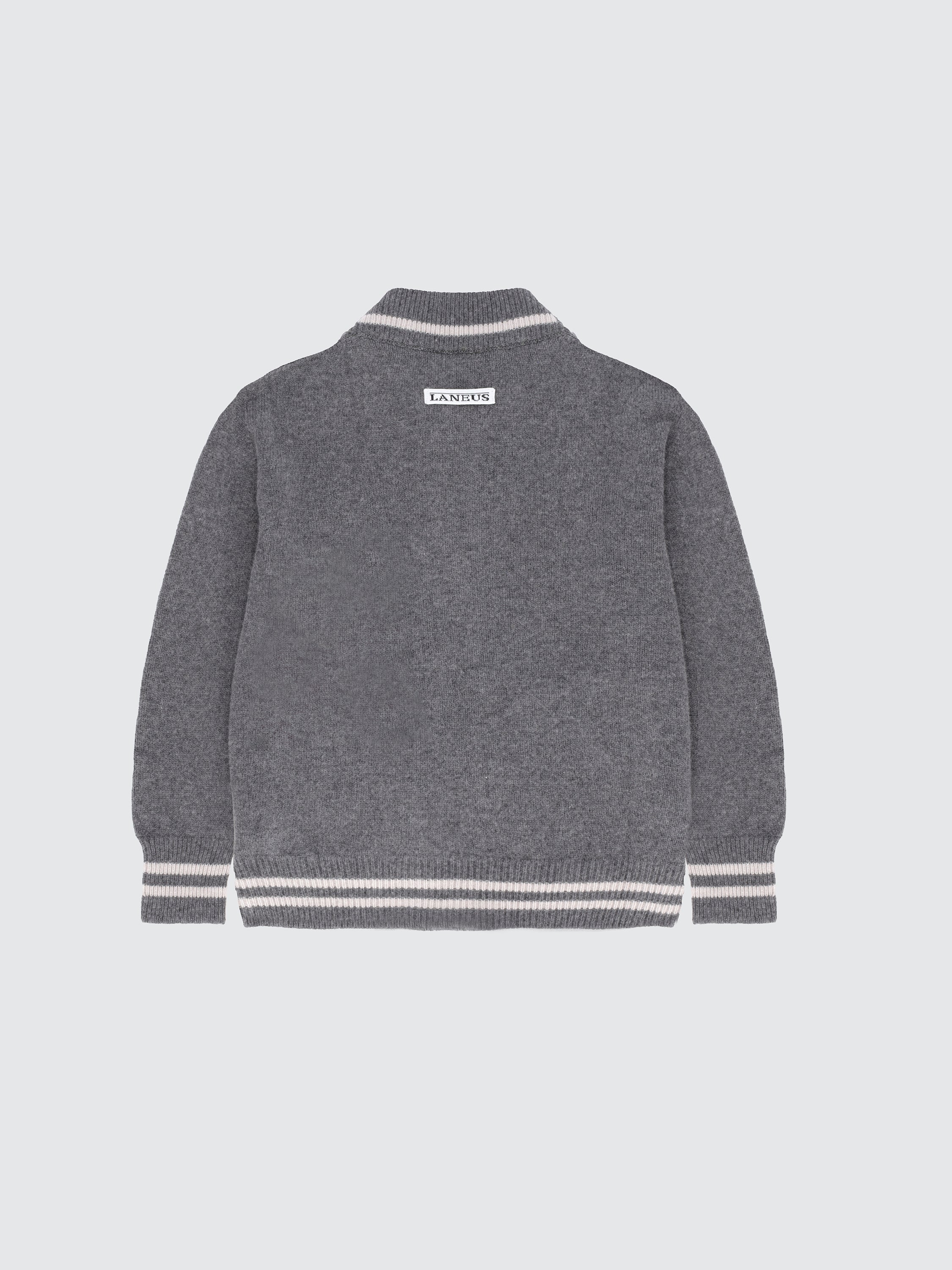 Bomber in maglia per bambino/a firmato Laneus, realizzato in un pregiato mix di lana merino extrafine, seta e cashmere. Caratterizzato da chiusura frontale con bottoni a pressione, fondo e polsini a costine con righe a contrasto e tasche laterali a filetto. Il suo design iconico stile varsity si arricchisce di dettagli raffinati per un look contemporaneo e versatile.
