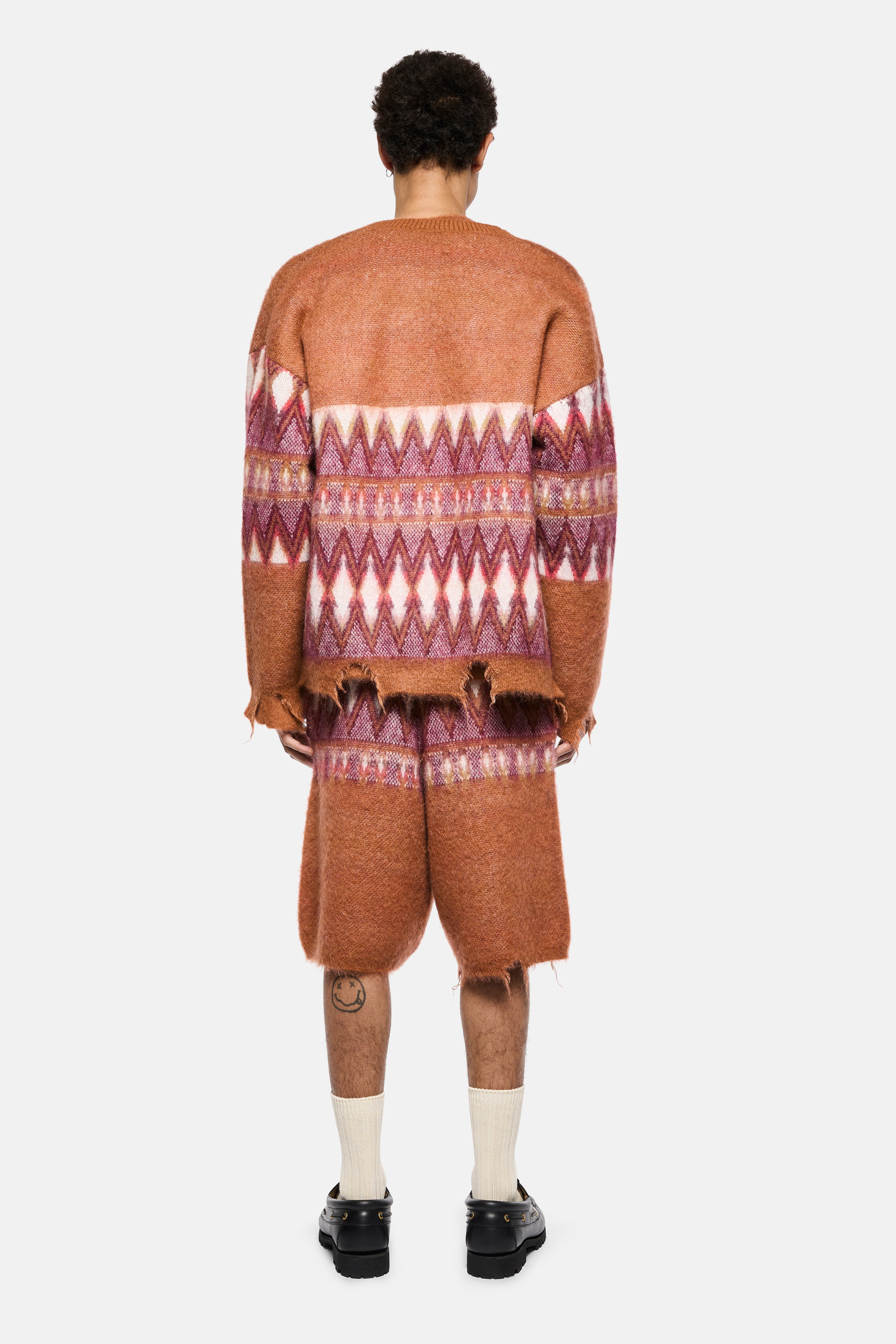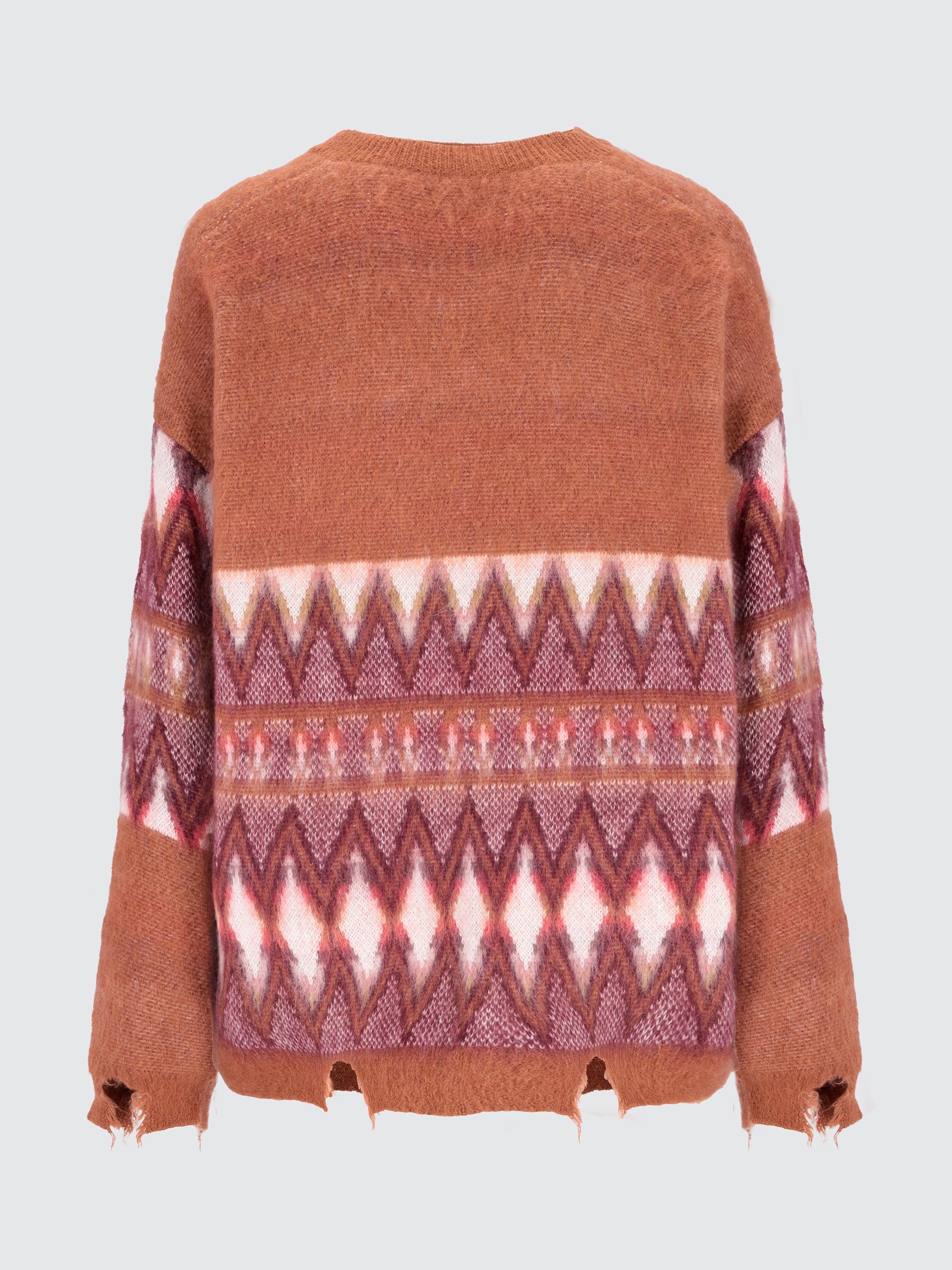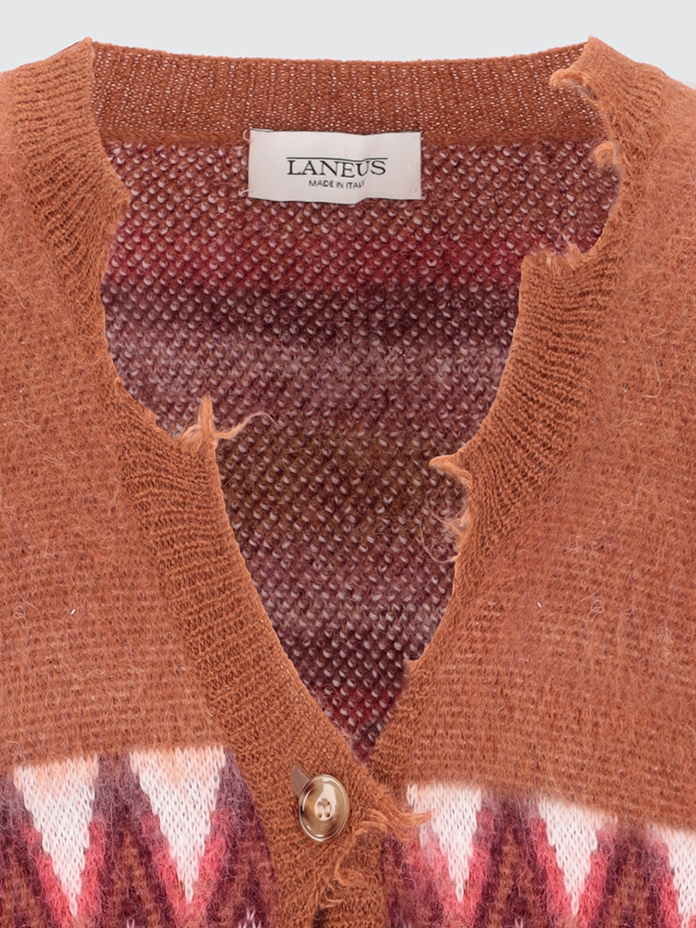 Cardigan in maglia firmato Laneus, realizzato in un blend soffice di mohair, lana e fibre tecniche. Il design presenta una lavorazione jacquard ed effetto destroyed. Le rotture distribuite su fondo, maniche e chiusura conferiscono al capo un'estetica vissuta e materica. La vestibilità è regular, con chiusura frontale a bottoni. Made in Italy.