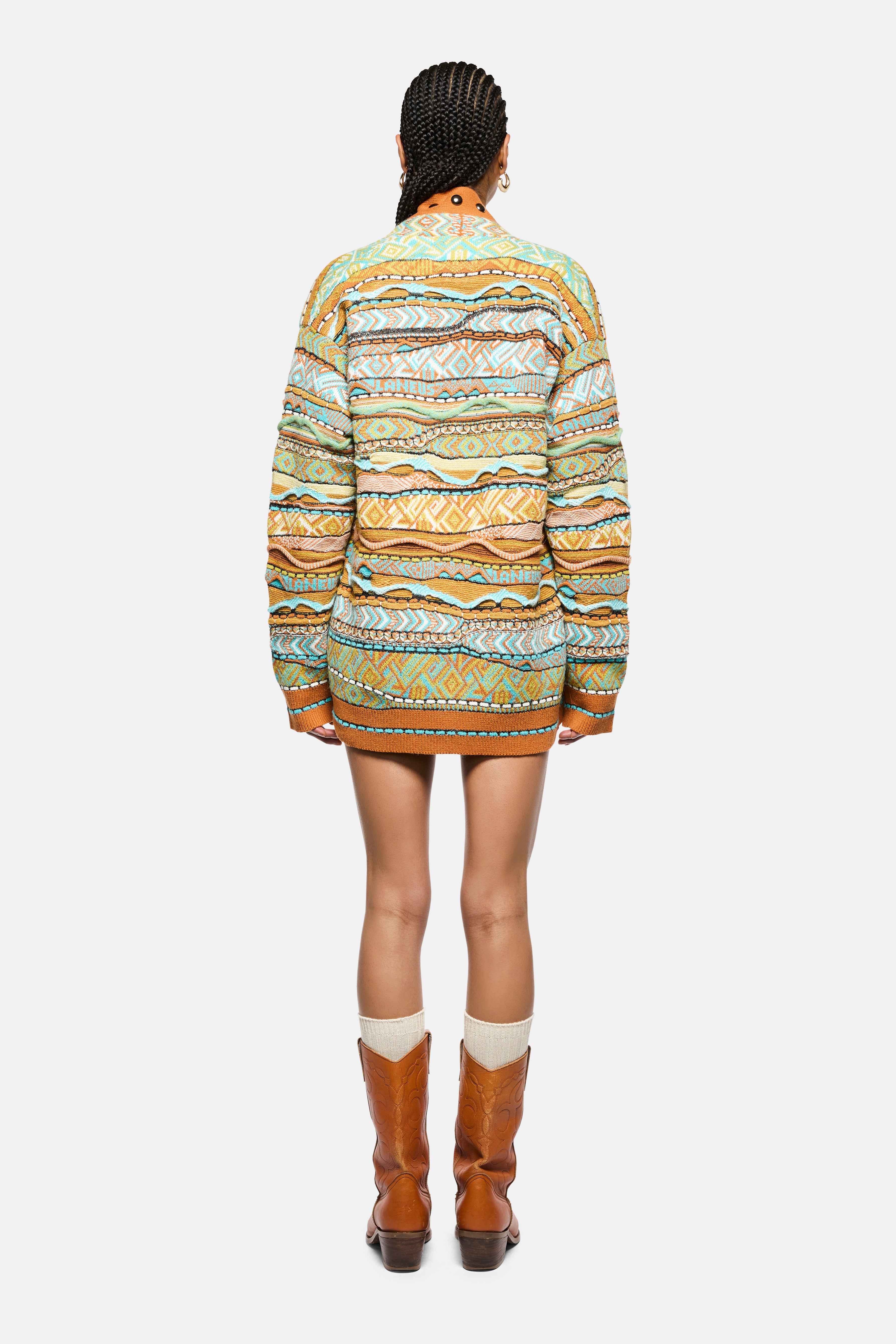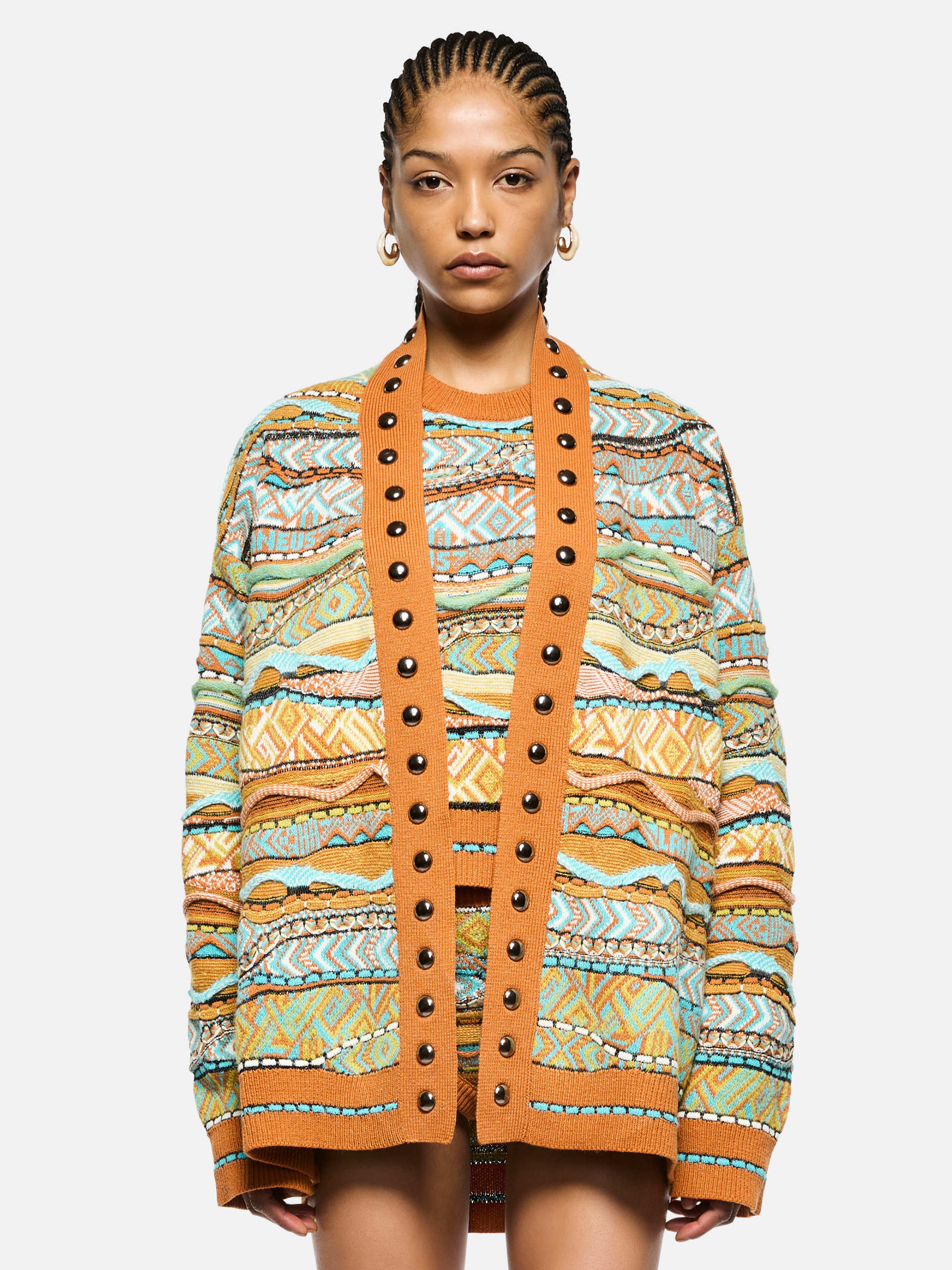 Estetica bold e spirito contemporaneo. Questo cardigan over in jacquard è impreziosito da borchie lungo l’apertura frontale per un contrasto deciso ma sofisticato. Il motivo "LA." iconico Laneus è stato reinterpretato con un nuovo disegno e palette colori esclusiva di collezione, con logatura integrata all’interno del pattern. Realizzato in un mix di filati morbidi e strutturati, unisce volume, texture e carattere in un unico pezzo statement. Made in Italy.