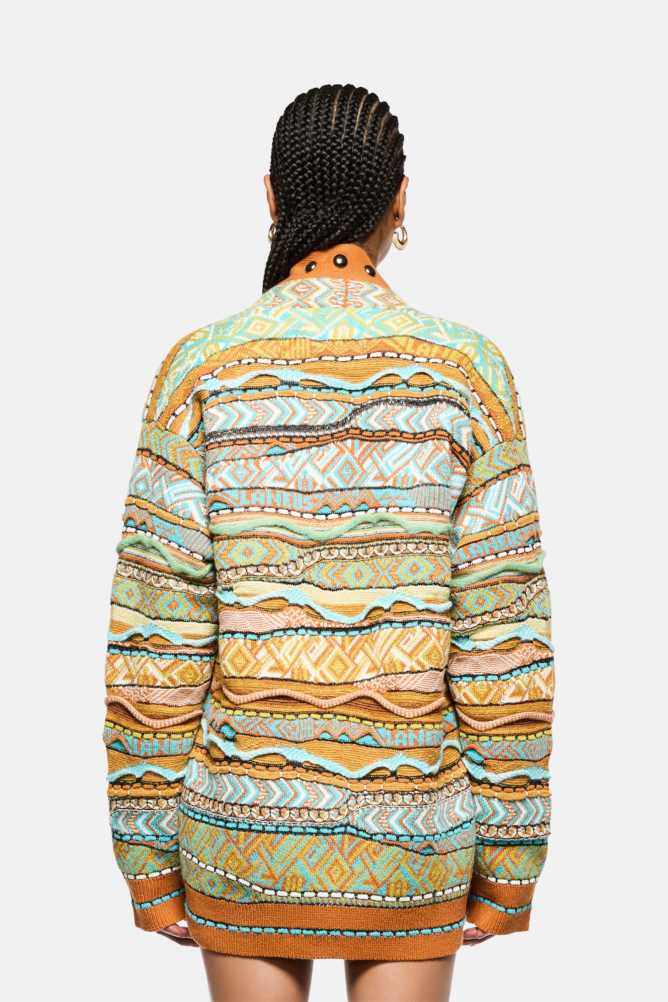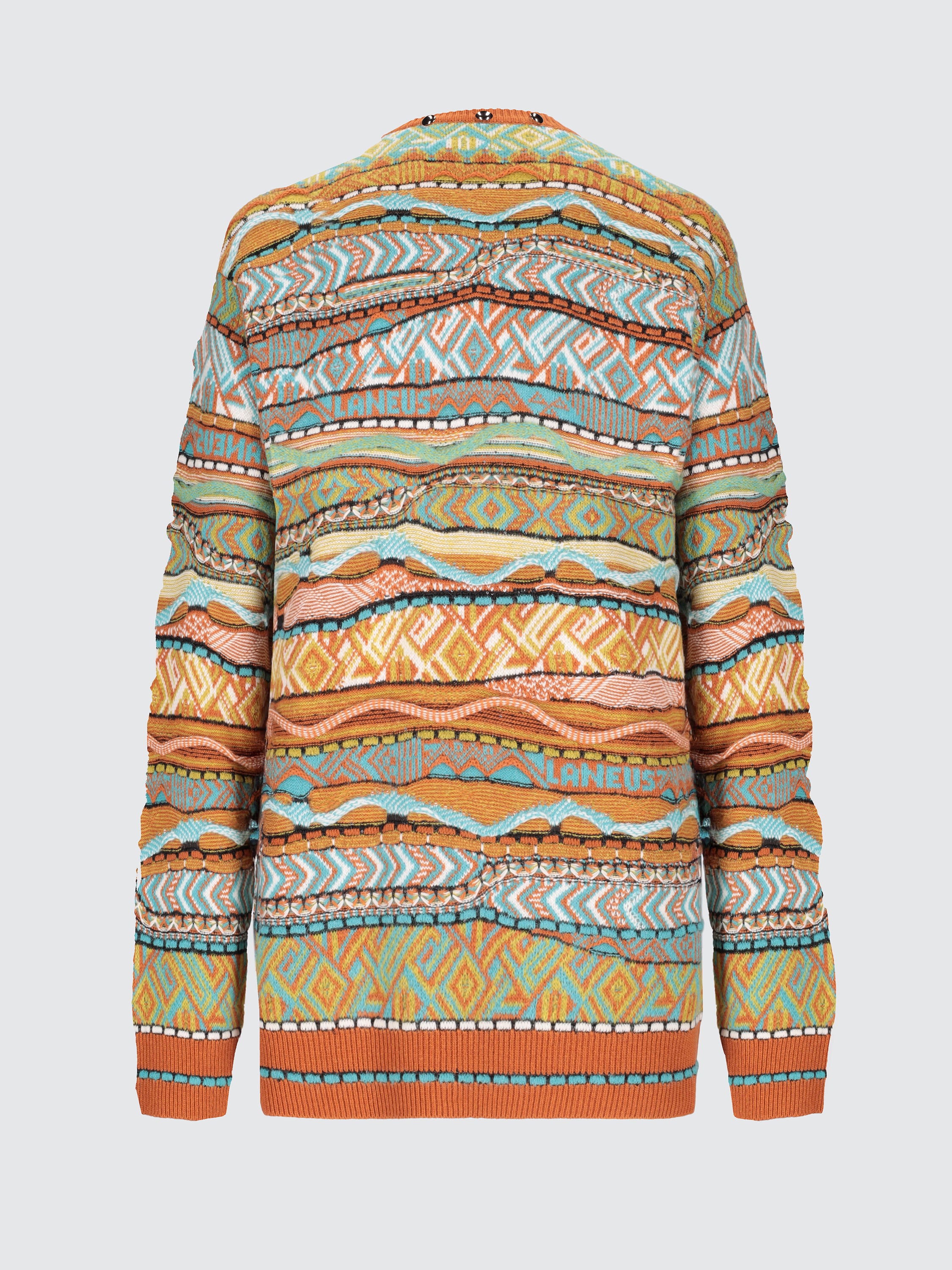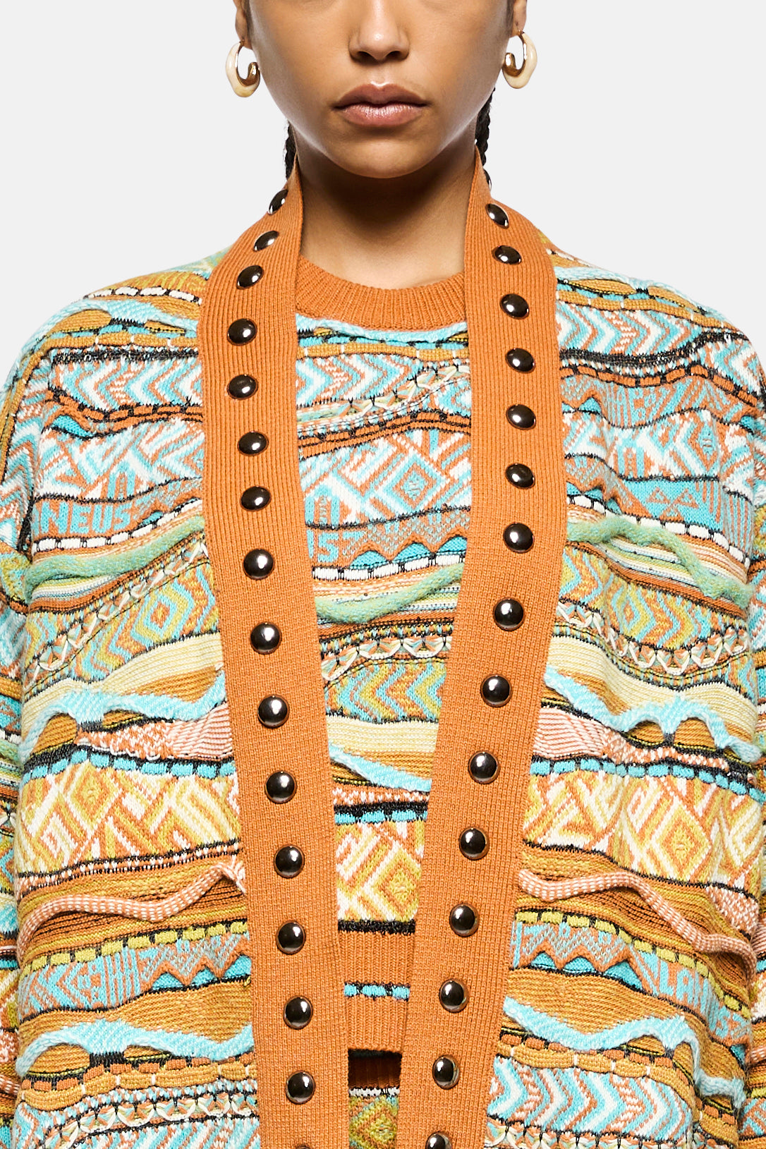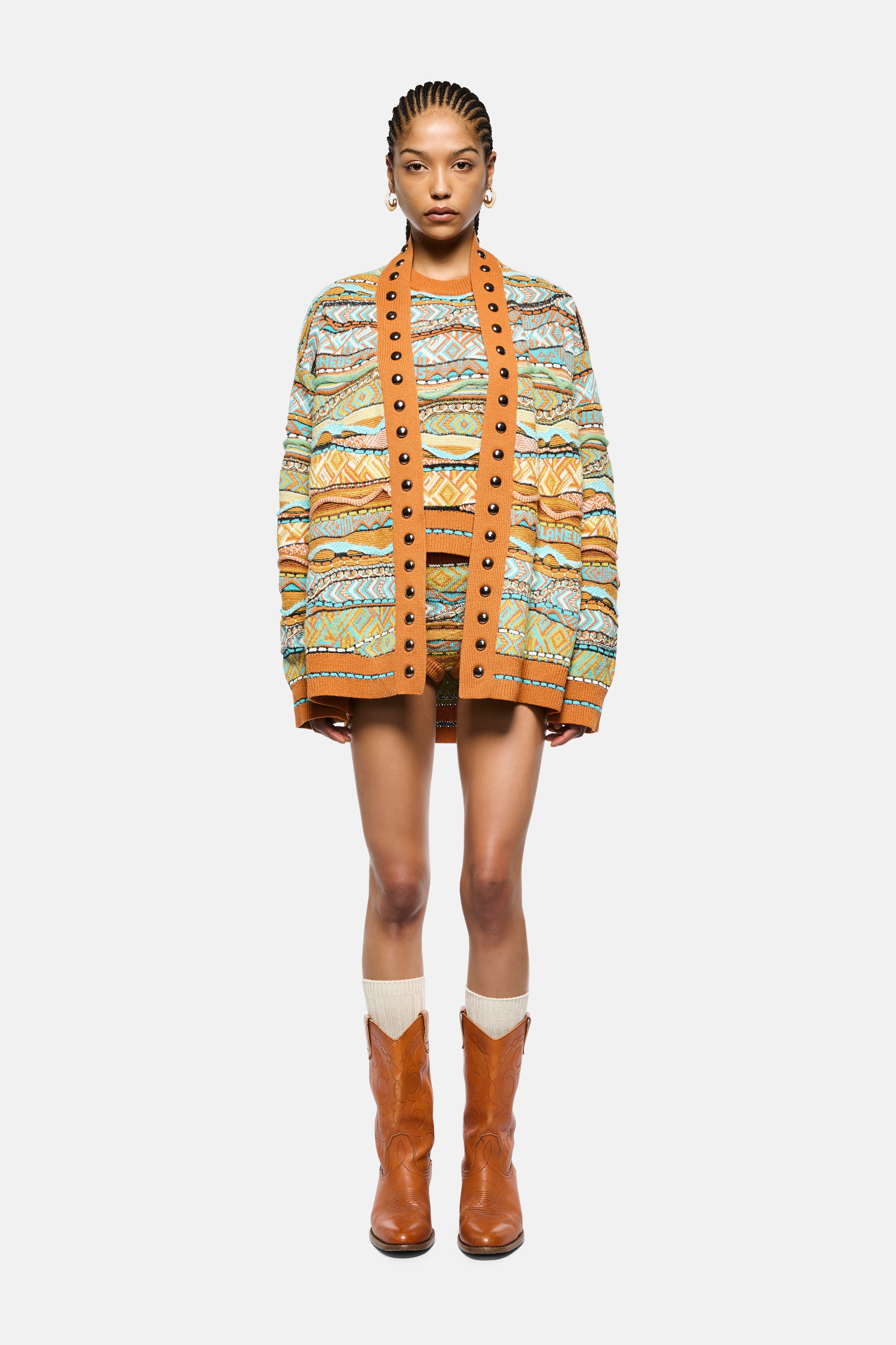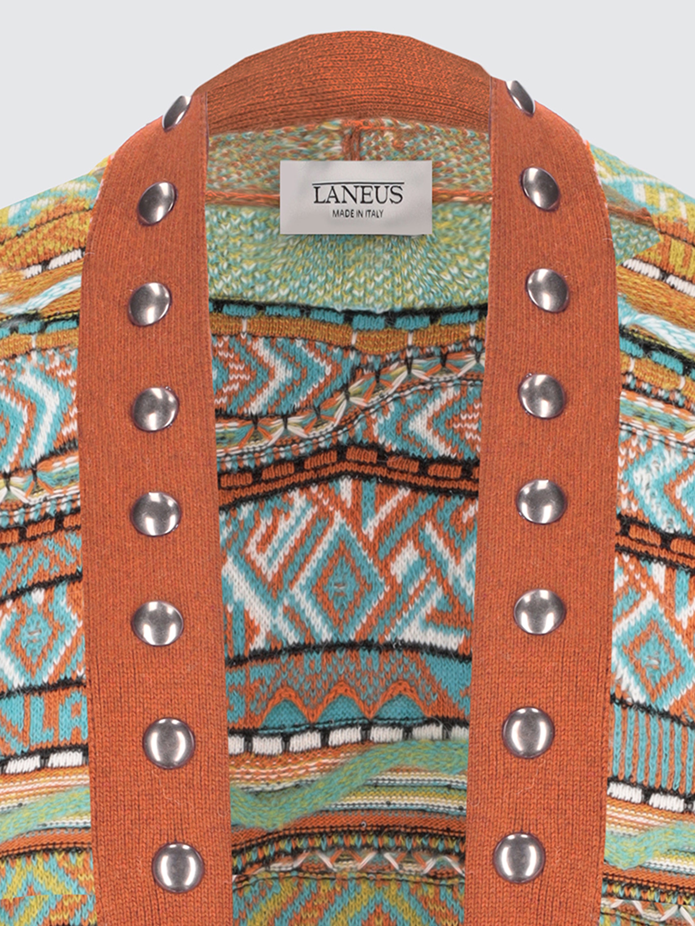 Estetica bold e spirito contemporaneo. Questo cardigan over in jacquard è impreziosito da borchie lungo l’apertura frontale per un contrasto deciso ma sofisticato. Il motivo "LA." iconico Laneus è stato reinterpretato con un nuovo disegno e palette colori esclusiva di collezione, con logatura integrata all’interno del pattern. Realizzato in un mix di filati morbidi e strutturati, unisce volume, texture e carattere in un unico pezzo statement. Made in Italy.