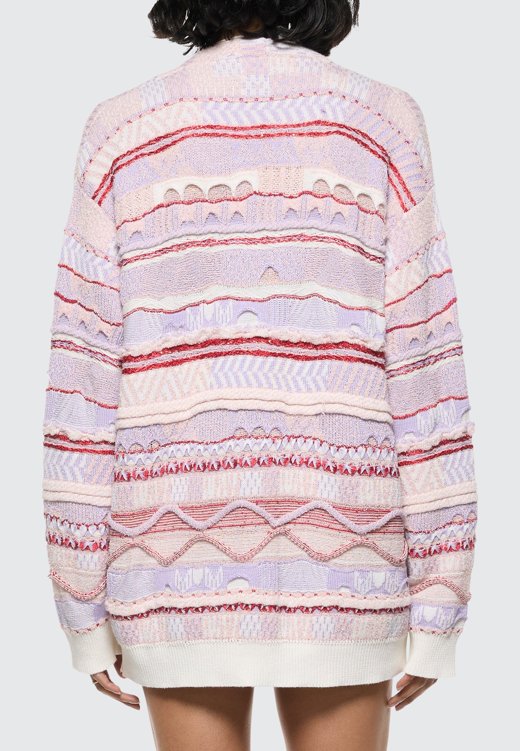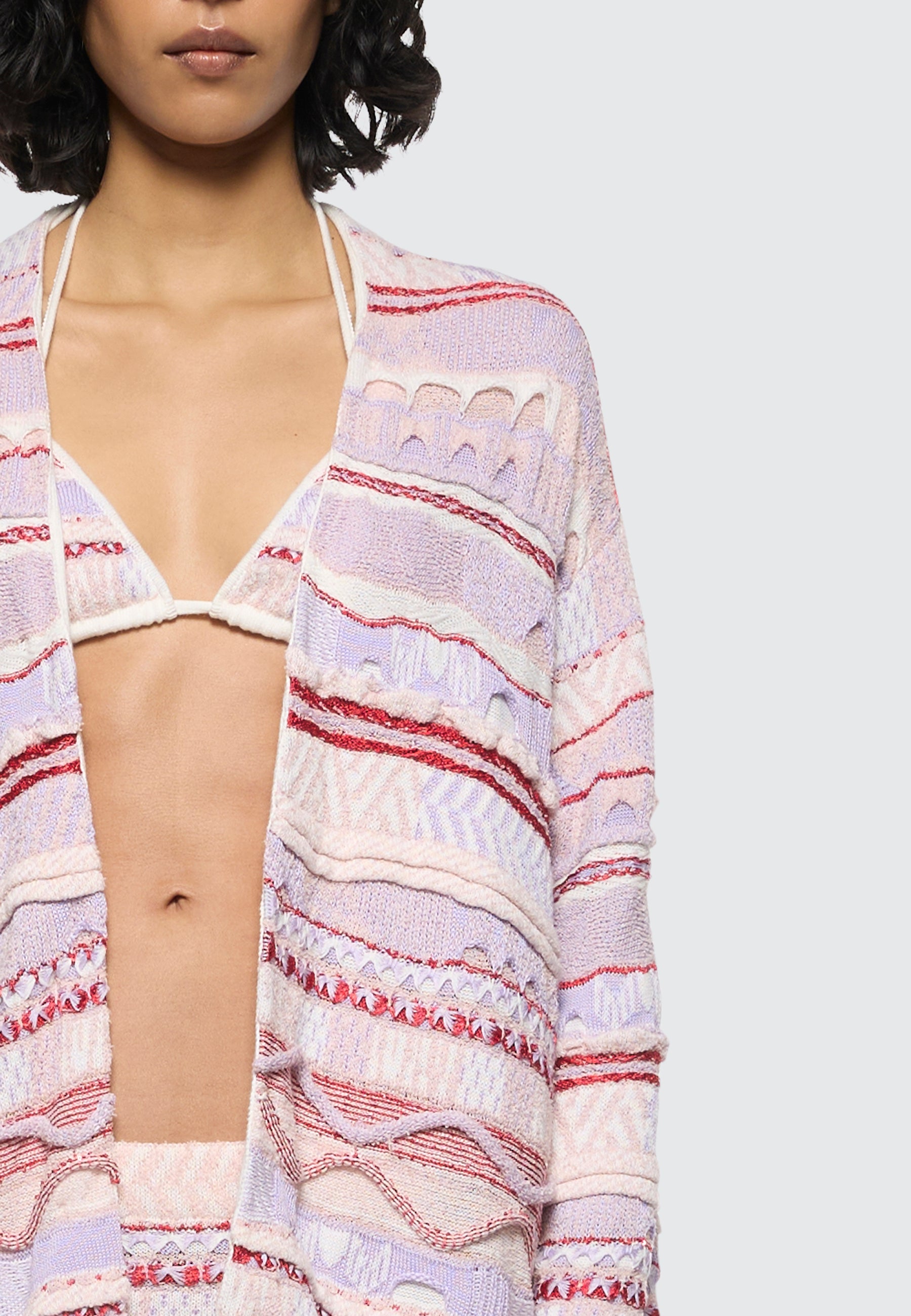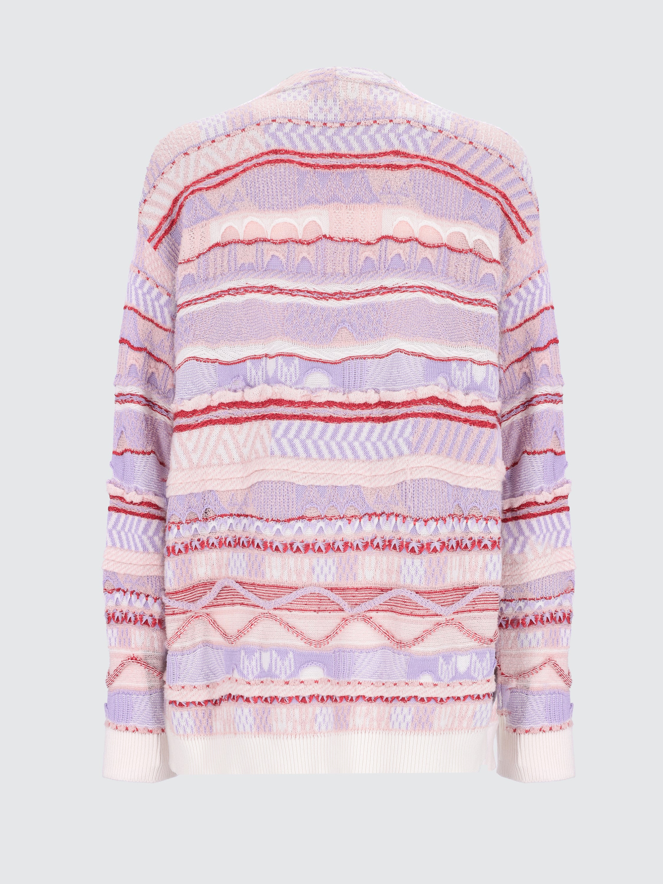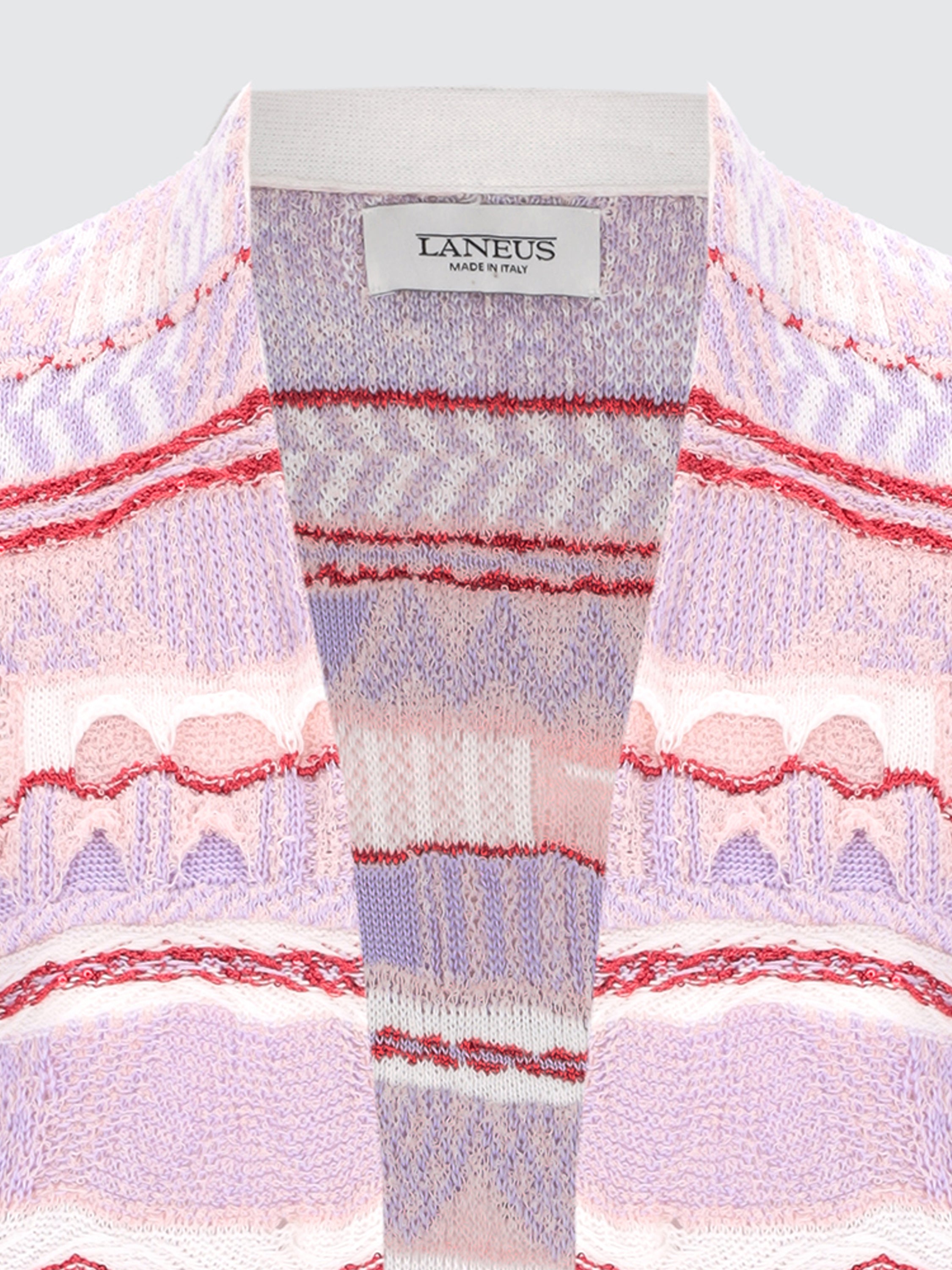 Questo cardigan di Laneus è realizzato in pregiato filato di cotone che sfoggia un iconico motivo jacquard multifilo. Presenta una silhouette boxy con chiusura frontale senza bottoni. Made in Italy. La modella è alta 180 cm ed indossa una 40/S.