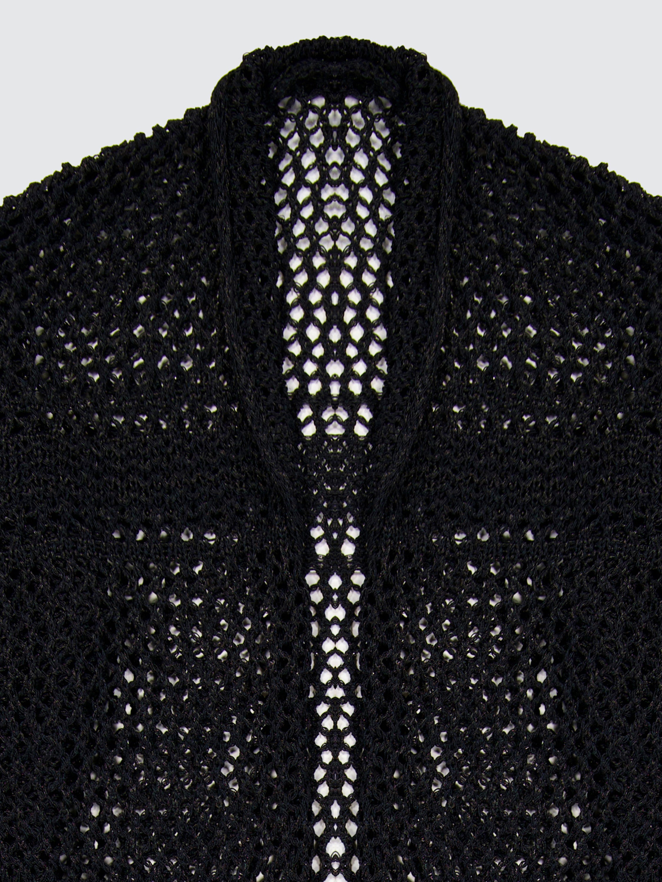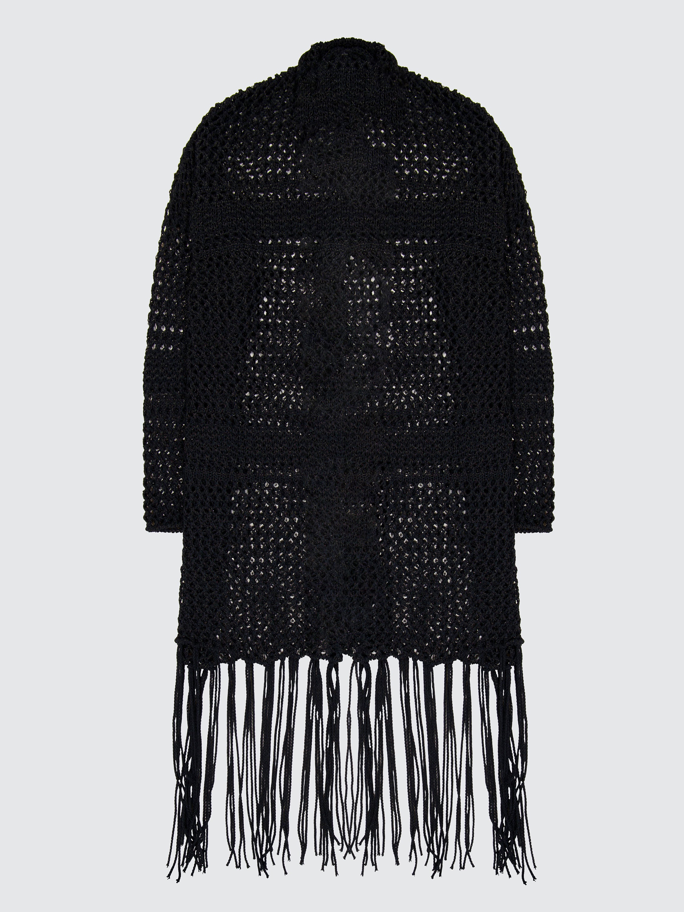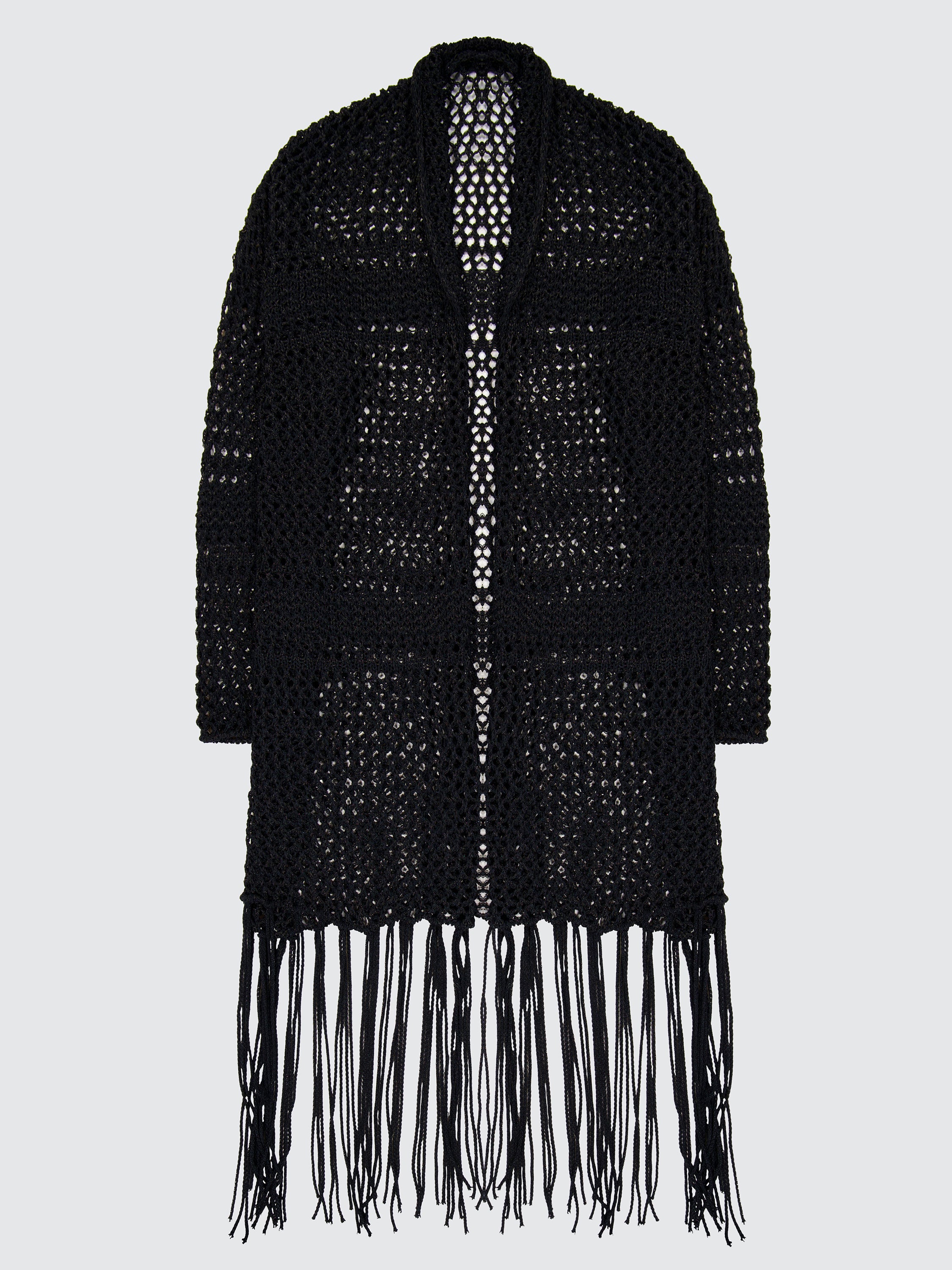 Questo cardigan di Laneus è realizzato in maglia caratterizzata da lavorazione in punto rete. Presenta una silhouette oversize con spalle scese e frange che profilano il fondo. Made in Italy. La modella è alta 180 cm ed indossa una 40/S.