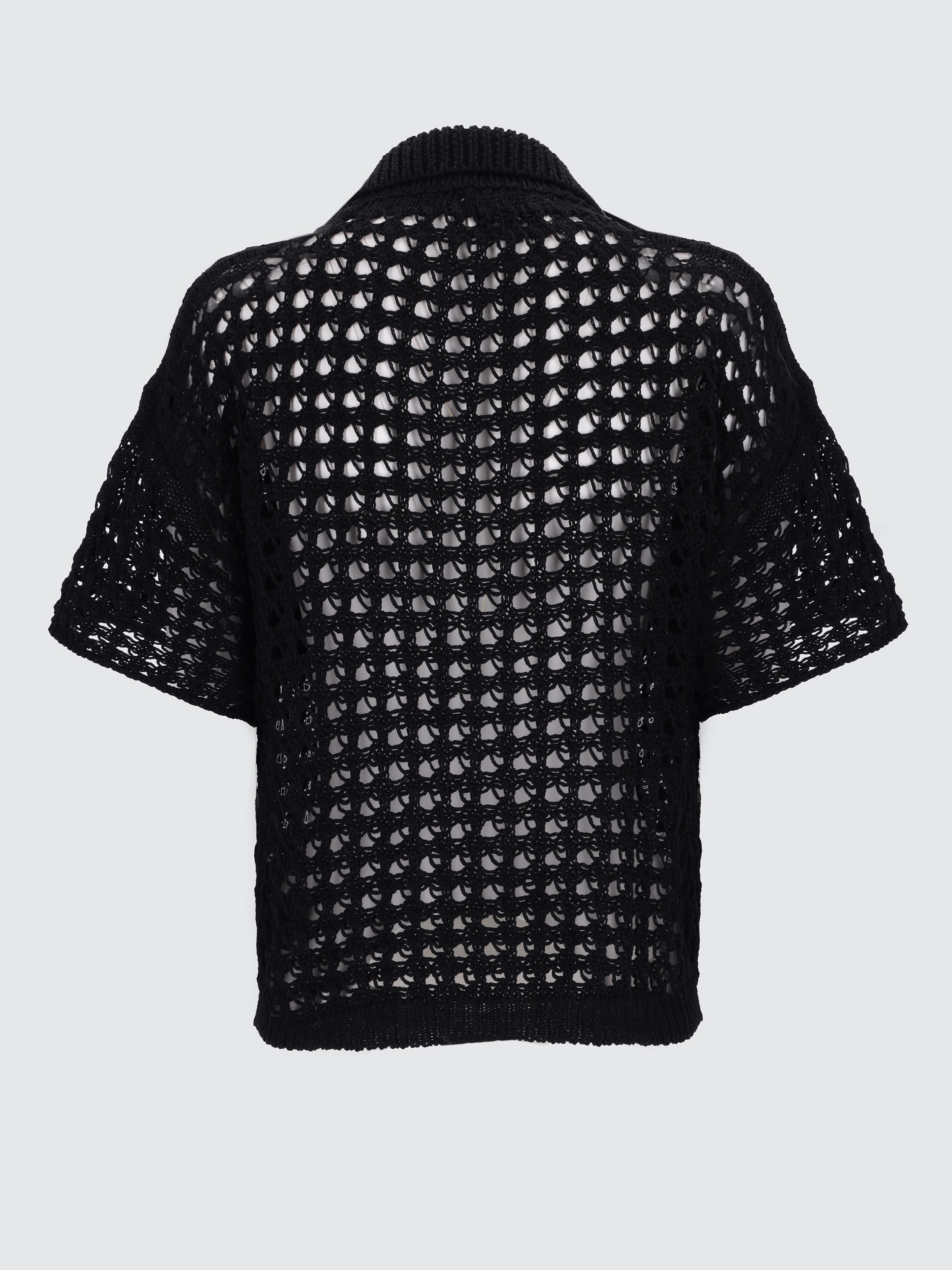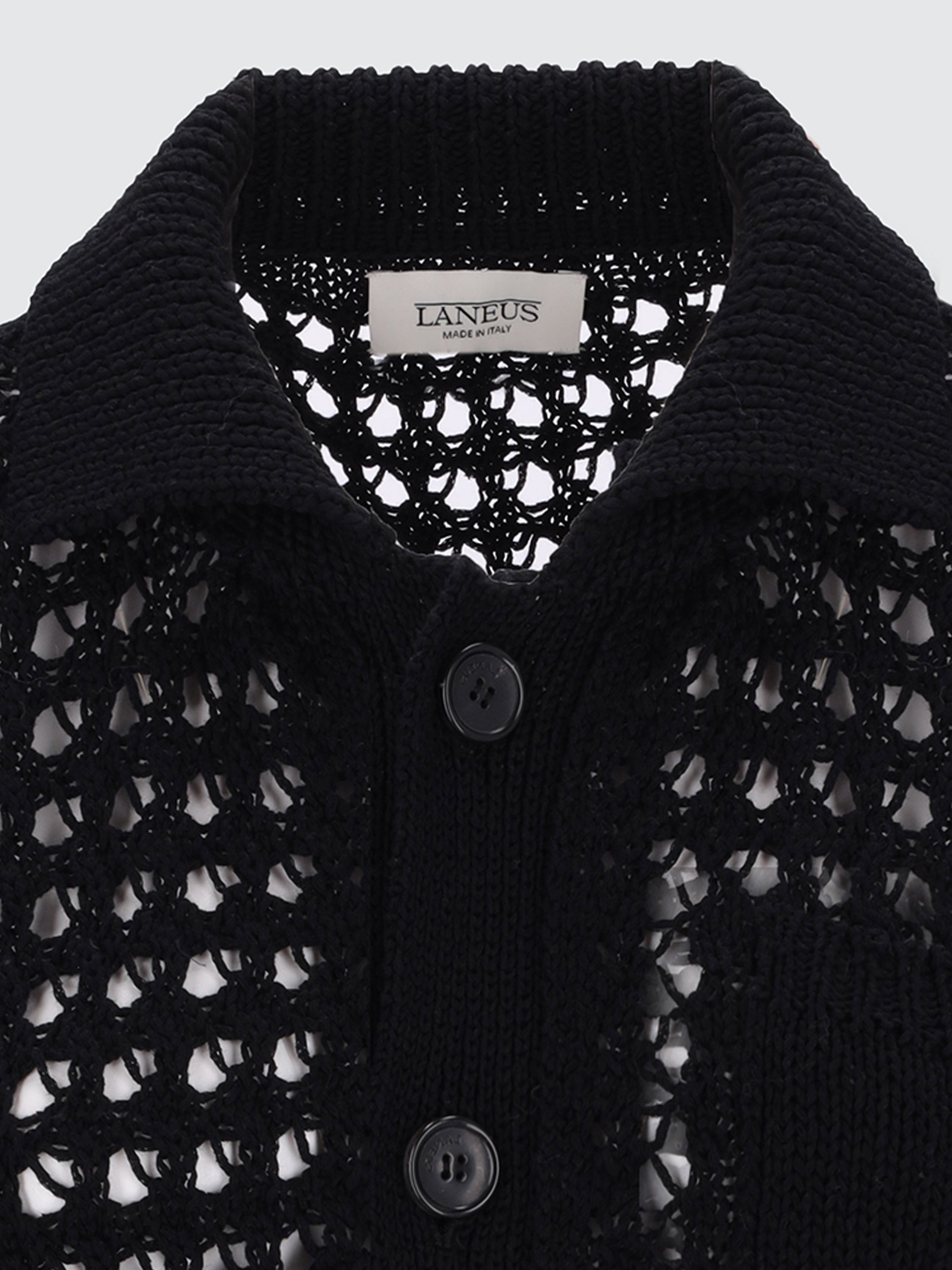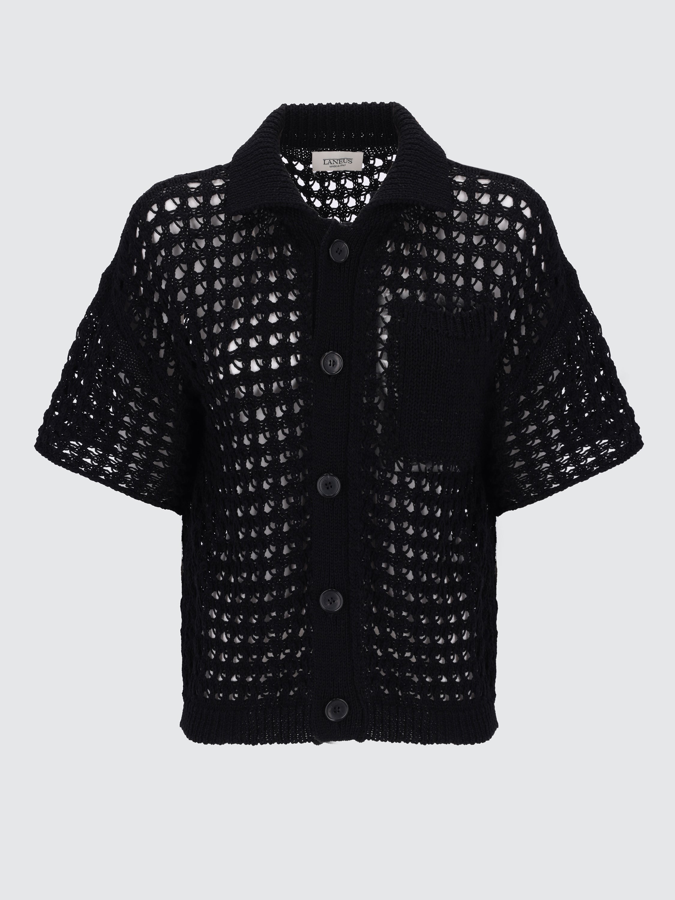 Realizzata nell’iconico stile Laneus, questa polo è realizzata con inconfondibile savoir-faire in un filato di cotone traforato e presenta una silhouette boxy con collo all'italiana e chiusura a 5 bottoni. La modella è alta 180 cm ed indossa una 40/S.