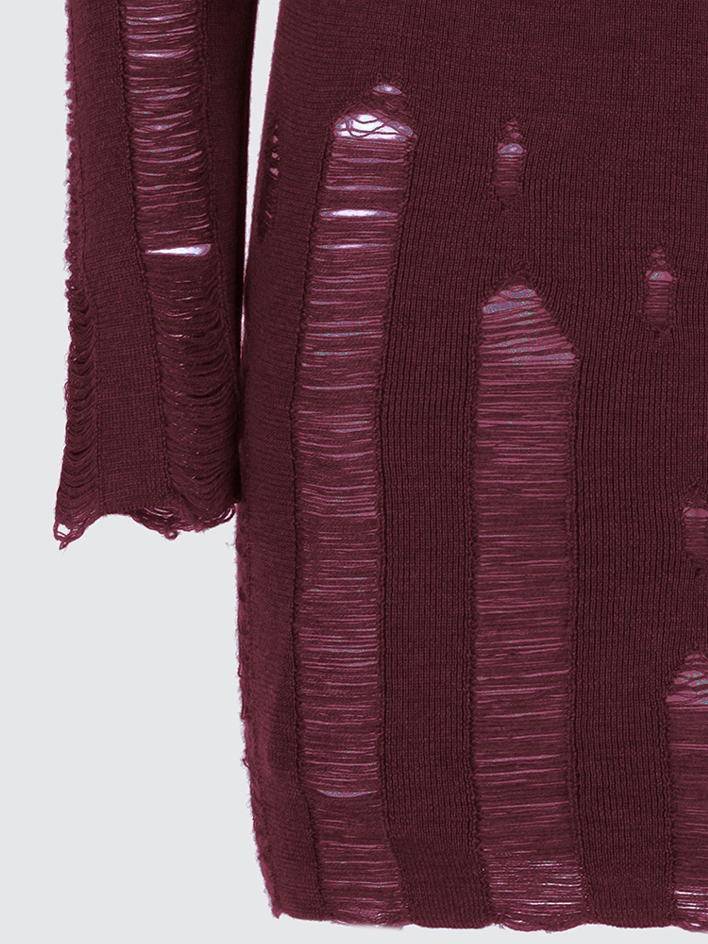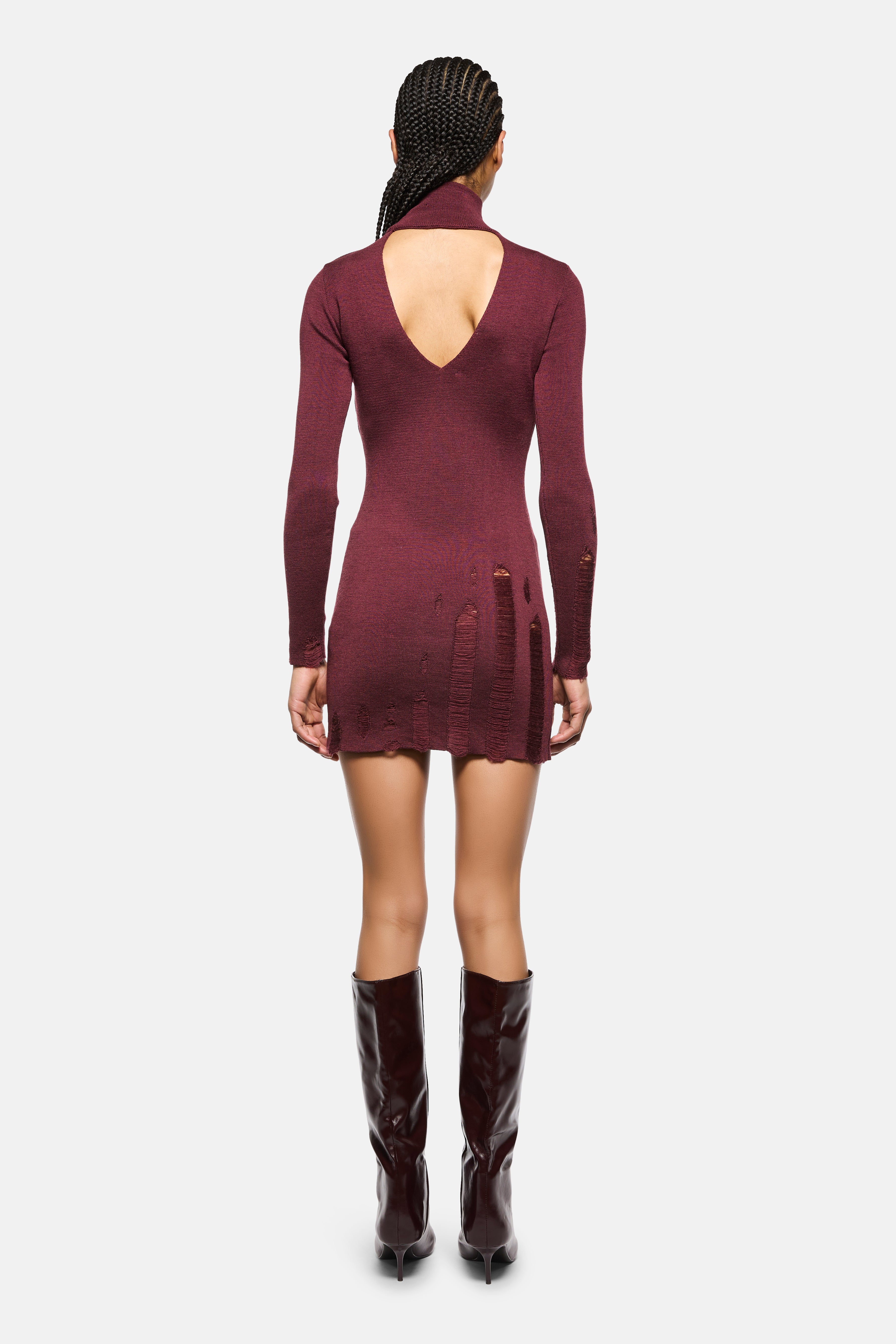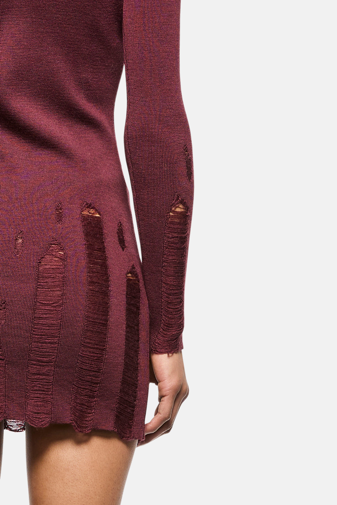Silhouette essenziale e spirito grintoso. Questo abito in maglia a costina extra sottile è realizzato in 100% lana merinos extrafine, con vestibilità attillata, collo alto e maniche lunghe. Gli effetti destroyed su fondo e maniche aggiungono un tocco raw a un design minimal e aderente. Un capo dal carattere deciso, perfetto da interpretare in chiave day-to-night. Made in Italy.