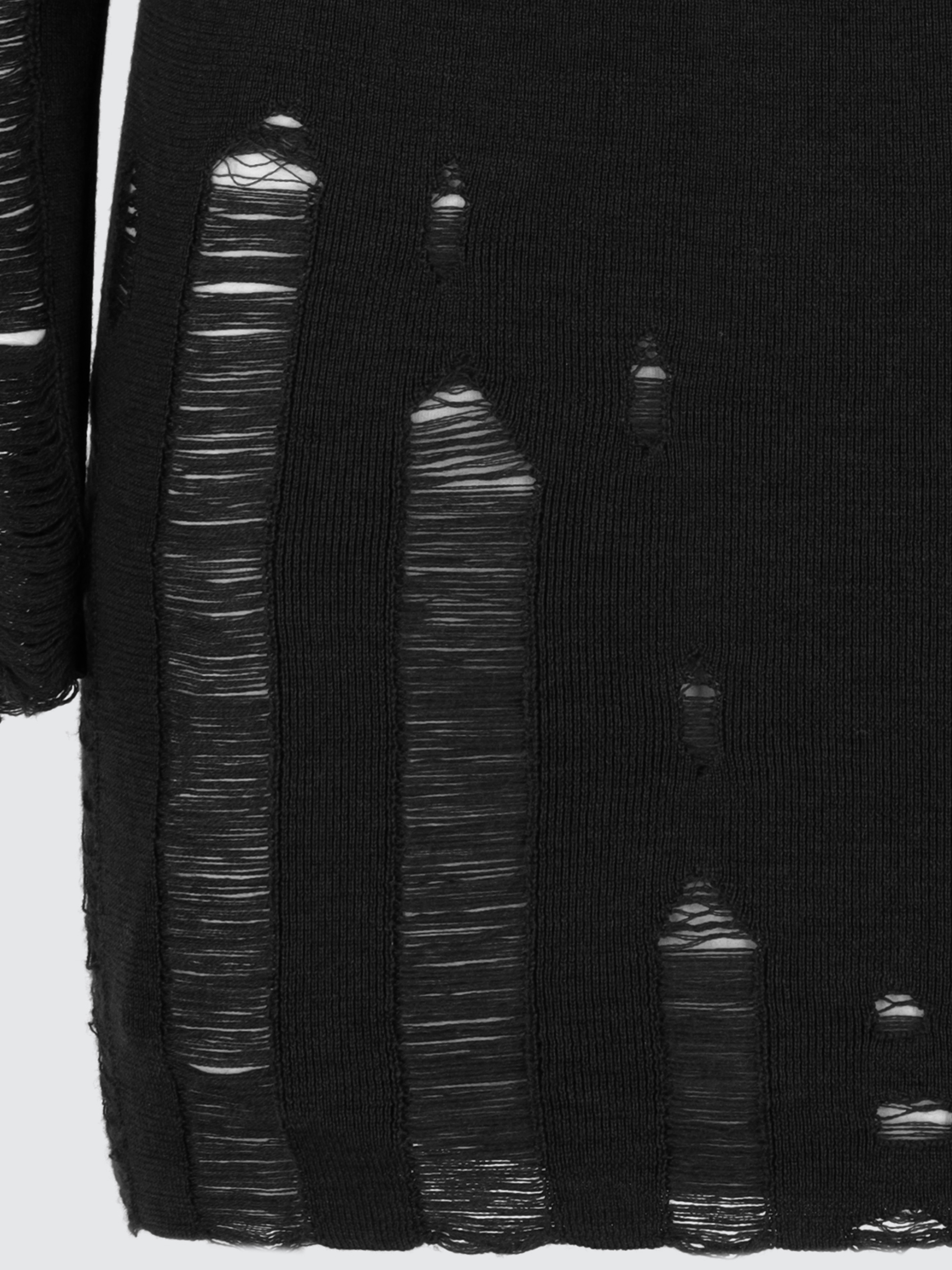 Silhouette essenziale e spirito grintoso. Questo abito in maglia a costina extra sottile è realizzato in 100% lana merinos extrafine, con vestibilità attillata, collo alto e maniche lunghe. Gli effetti destroyed su fondo e maniche aggiungono un tocco raw a un design minimal e aderente. Un capo dal carattere deciso, perfetto da interpretare in chiave day-to-night. Made in Italy.