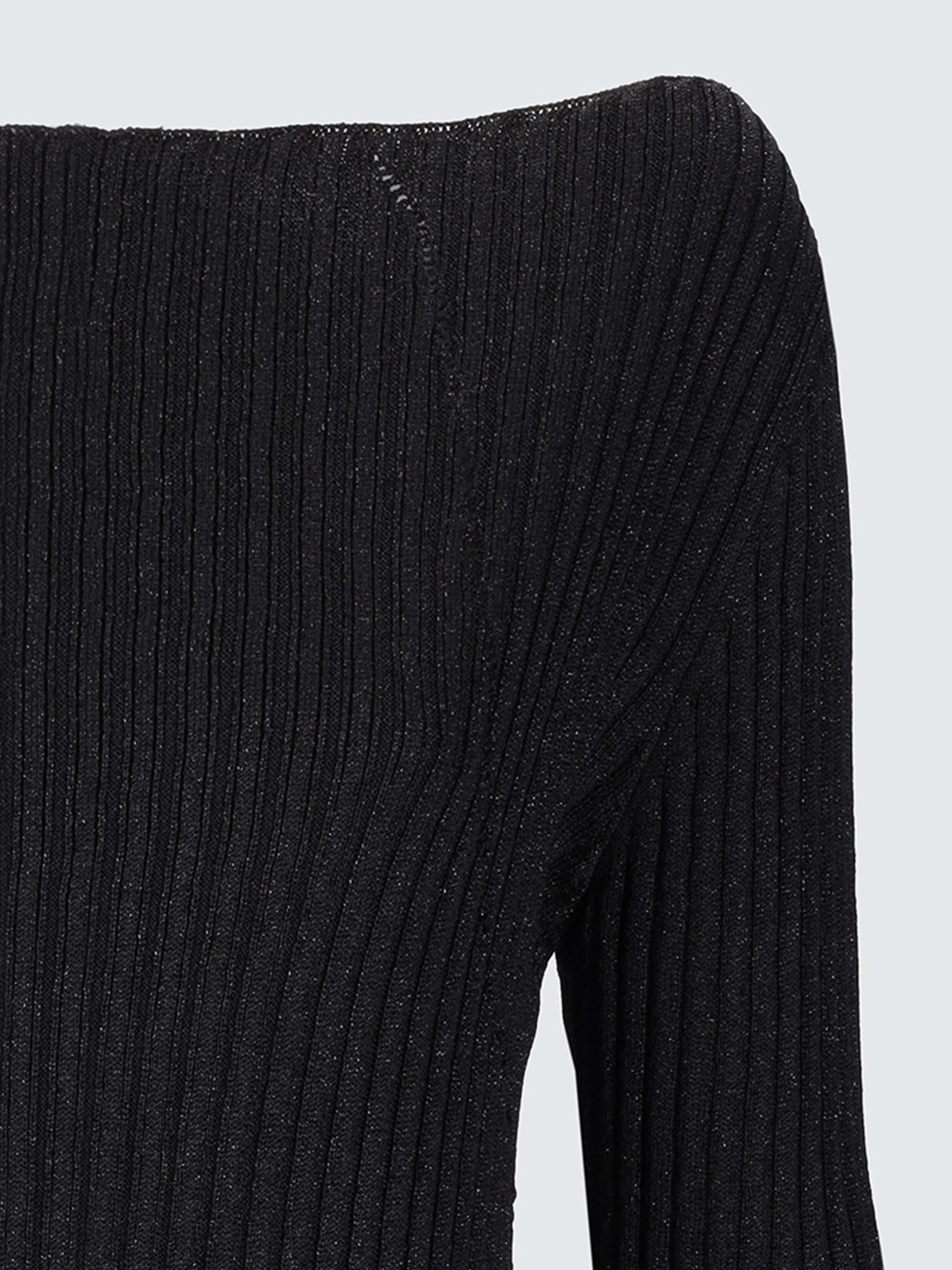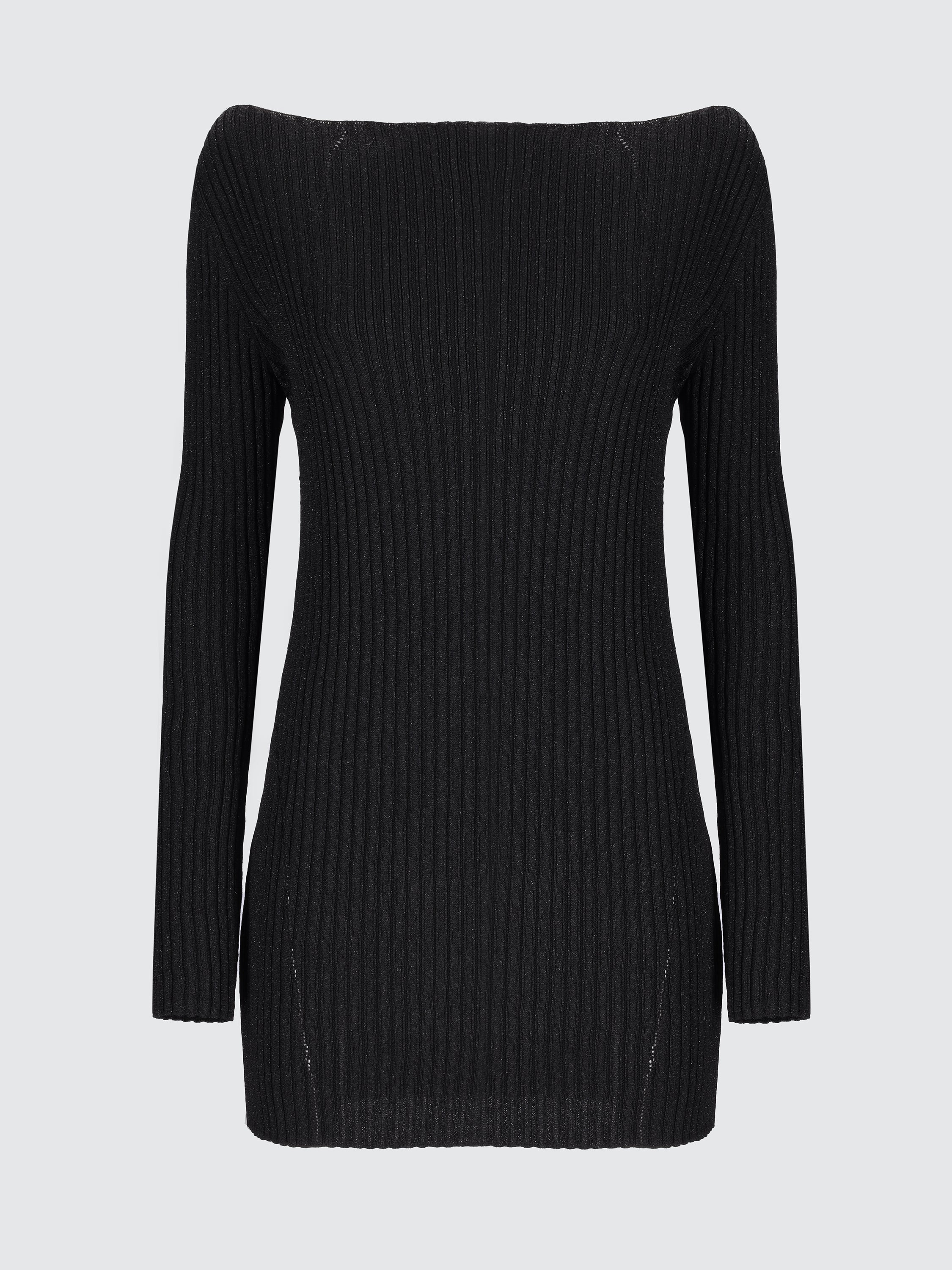 Questo miniabito di Laneus con manica lunga, realizzato in maglia leggera a costa larga con linea corta e attillata, presenta uno scollo a barca intriso di luminosi filati in Lurex, brillerà di luce propria nei vostri abbinamenti estivi.