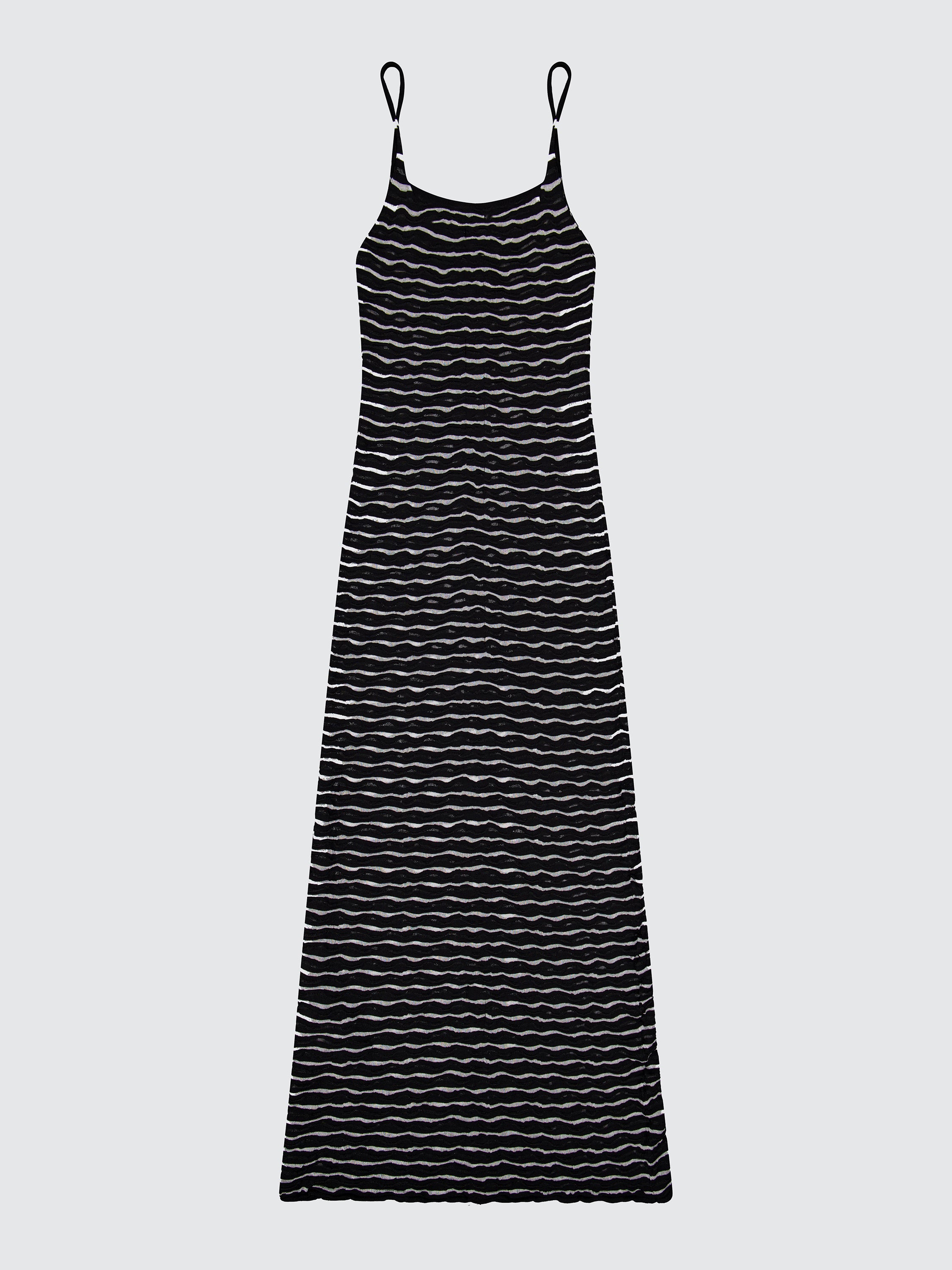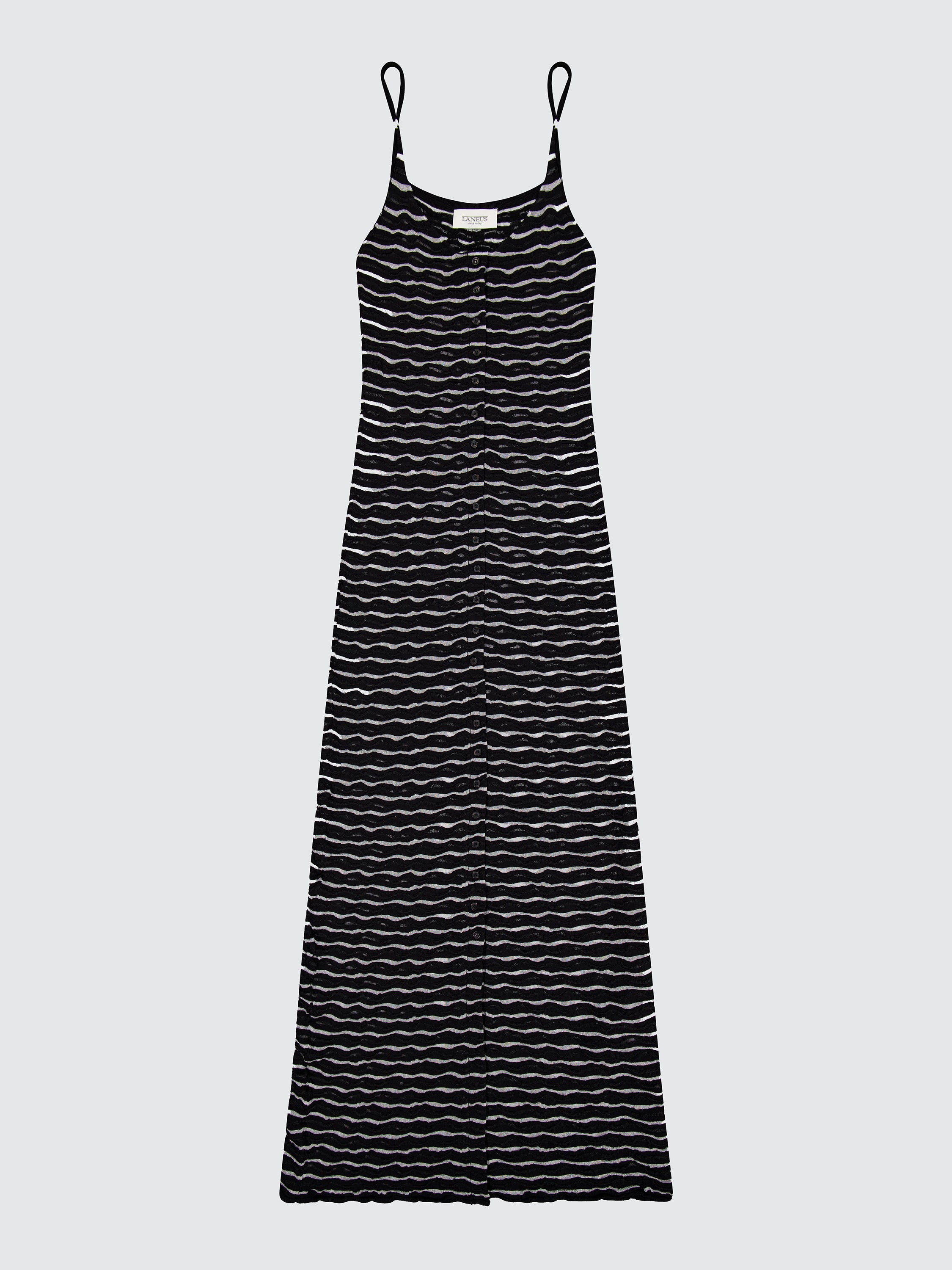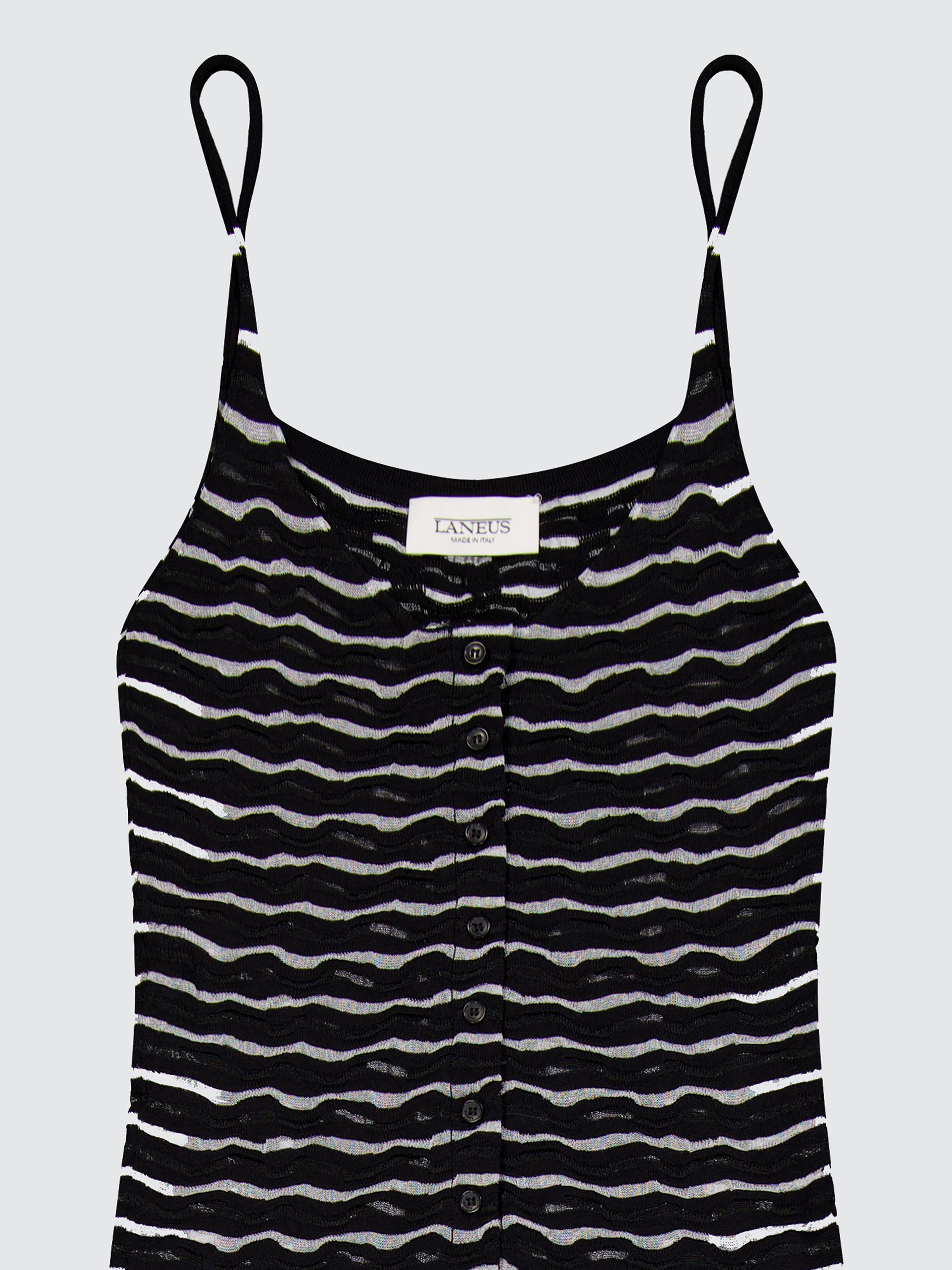 L’abito lungo alla caviglia modello canotta di Laneus è realizzato in leggero filato di viscosa caratterizzato da un pattern di righe irregolari, presenta una chiusura frontale multibottone e spalline sottili. La modella è alta 180 cm ed indossa una 40/S.