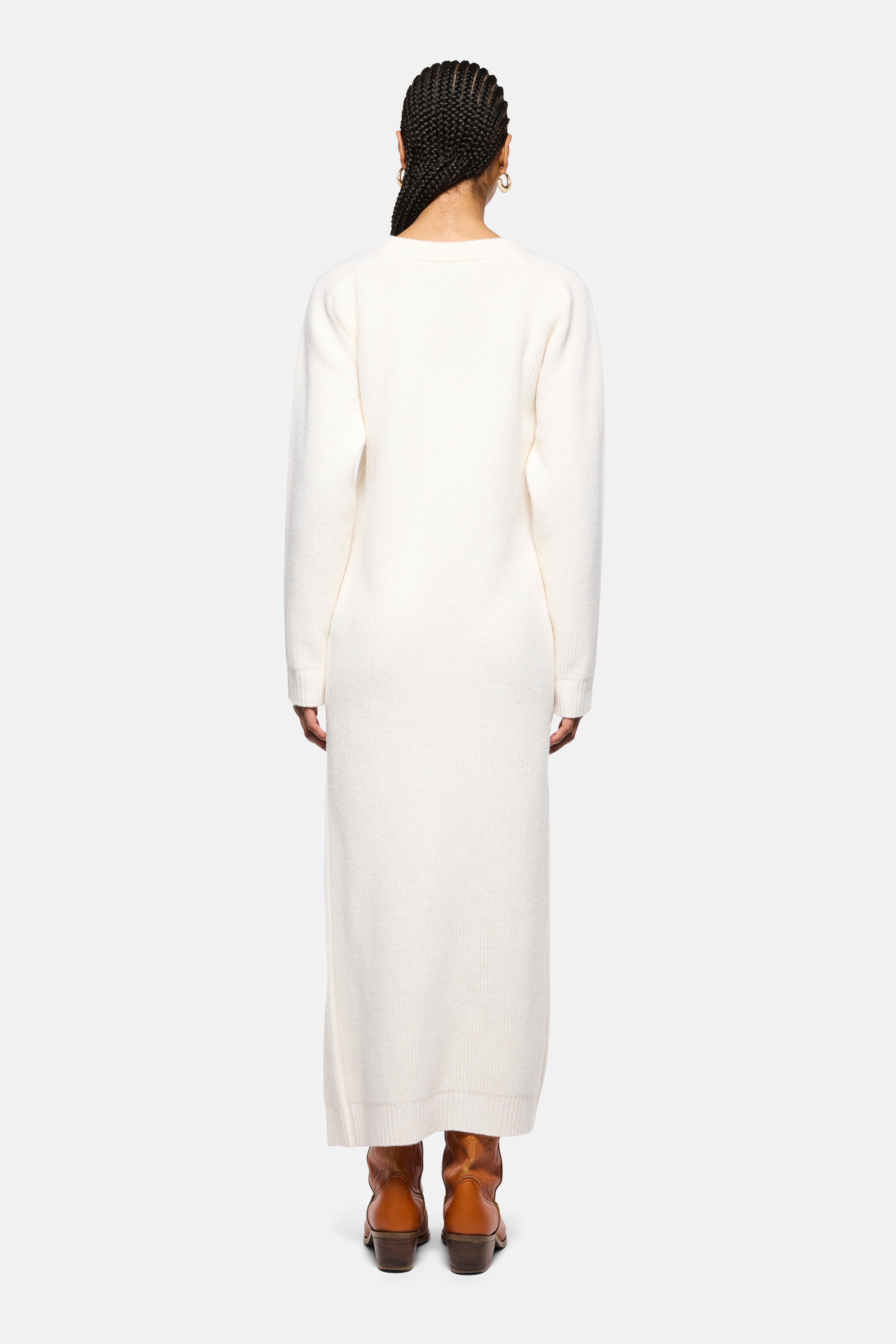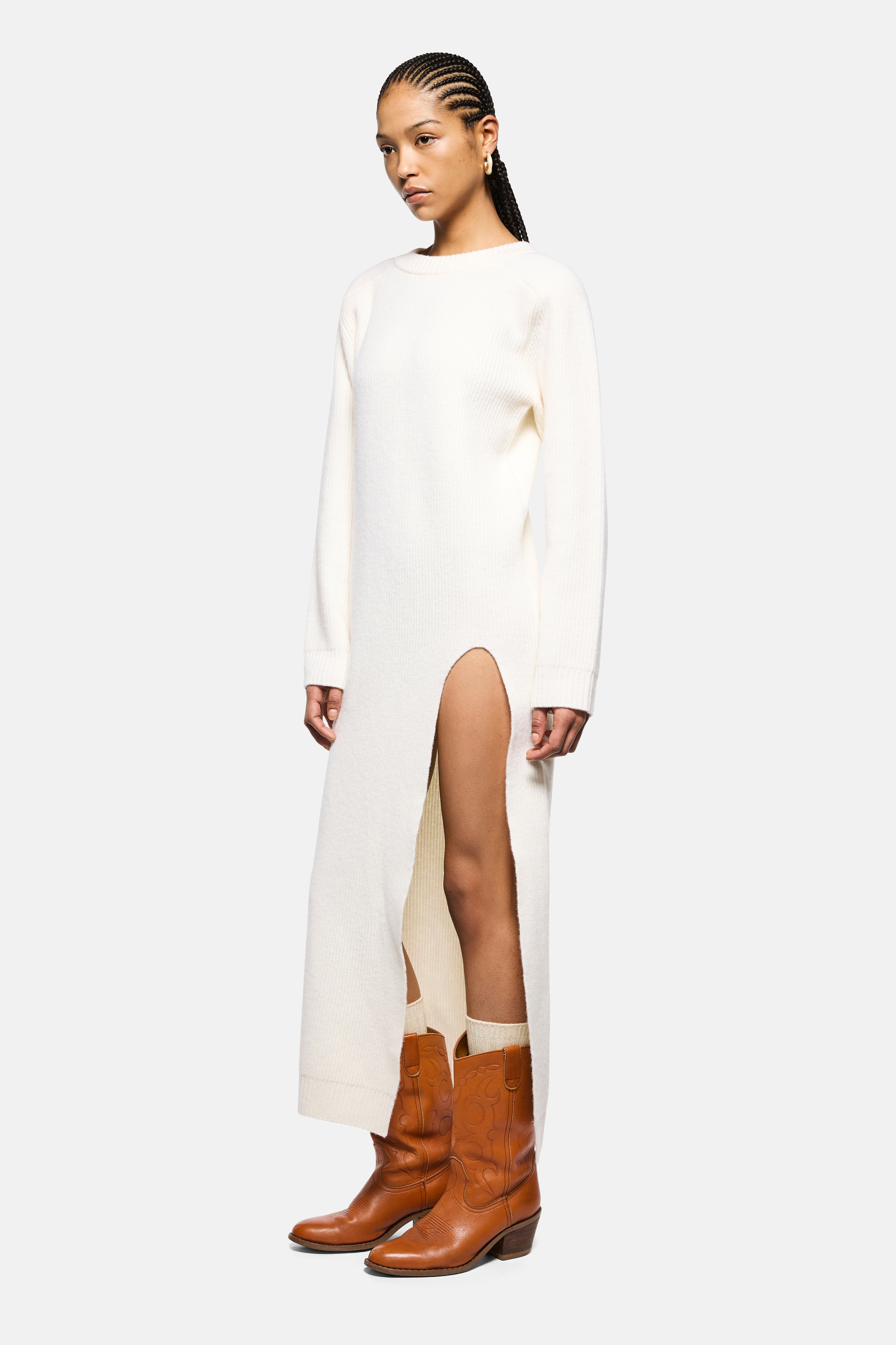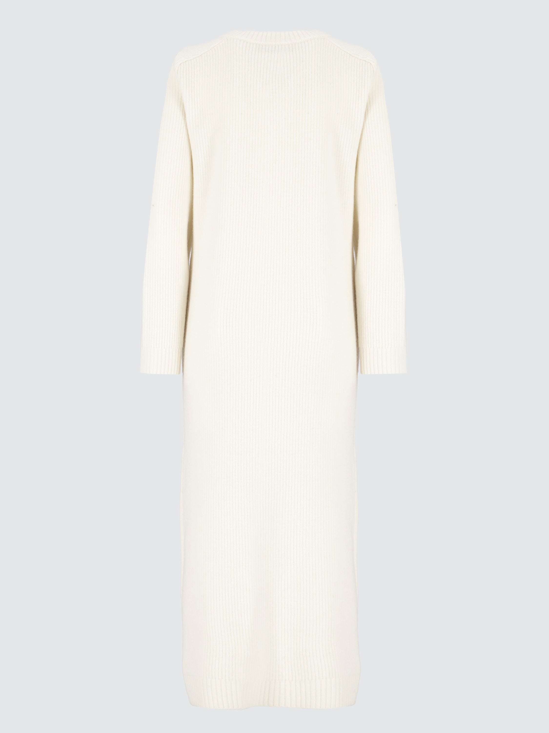 Eleganza minimale e linee decise. Questo abito in maglia a maniche lunghe firmato Laneus è realizzato in 100% lana Super 100’s e presenta una vestibilità regular. Il design pulito è valorizzato da un ampio spacco laterale a sinistra, che aggiunge movimento e sensualità a un capo dalla forte essenzialità. Made in Italy.