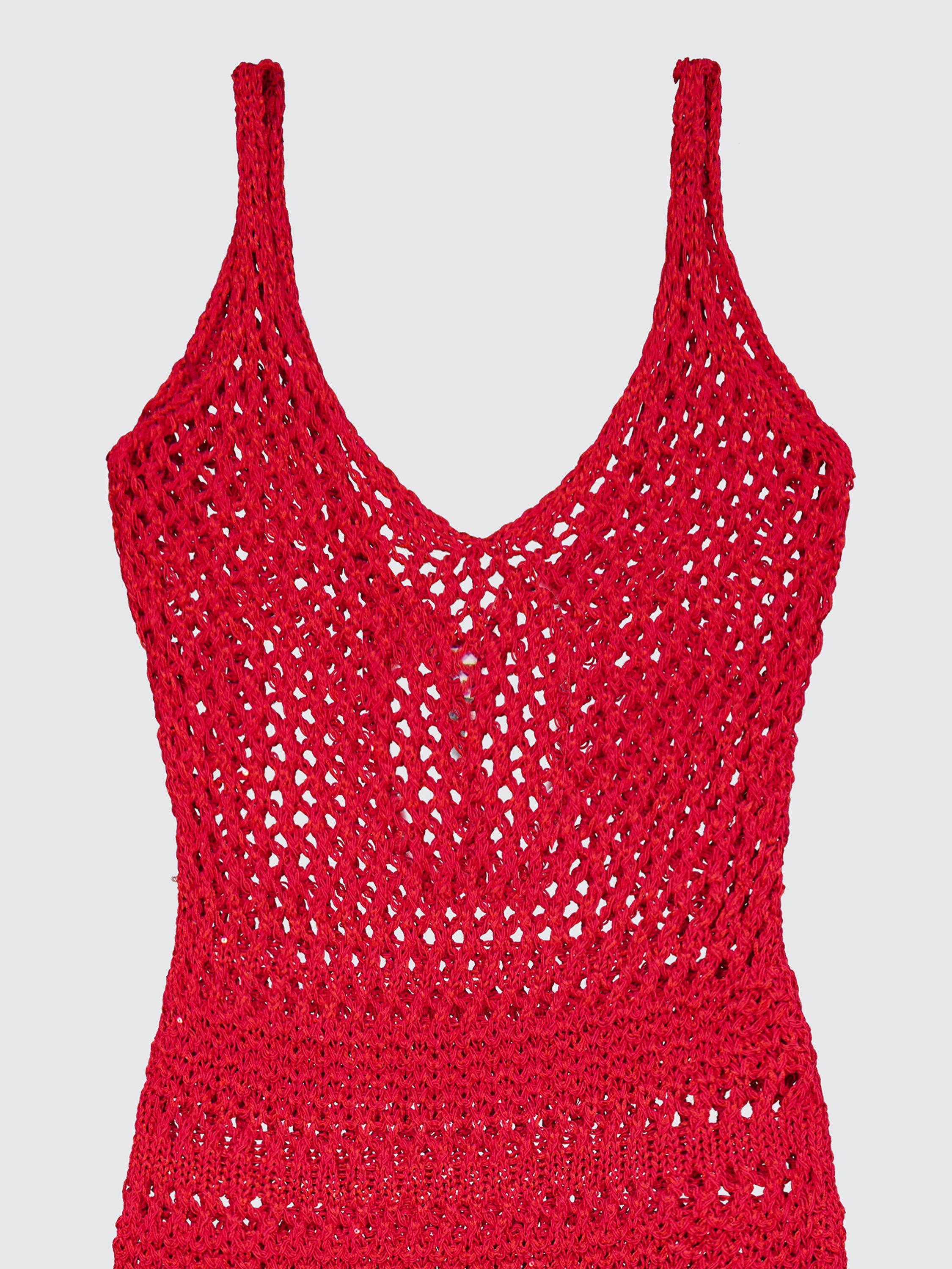Ampliate la vostra collezione con questo sofisticato abito canotta di Laneus. Il modello realizzato in filato di cotone traforato presenta uno scollo a V e una silhouette dritta con frange che profilano il fondo. La modella in foto è alta 180 cm ed indossa una 40/S.