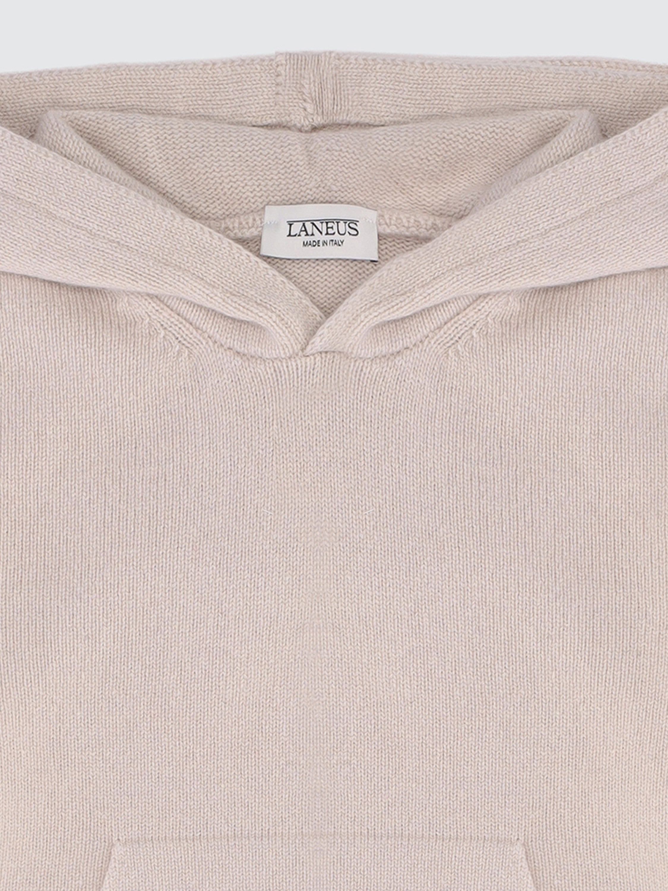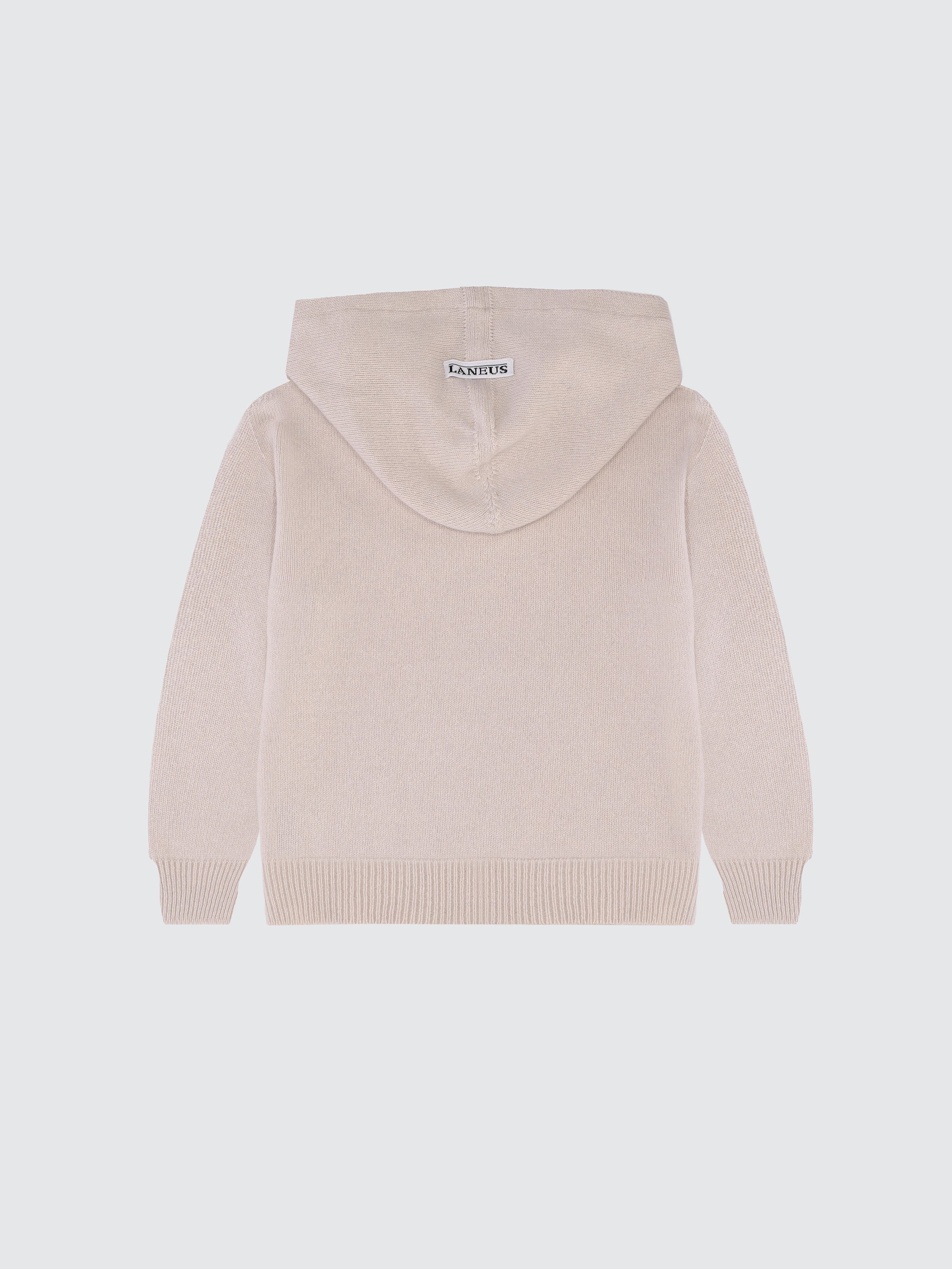 Realizzata in una preziosa miscela di lana merinos extrafine, seta e cashmere, questa felpa in maglia firmata Laneus Kids unisce stile e qualità. Il design è caratterizzato da un cappuccio ampio, tasca frontale a marsupio e dettagli a costine su fondo e polsini. Un capo avvolgente e morbido, pensato per accompagnare i più piccoli nelle giornate più fredde con un tocco contemporaneo.