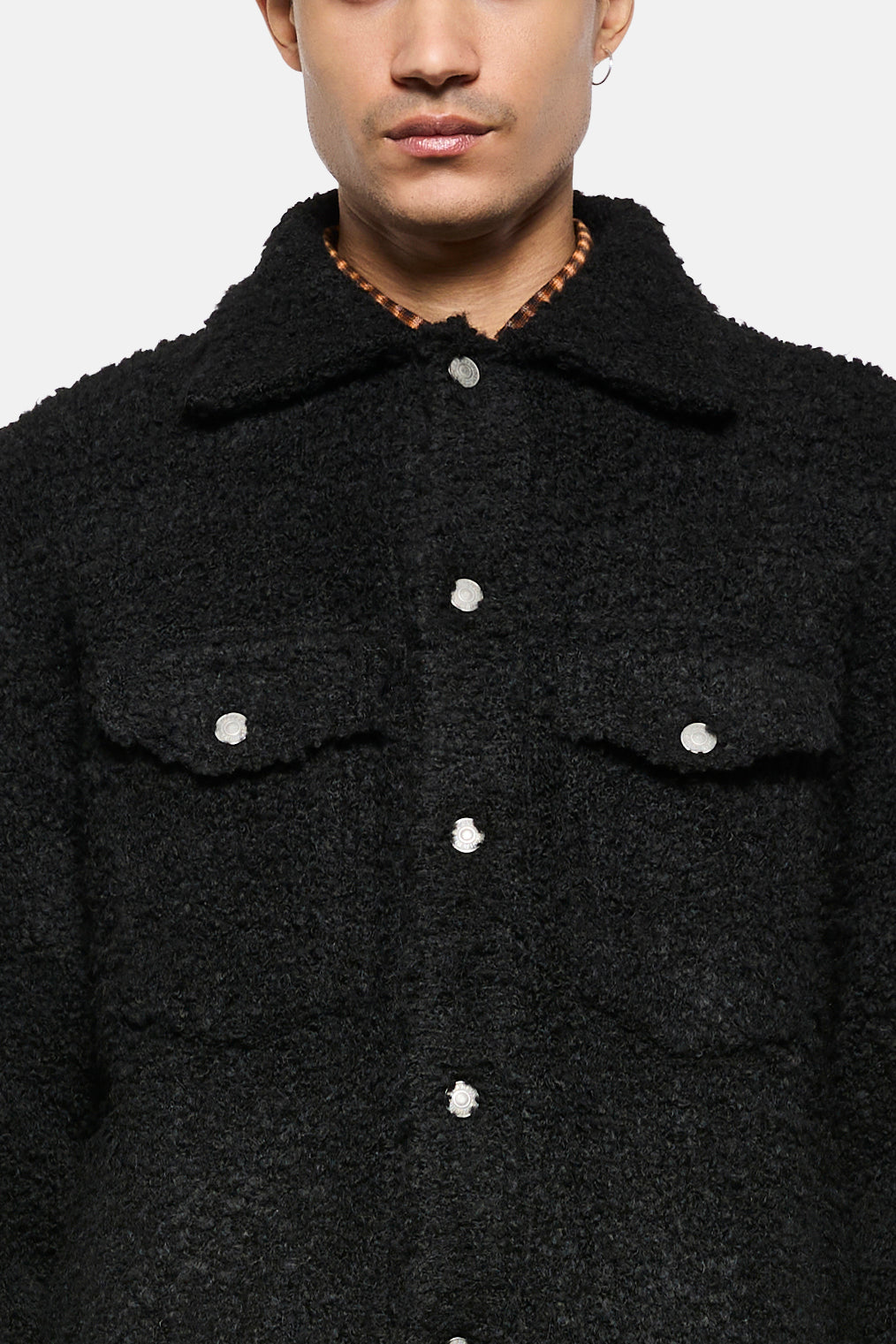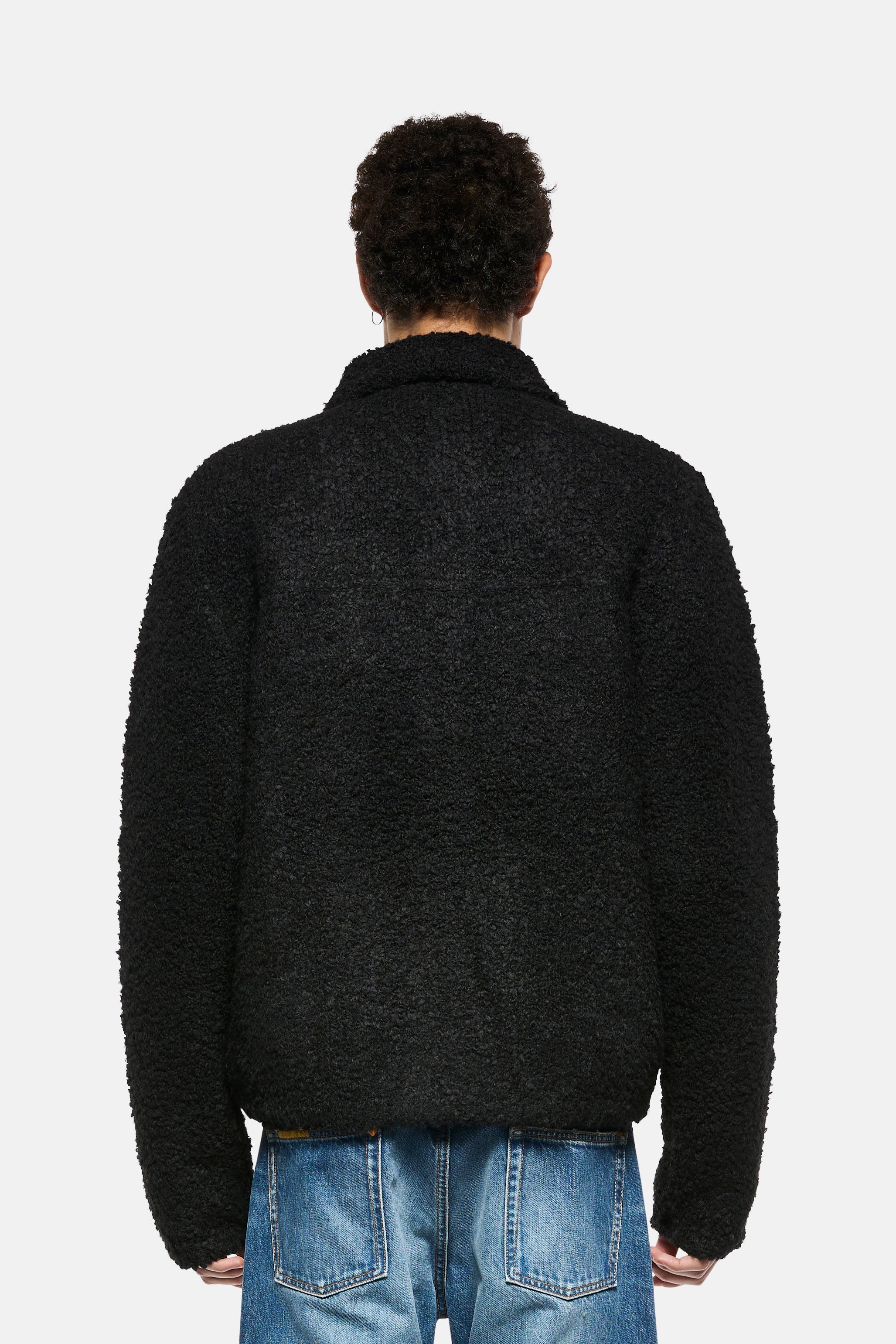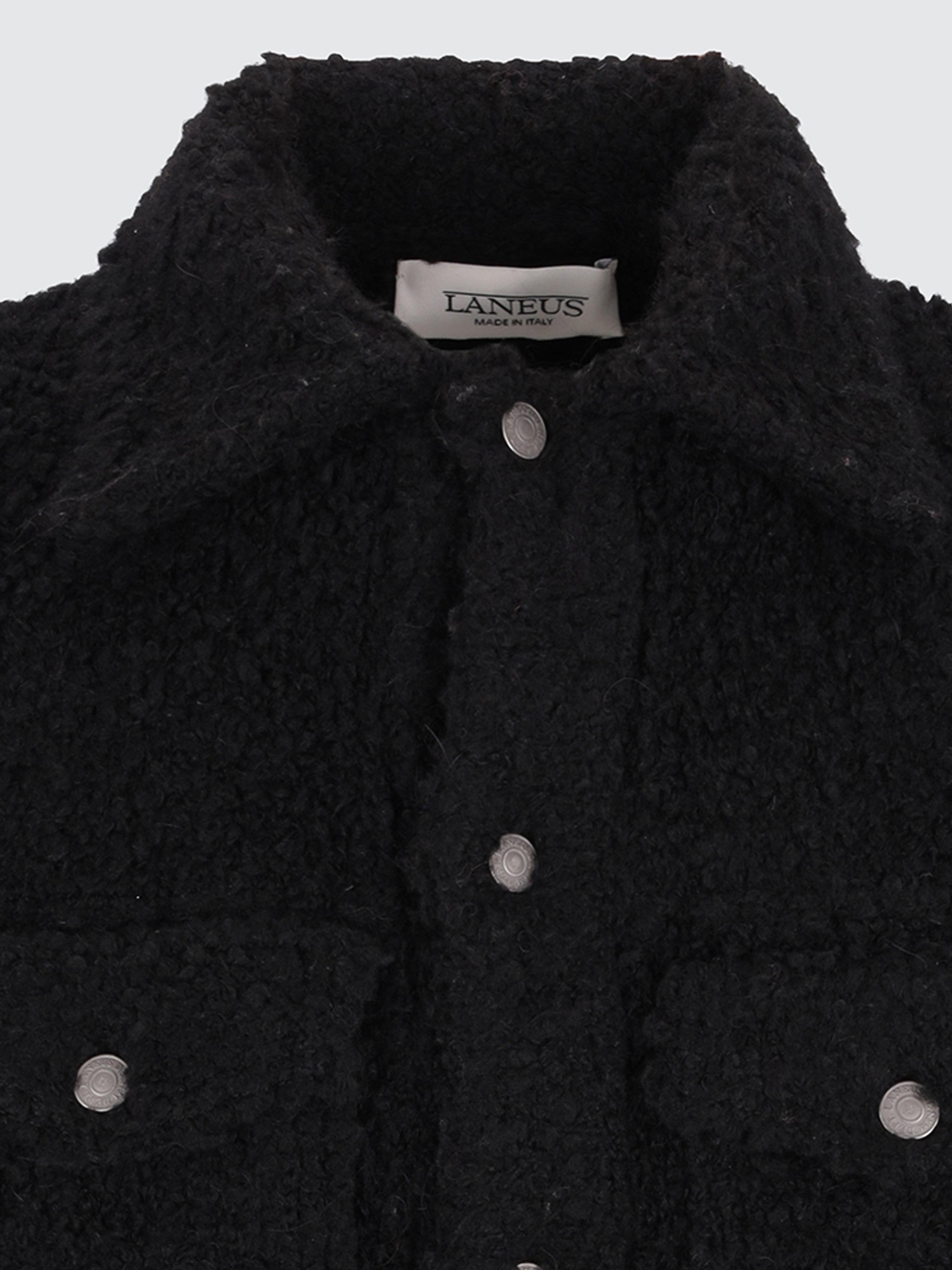 Questa giacca firmata Laneus è una reinterpretazione in maglia della classica trucker jacket, caratterizzata da una texture effetto bouclé che le conferisce un look caldo e materico. Presenta una vestibilità regular, chiusura frontale con bottoni a chiodo, due tasche laterali a letto e due tasche frontali con pattina e bottone, per un perfetto equilibrio tra funzionalità e stile. Realizzata con una composizione mista di lana e alpaca, unisce comfort e un’estetica contemporanea, rimanendo fedele allo spirito distintivo di Laneus. Made in Italy.