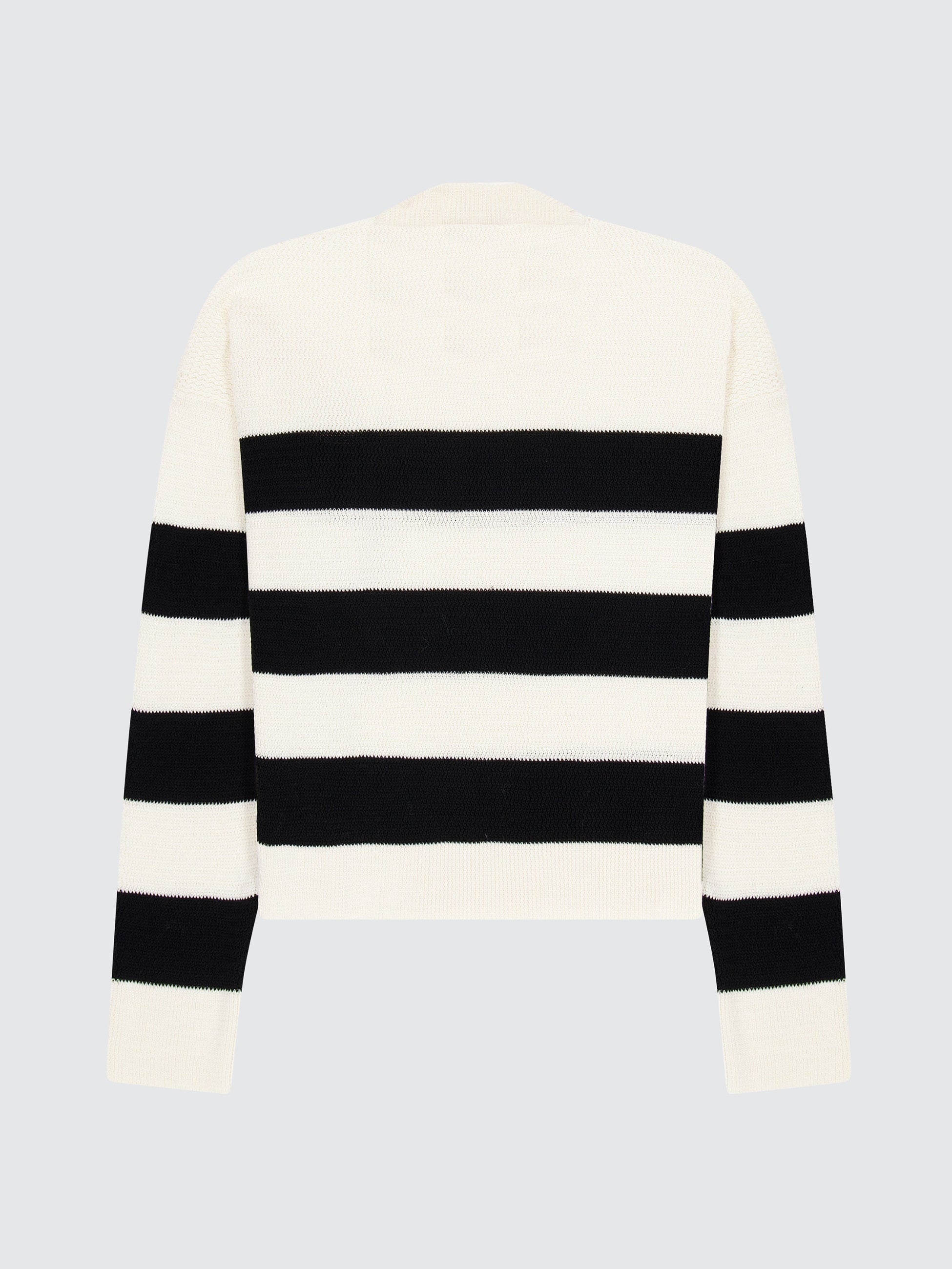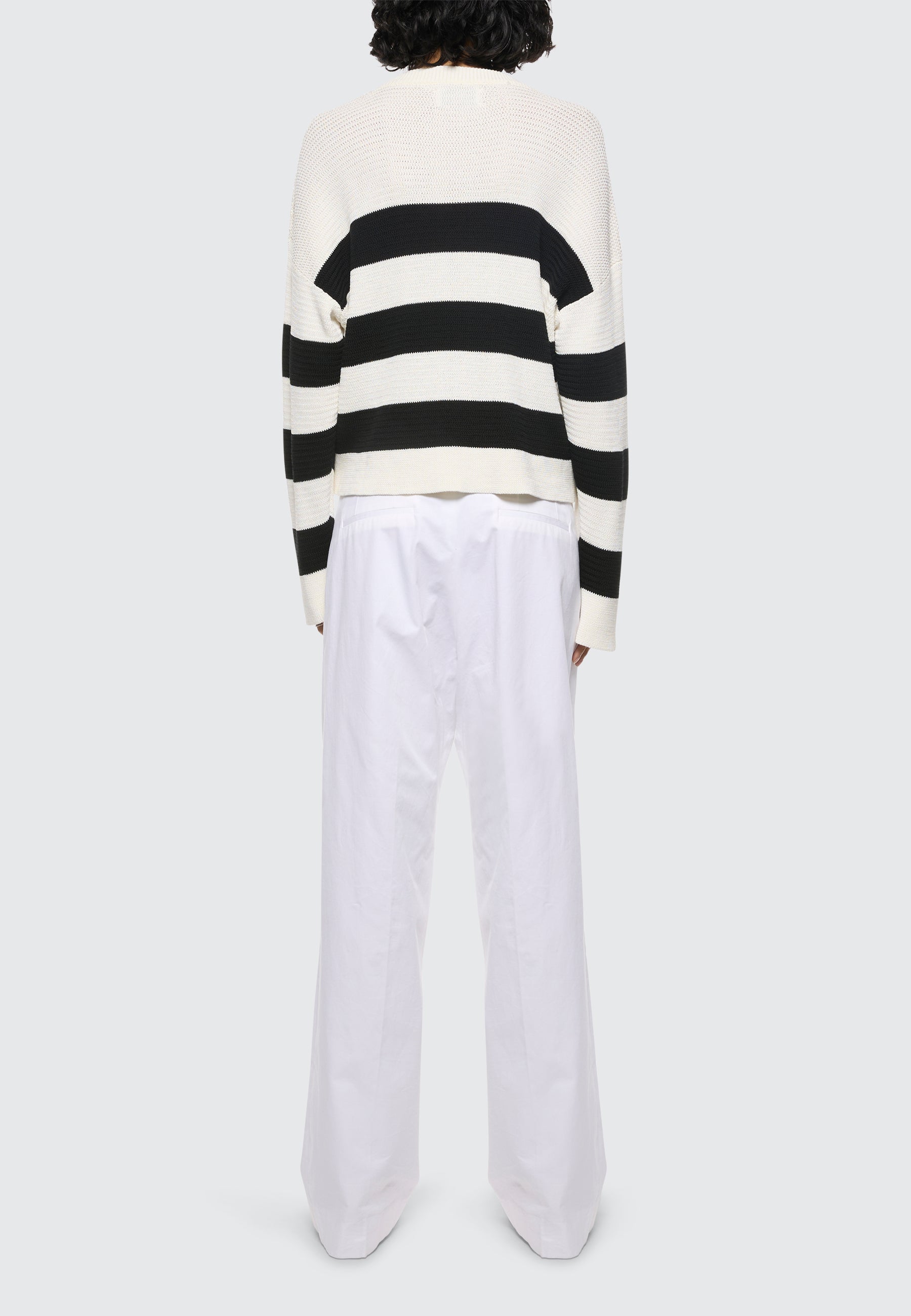 Il pullover di Laneus è un modello estremamente versatile, caratterizzato da righe larghe; è sapientemente realizzato in filato di cotone, presenta un fit boxy con palle scivolate e finiture a coste. La modella in foto è alta 180 cm ed indossa una 40/S.
