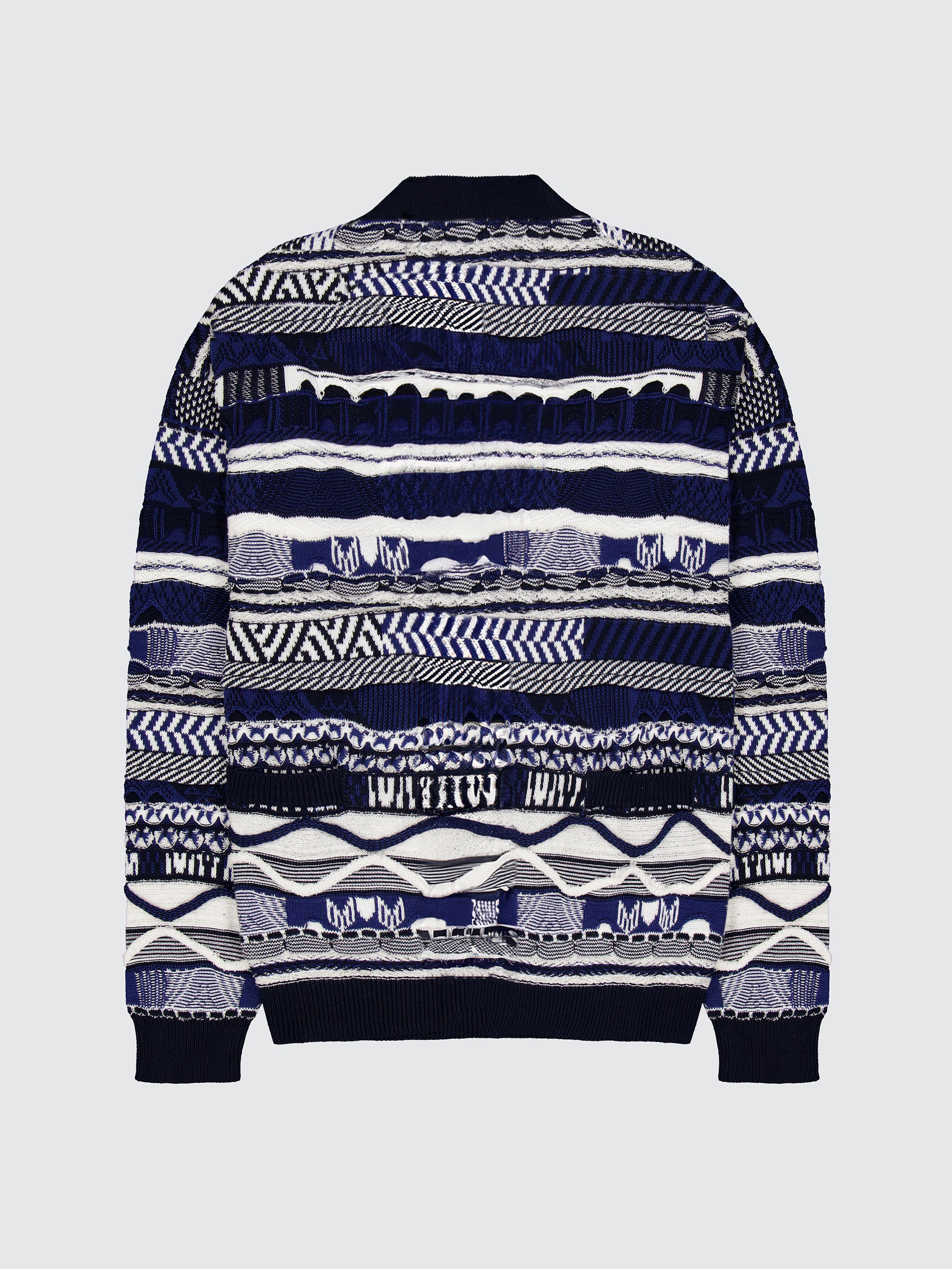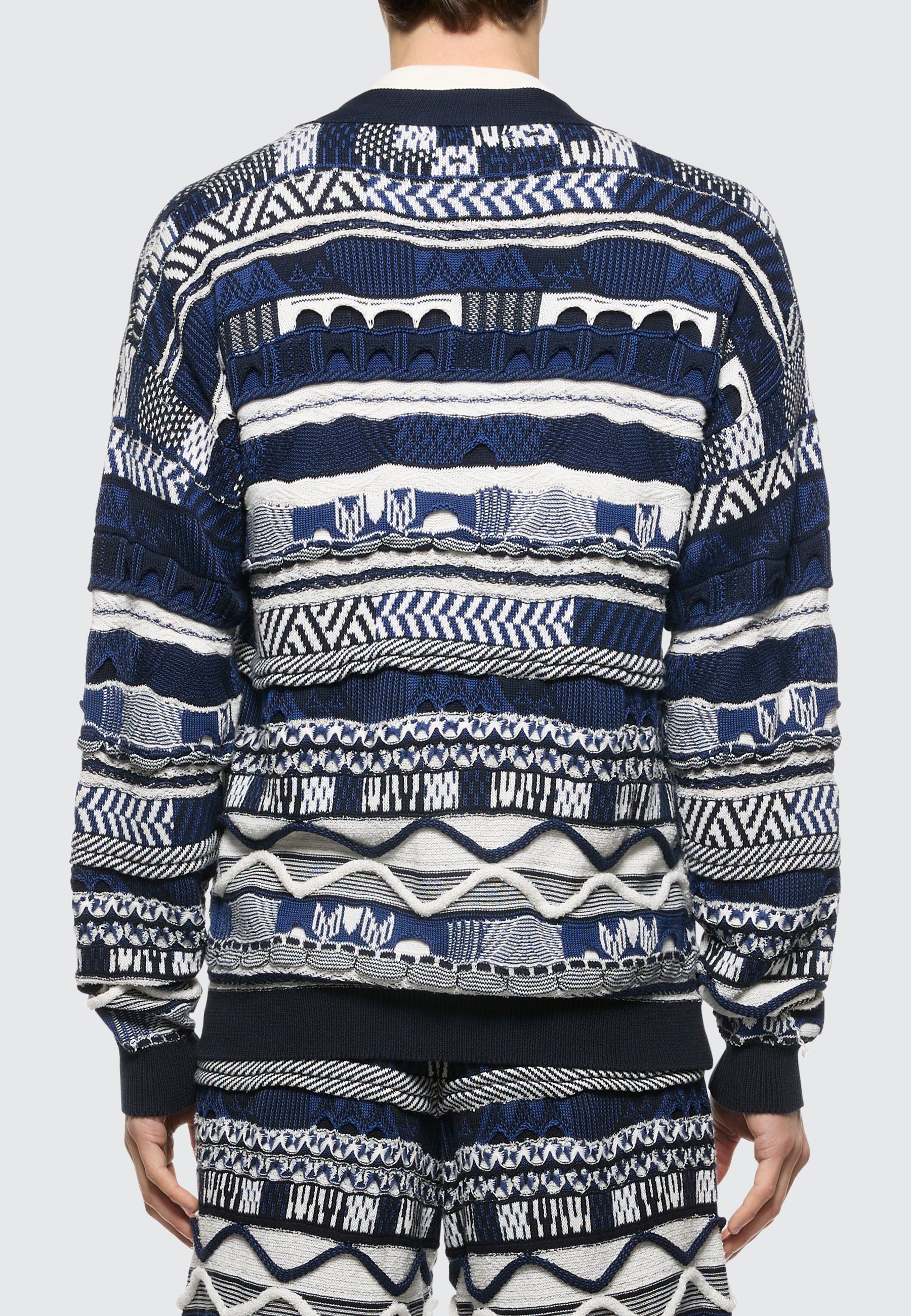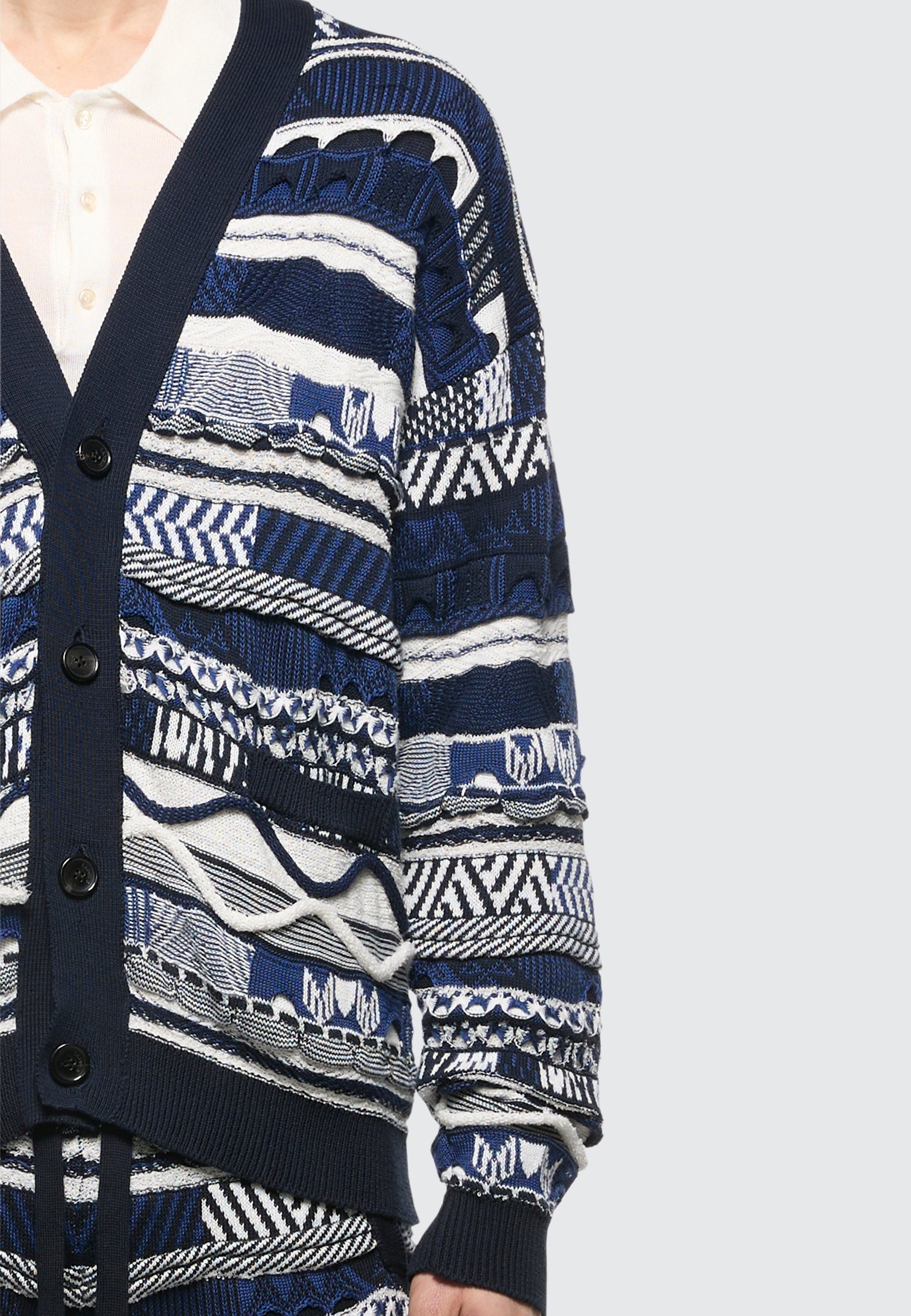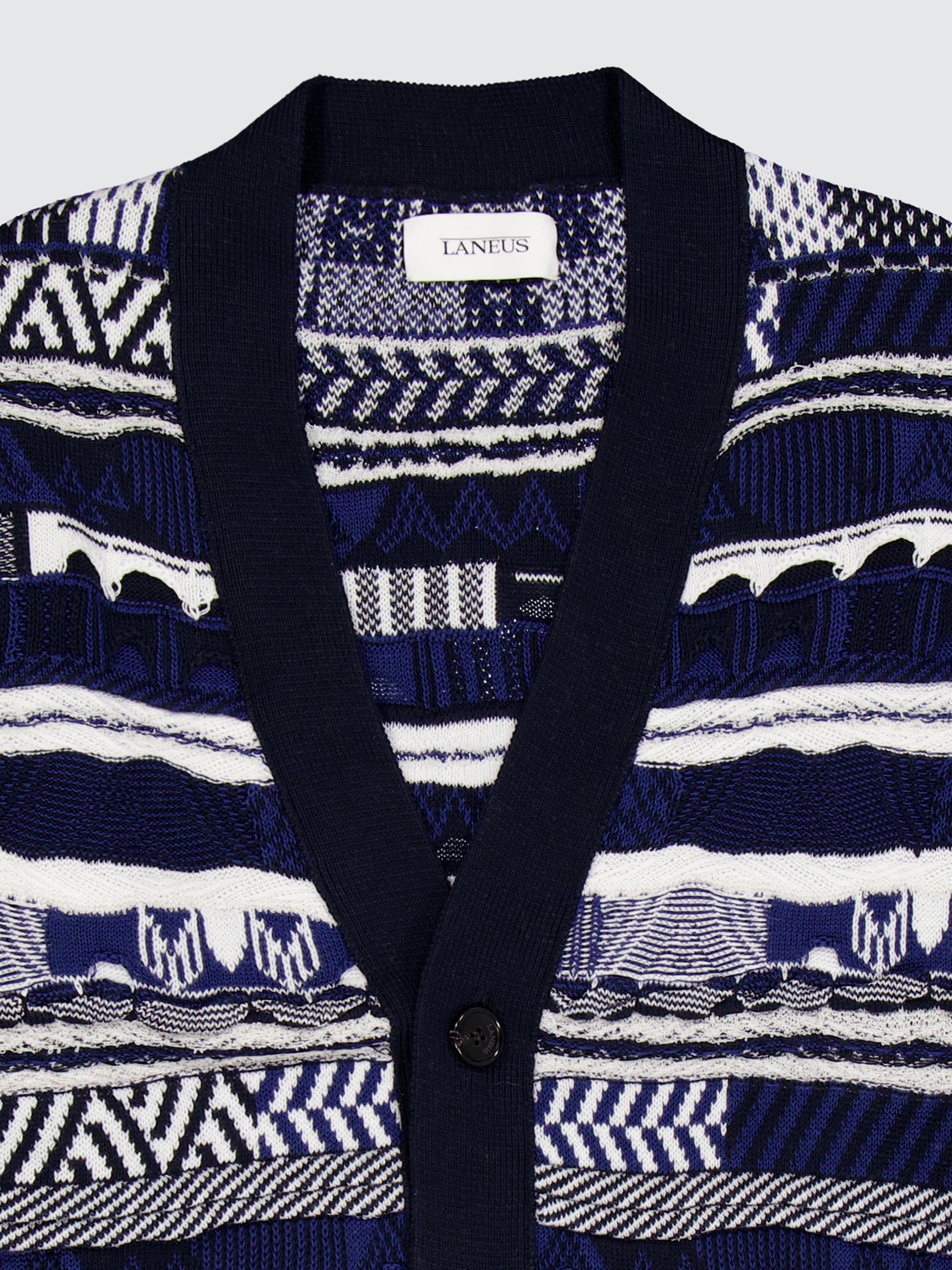Questo cardigan di Laneus è realizzato in pregiato filato di cotone che sfoggia un iconico motivo jacquard multifilo. Presenta una silhouette oversize con spalla scesa e chiusura frontale a 4 bottoni. Made in Italy. Il modello è alto 190 ed indossa una 48/M.