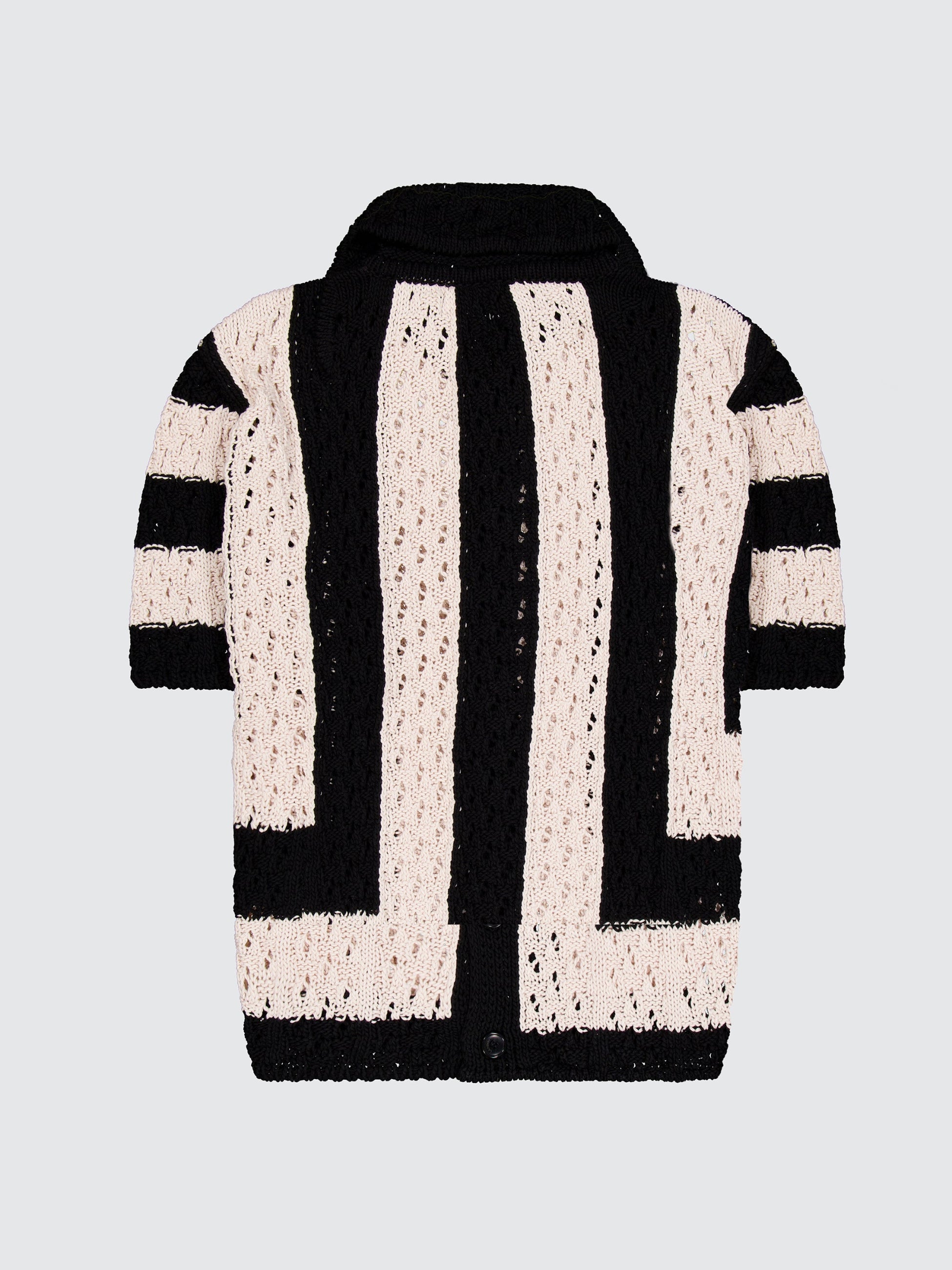 La polo di Laneus è realizzata in pregiato filato di cotone con lavorazione traforata motivo a righe. Presenta una silhouette boxy con maniche a tre quarti, collo bowling e abbottonatura a 6 bottoni che ne definisce lo stile rilassato. Made in Italy. Il modello è alto 190 cm ed indossa una 48/M.