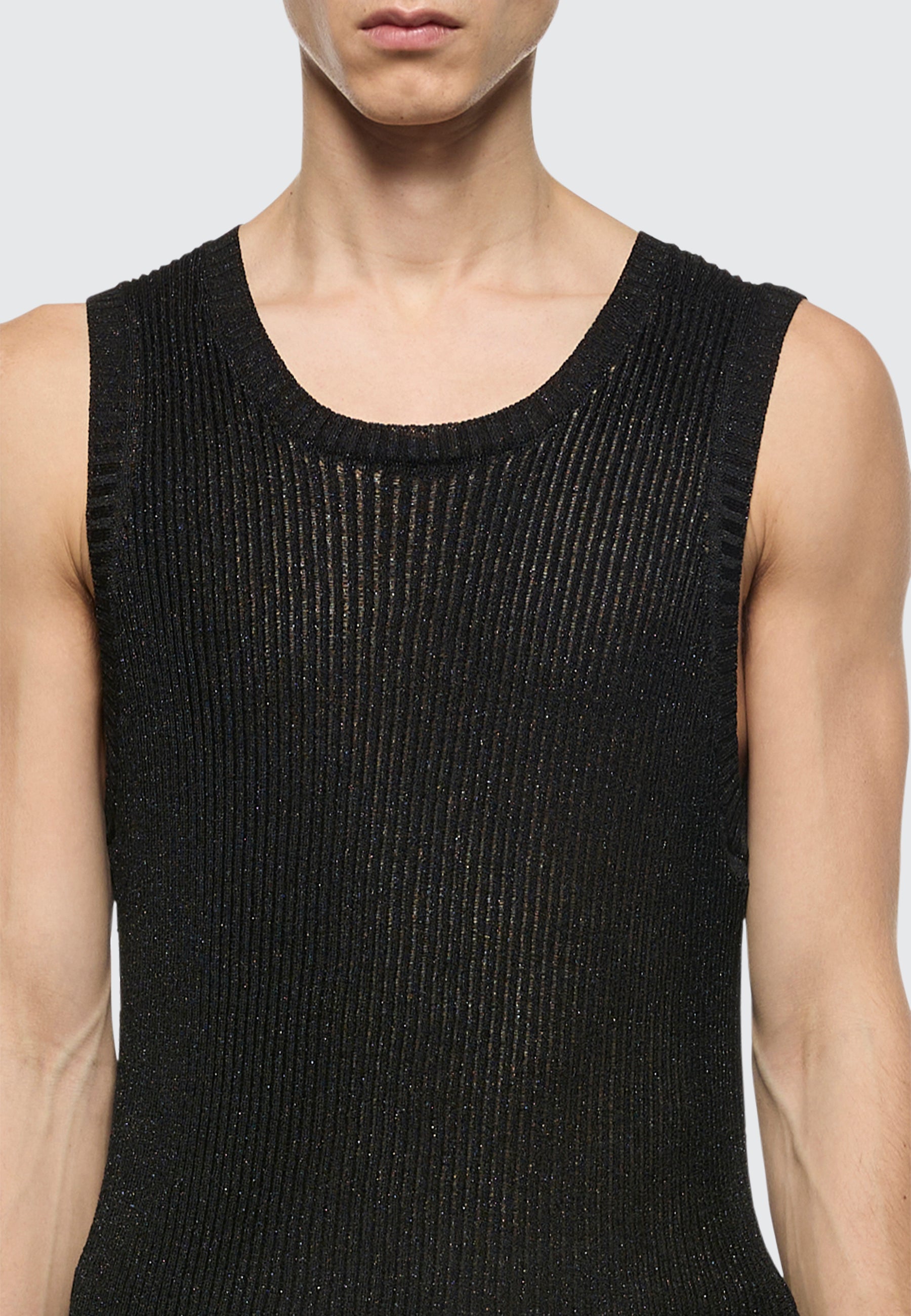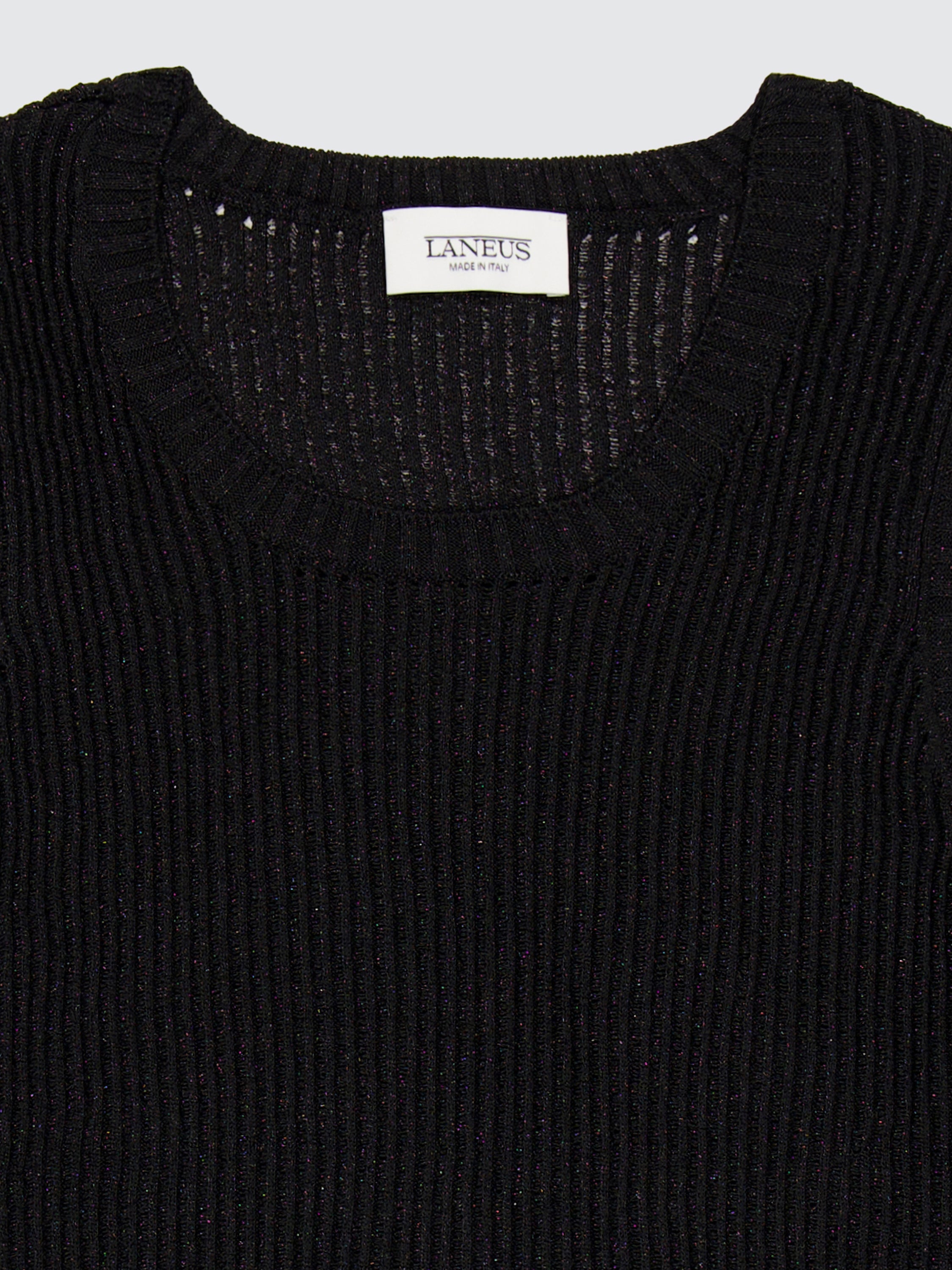 Il top di Laneus è realizzato in filato di viscosa lurex con finitura estremamente morbida e presenta una silhouette comoda con scollo rotondo e ampio giromanica. Made in Italy. Il modello è alto 190 cm ed indossa una 48/M.