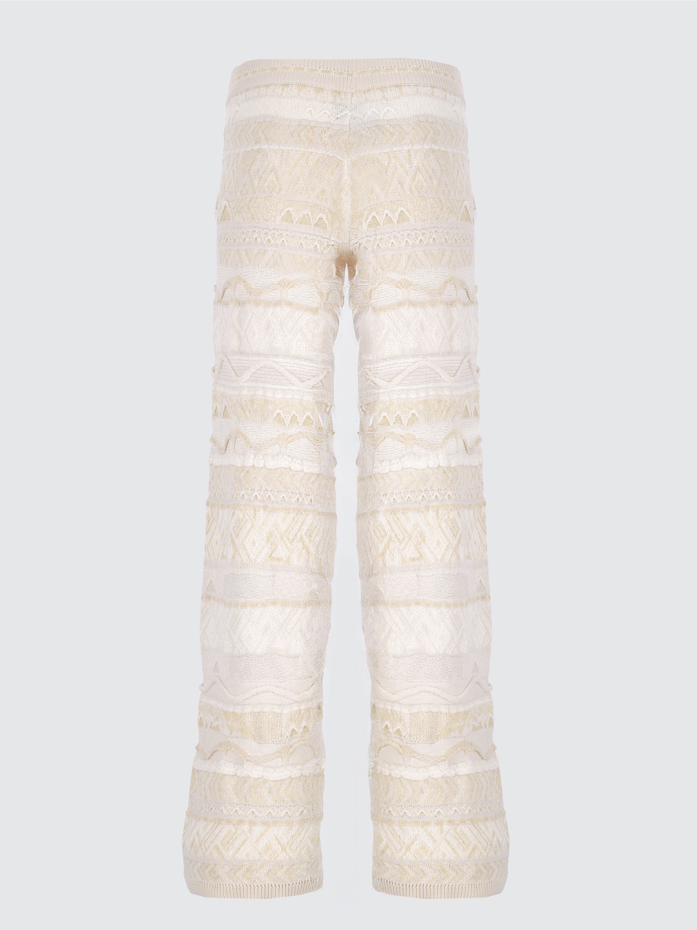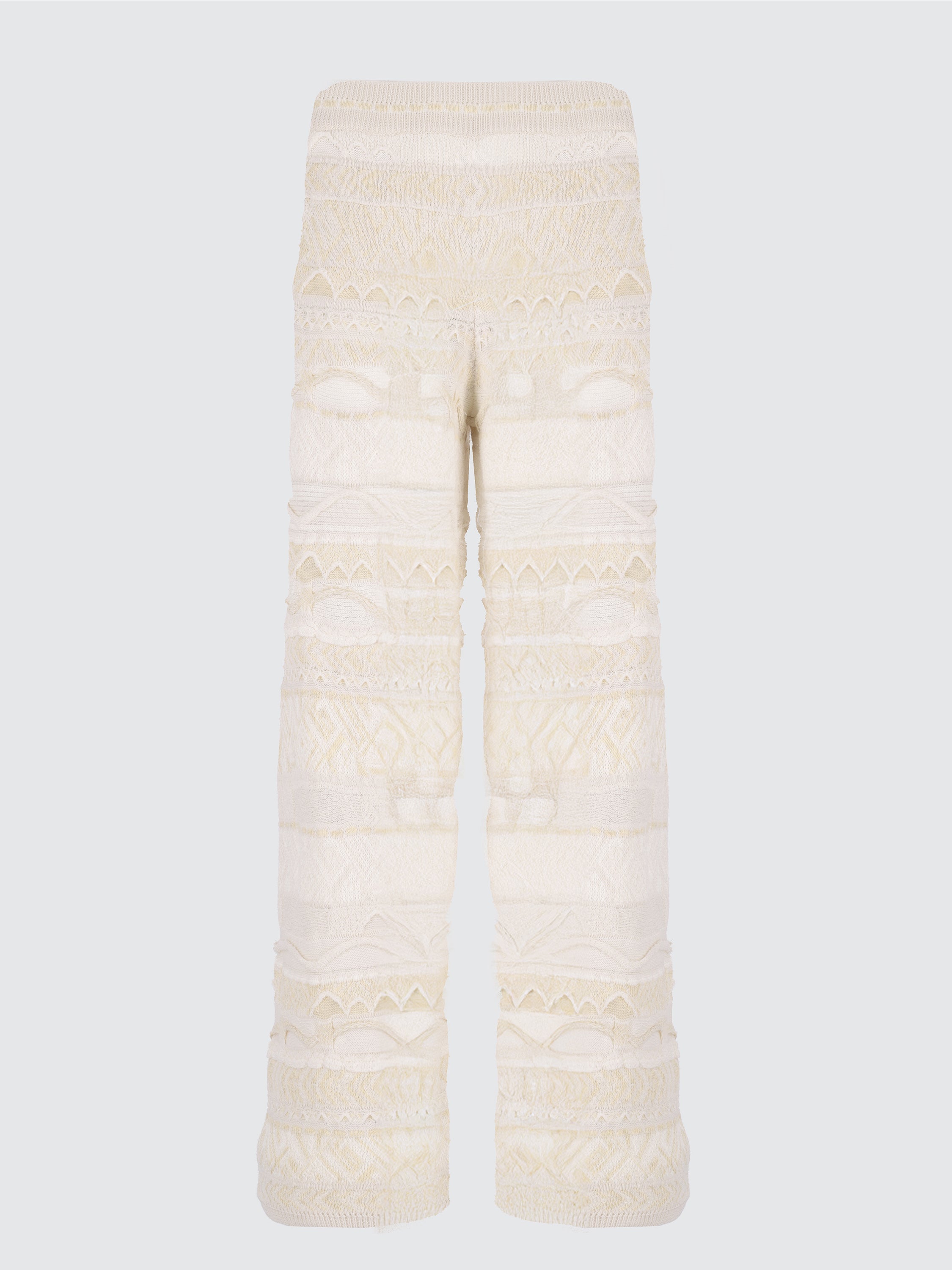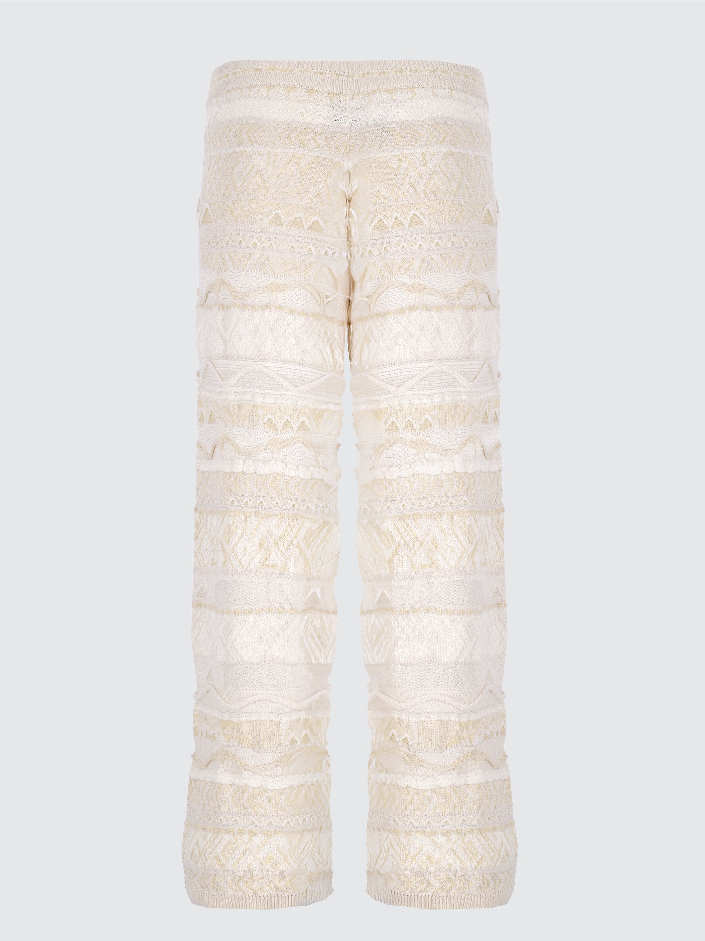 Laneus presenta un'inedita capsule collection di homewear. Questi pantaloni dal fit comodo reinterpretano l’iconico jacquard del brand attraverso tonalità neutra. Il design con elastico in vita e doppia tasca frontale si arricchisce di dettagli piquet e cordonetti a rilievo, creando profondità ed effetti tridimensionali. Il mix di filati in cotone, con contrasti tra finiture lucide e opache e l’aggiunta di un morbido filo bouclé, conferisce un equilibrio armonioso tra fascino rustico ed eleganza sofisticata.