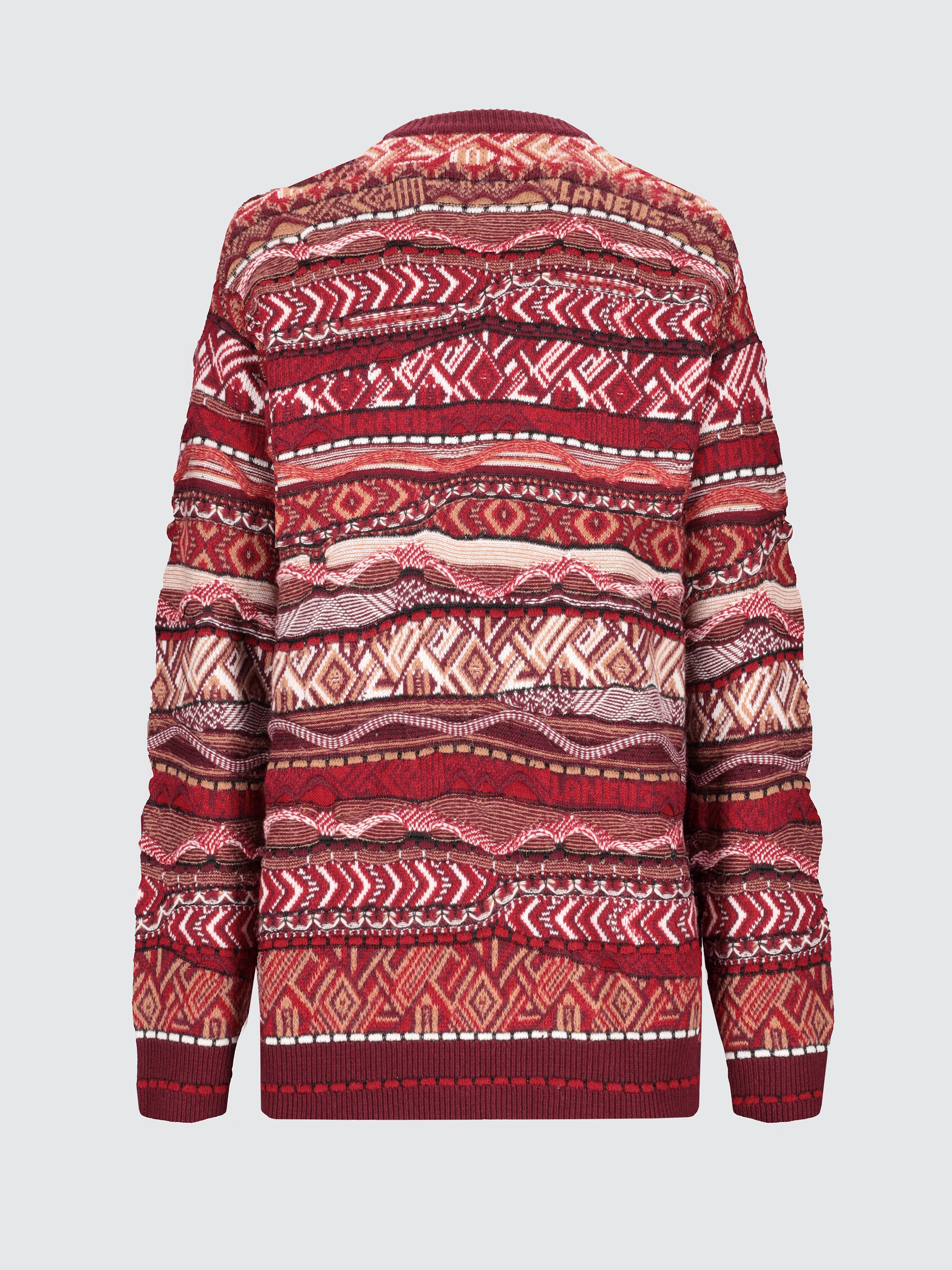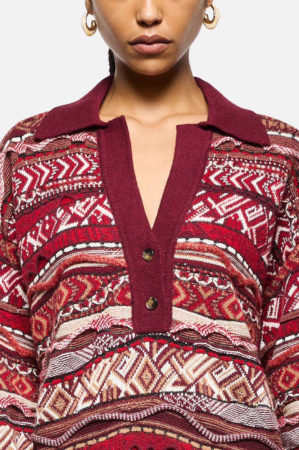 Volume over e spirito grafico per questa polo lunga in maglia firmata Laneus. Il motivo jacquard “LA.” viene rivisitato con nuovi disegni e colori di stagione, integrando elegantemente il logo all’interno del pattern. Il modello presenta apertura frontale con bottoni e finiture a costine. Realizzata in un mix di alpaca, lana e fibre elastiche, è un capo bold e versatile, perfetto da interpretare anche come mini dress. Made in Italy.