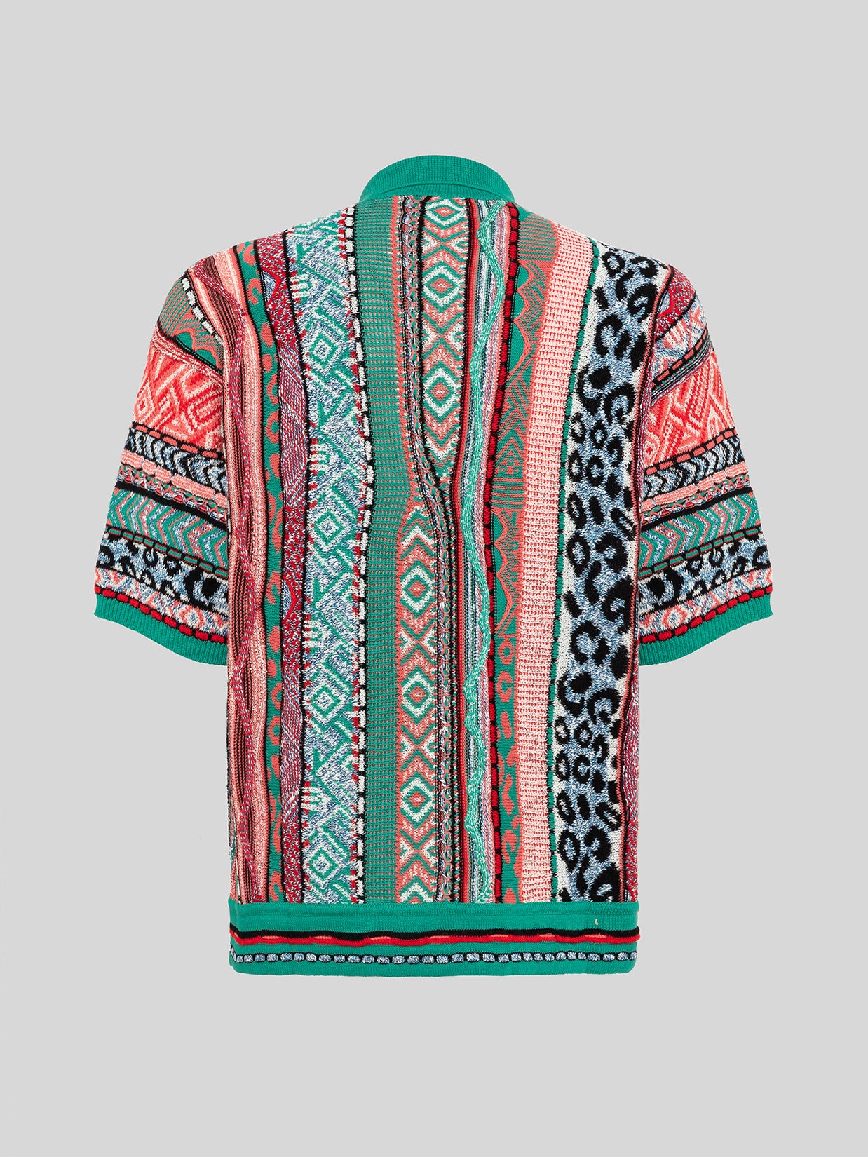 Camicia in maglia realizzata in iconico filato di cotone jacquard multifilo. Presenta una silhouette regular con maniche corte e bottoni frontali. Tasca piatta sul petto tono su tono. Made in Italy.