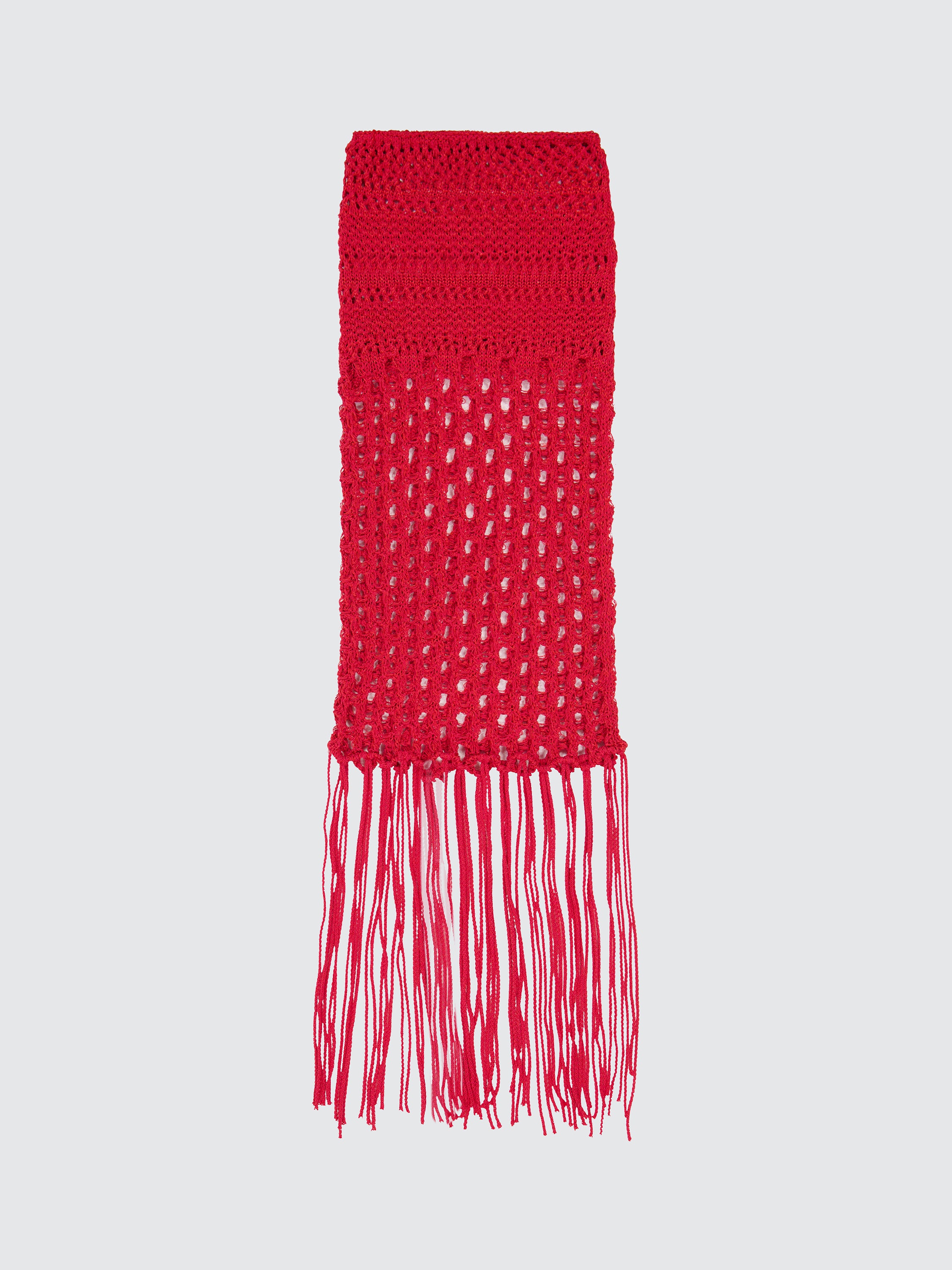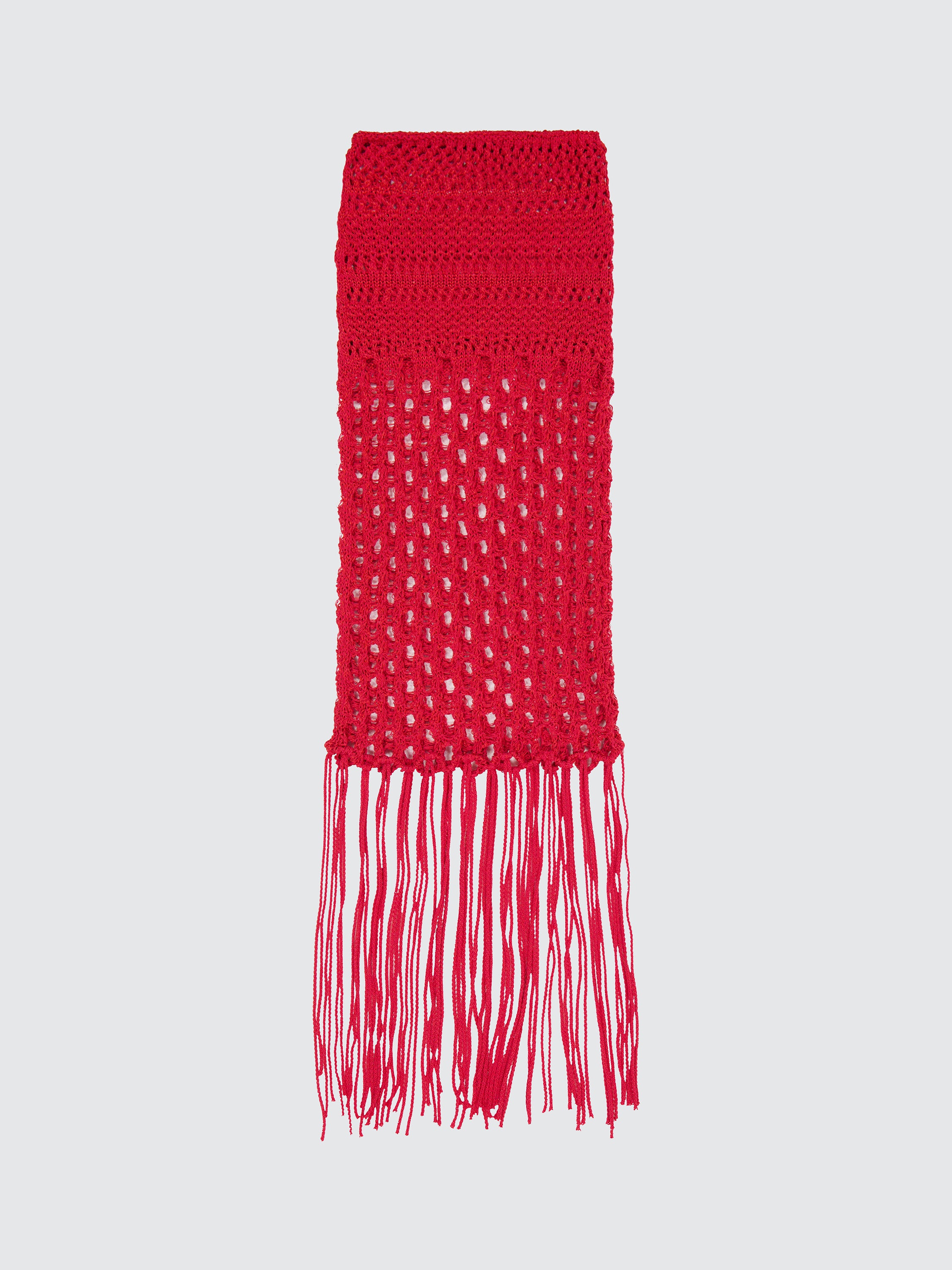 Laneus applica la sua maestria artigianale e il gusto contemporaneo a questa gonna longuette dal fit regular realizzata in un filato di cotone traforato e rifinita con frange che profilano il fondo. La modella in foto è alta 180 cm ed indossa una 40/S.
