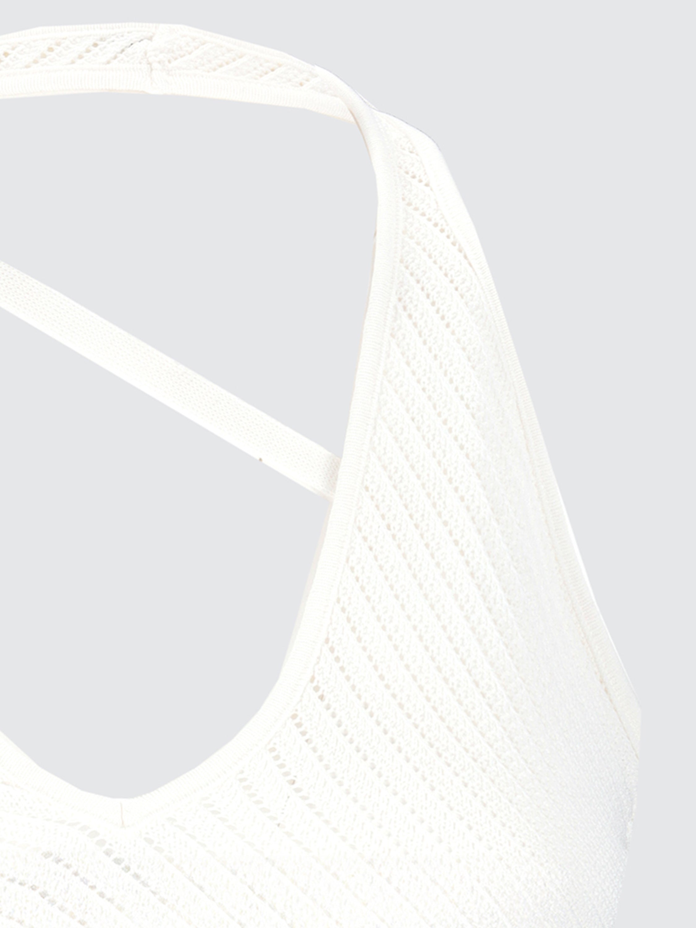 Novità dell'ultima collezione Spring Summer 2025 di Laneus, il costume intero è lavorato in filato di viscosa caratterizzato da un punto traforato diagonale. Il modello sgambato, disegnato con uno scollo oblò, si distingue per le spalline incrociate lungo la schiena. Un look di tendenza lo vede indossato anche fuori dall'acqua, con un caftano o camicie bowling.