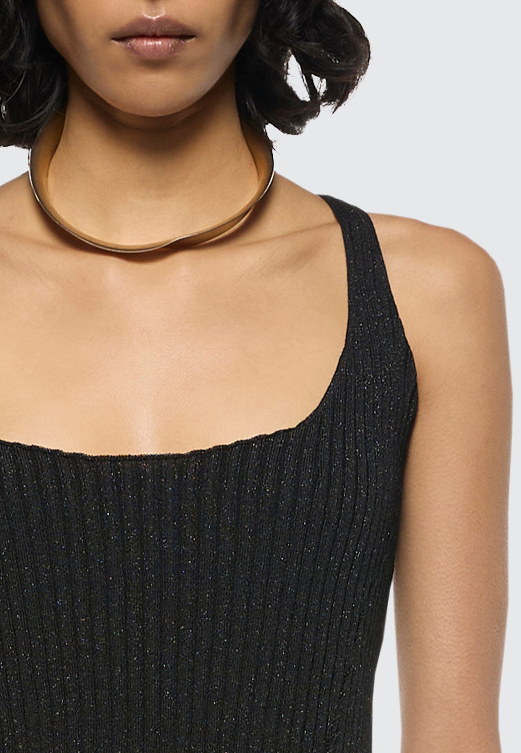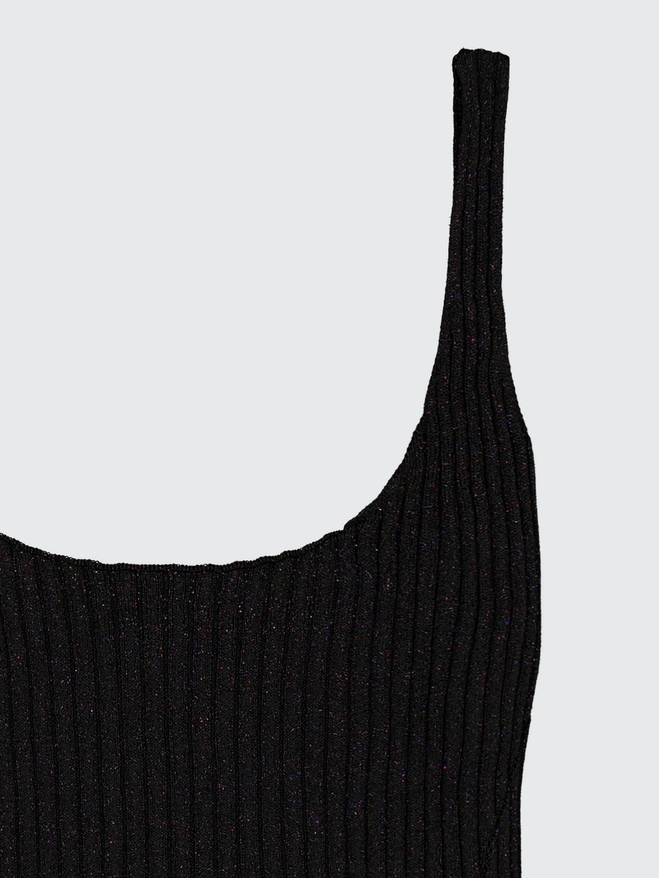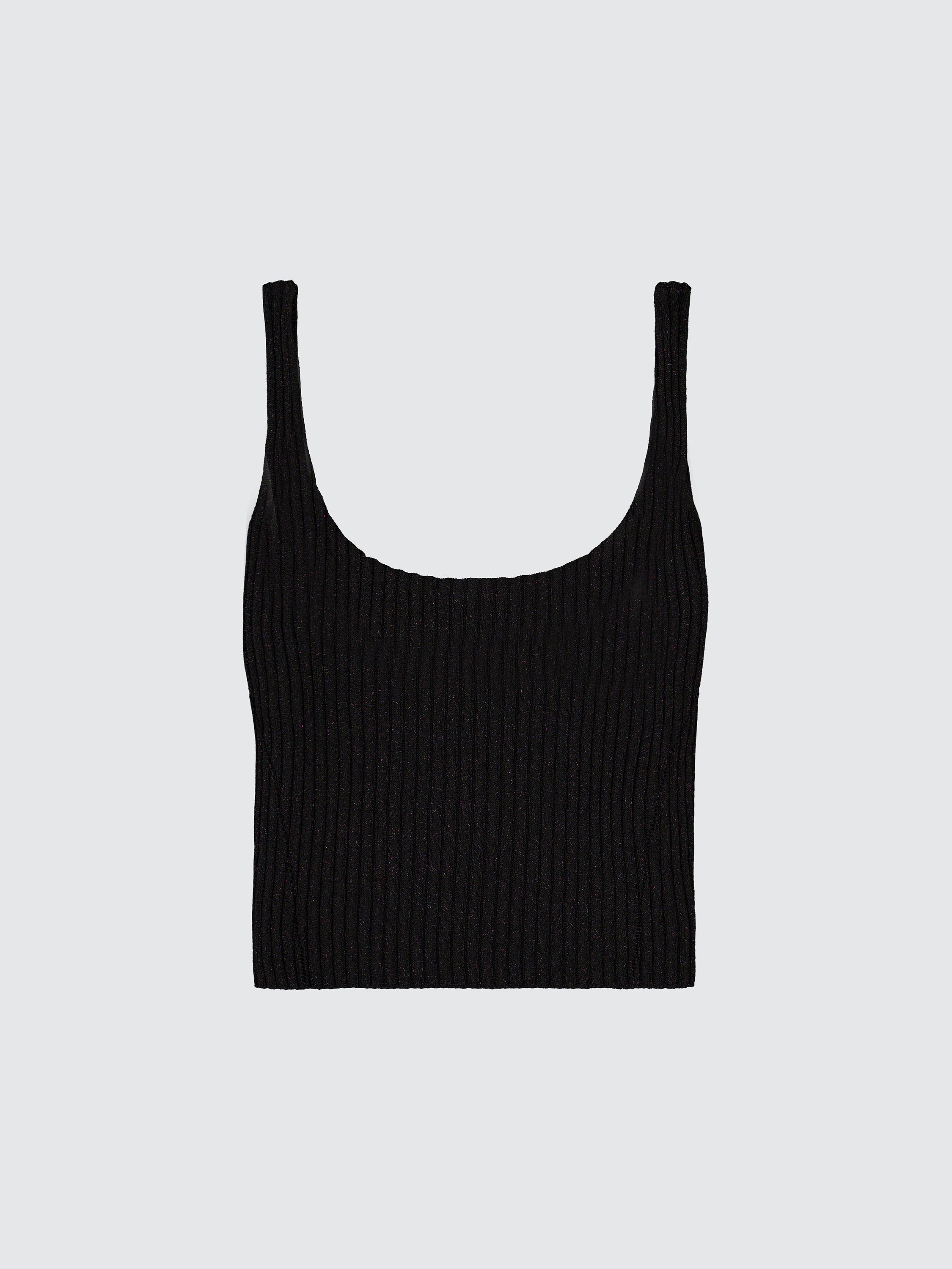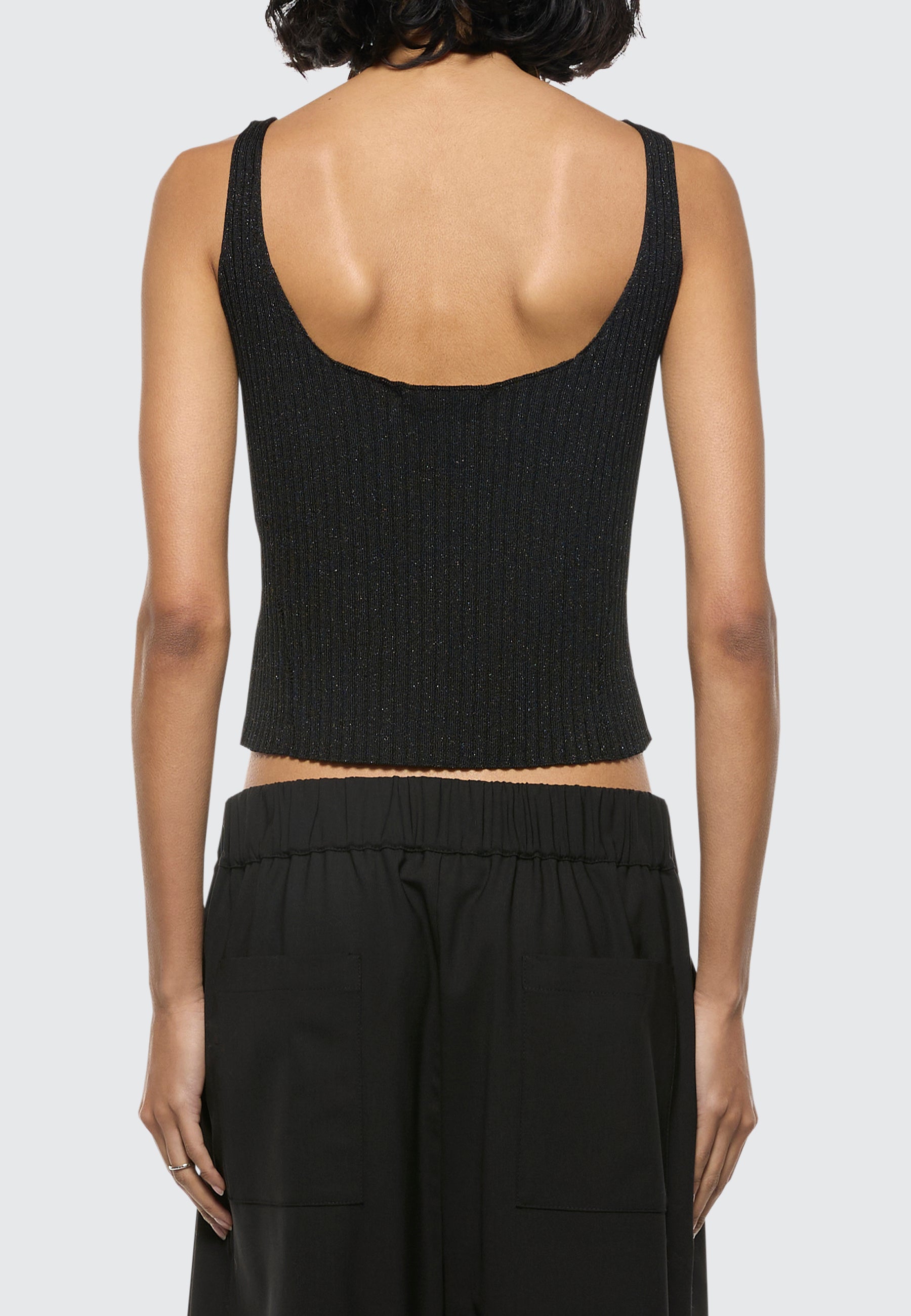 Il top di Laneus dalla silhouette boxy è realizzato in maglia con luminoso filo lurex a coste larghe e ha uno scollo e spalline ampie. La modella è alta 180 cm ed indossa una 40/S.