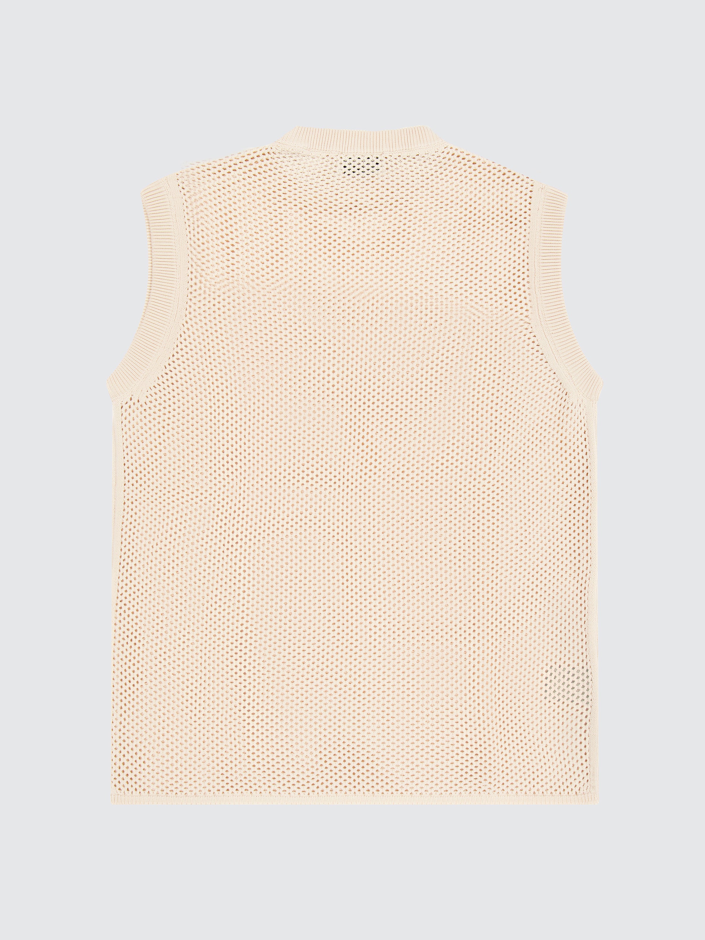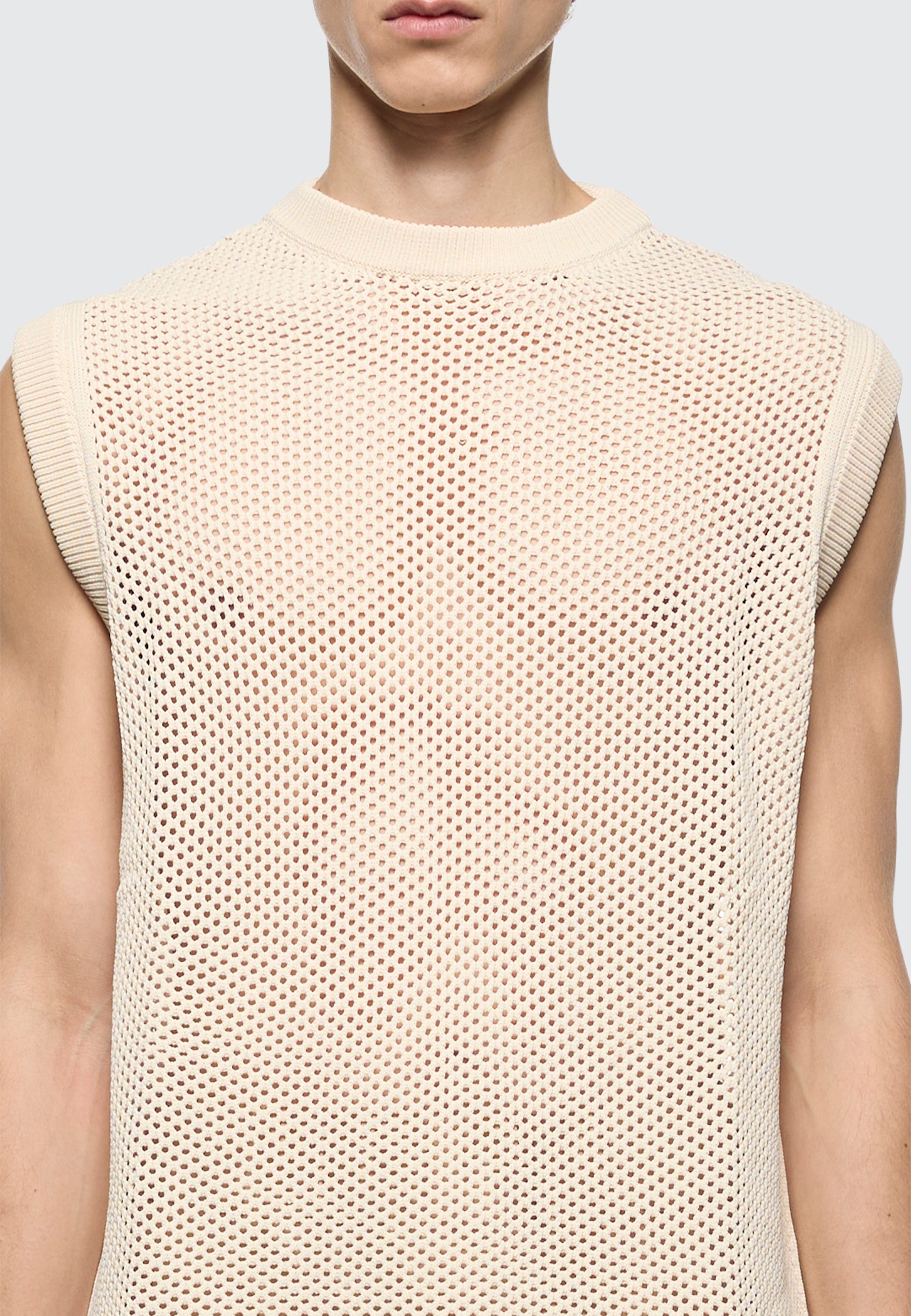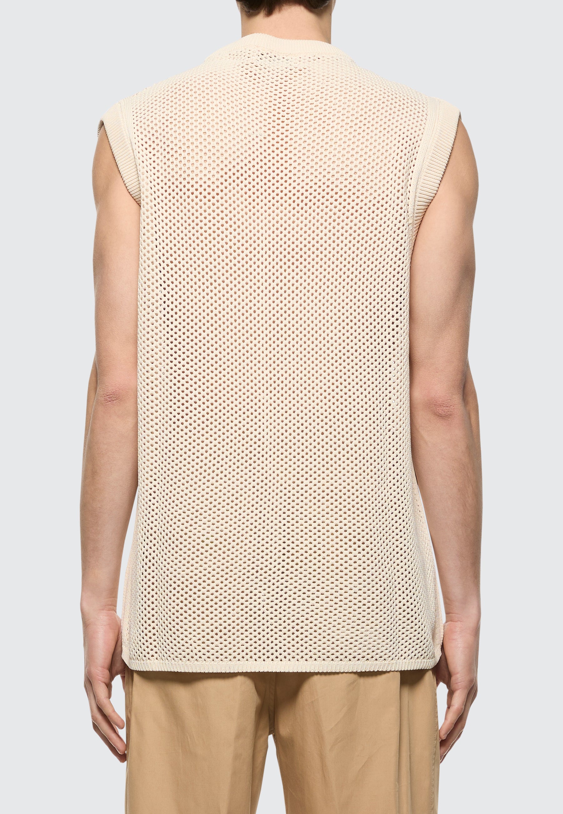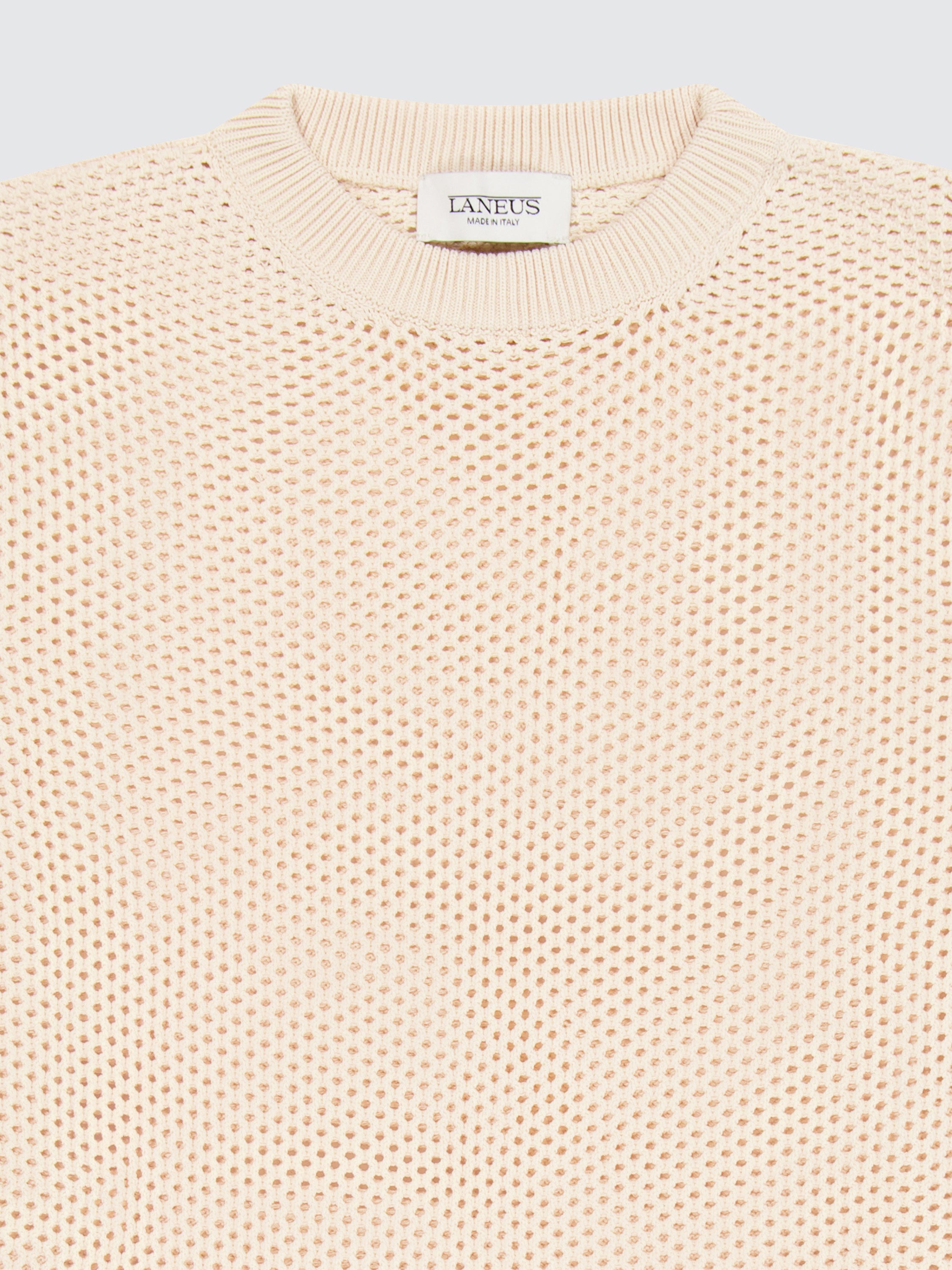 Il top di Laneus è realizzato in filato di viscosa caratterizzato da lavorazione in punto rete e presenta una silhouette boxy con scollo rotondo e ampio giromanica con rifinitura a coste. Made in Italy.