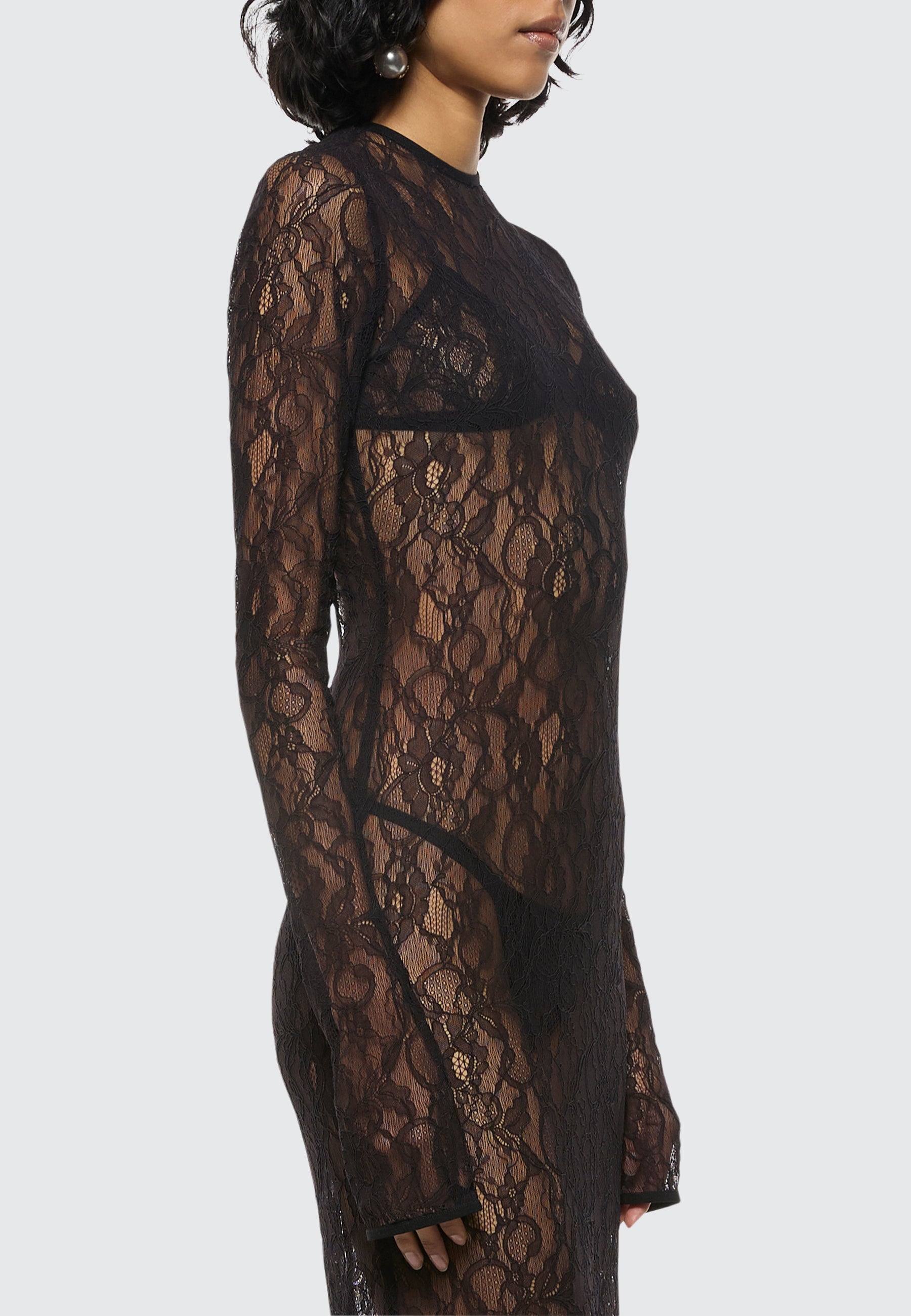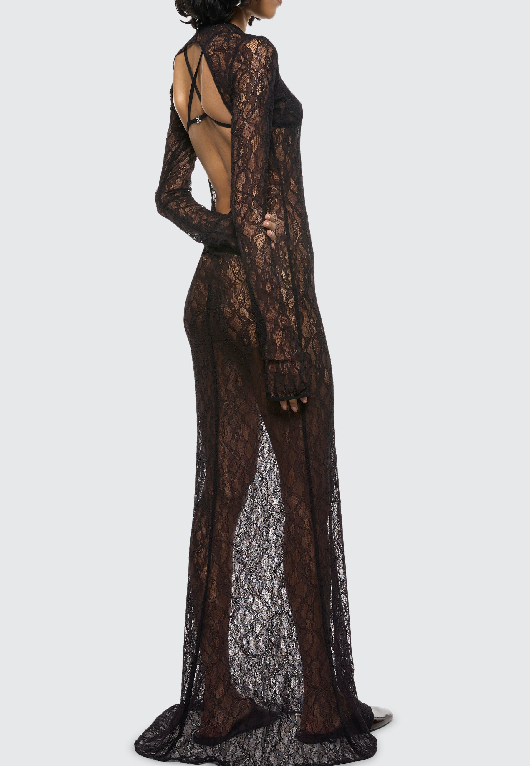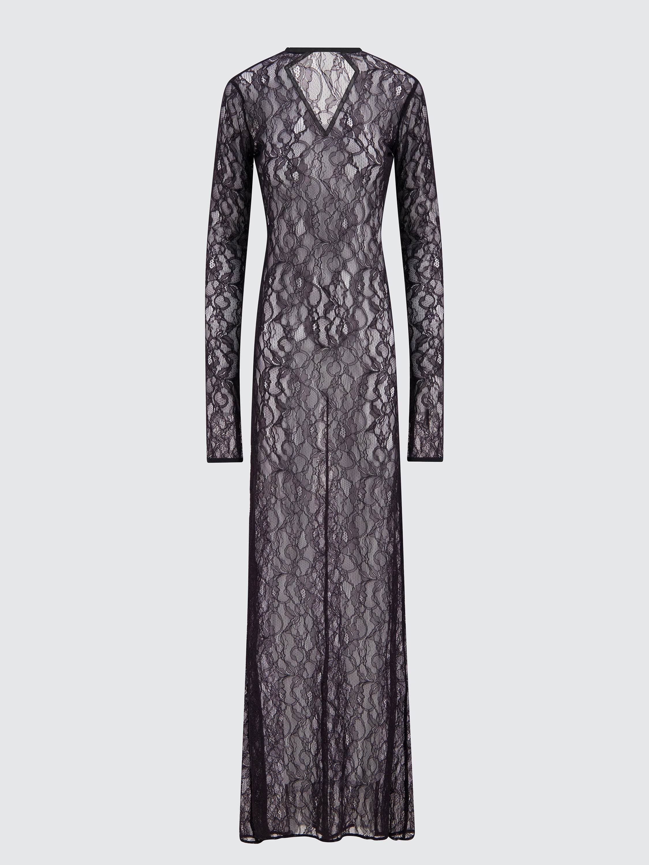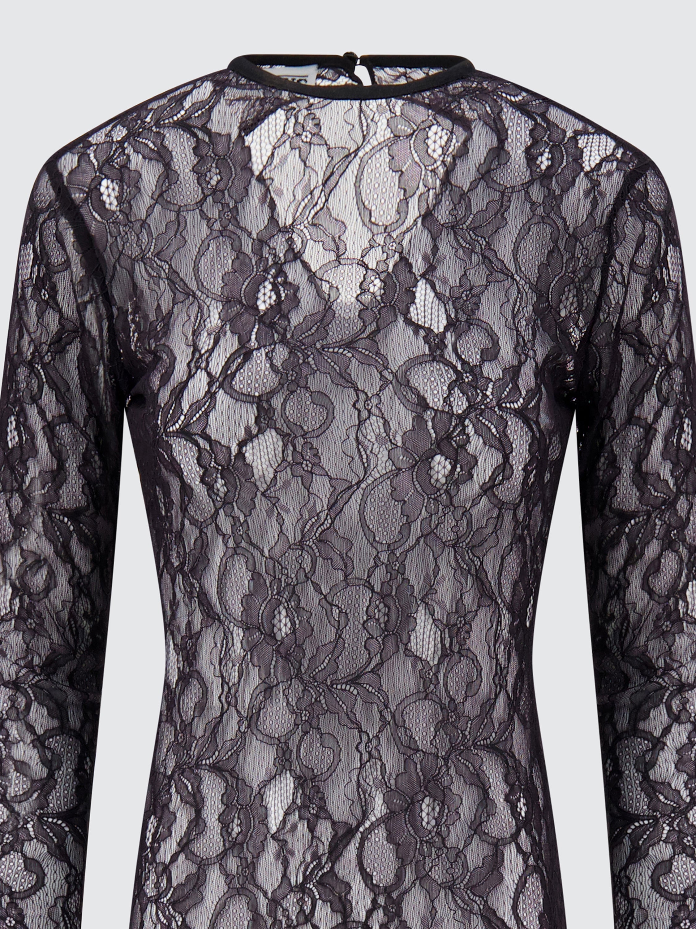 Portate questo abito lungo di Laneus nella vostra prossima soirée. Questo abito lungo dalla silhouette slim è realizzato in pizzo chantilly, una scollatura rotonda e taglio oblò sulla schiena. La modella è alta 180 cm ed indossa una 40/S.