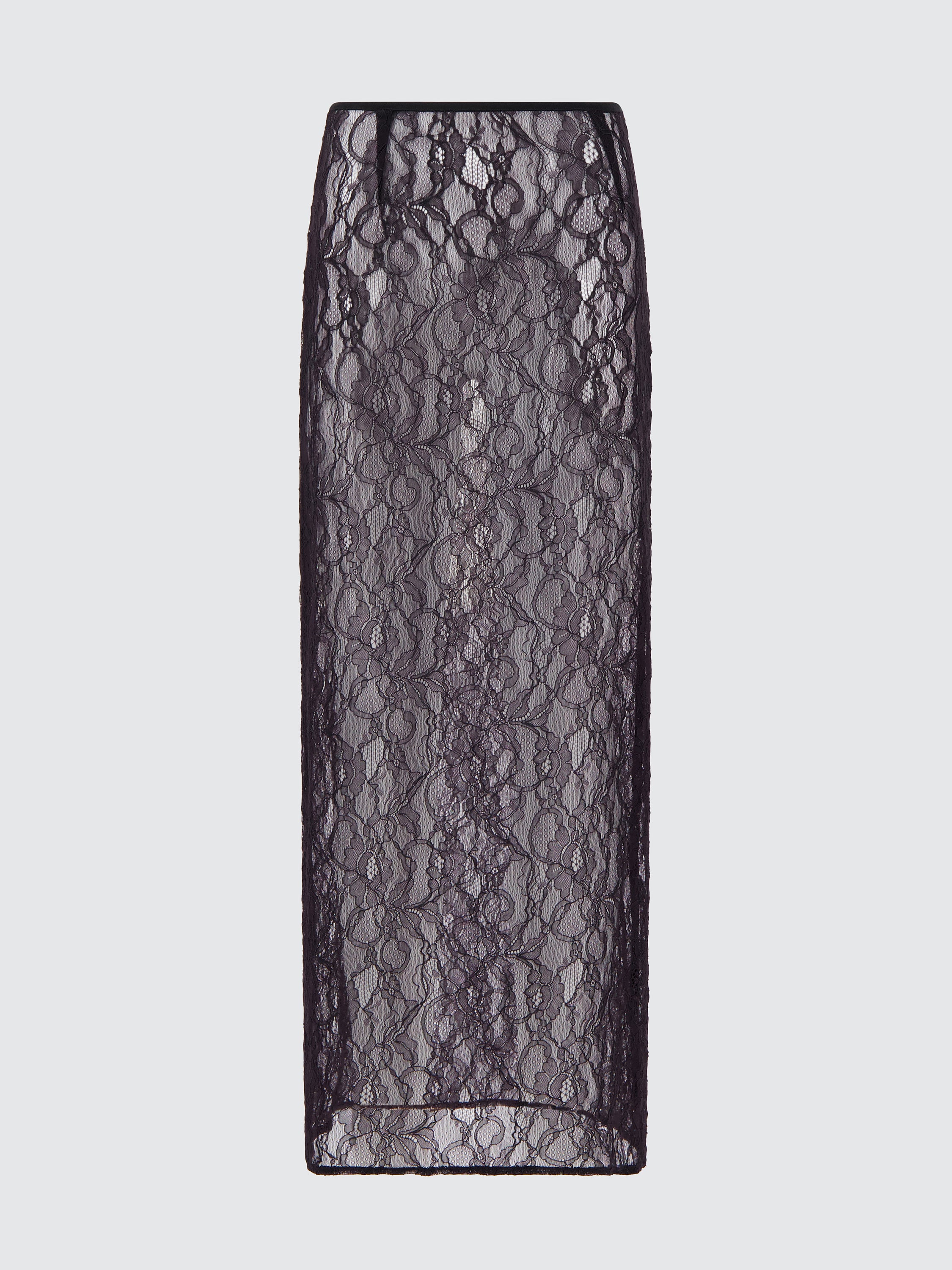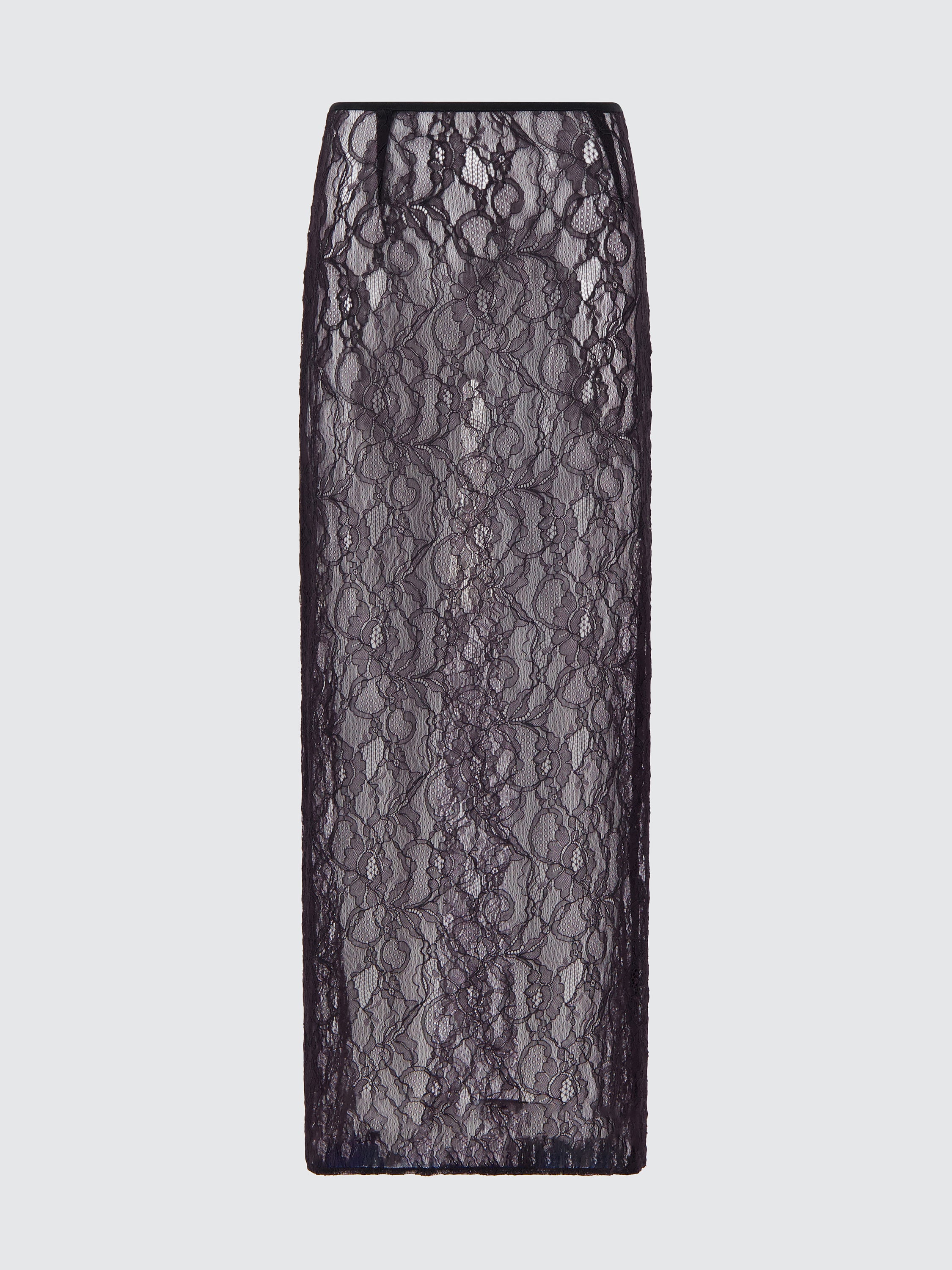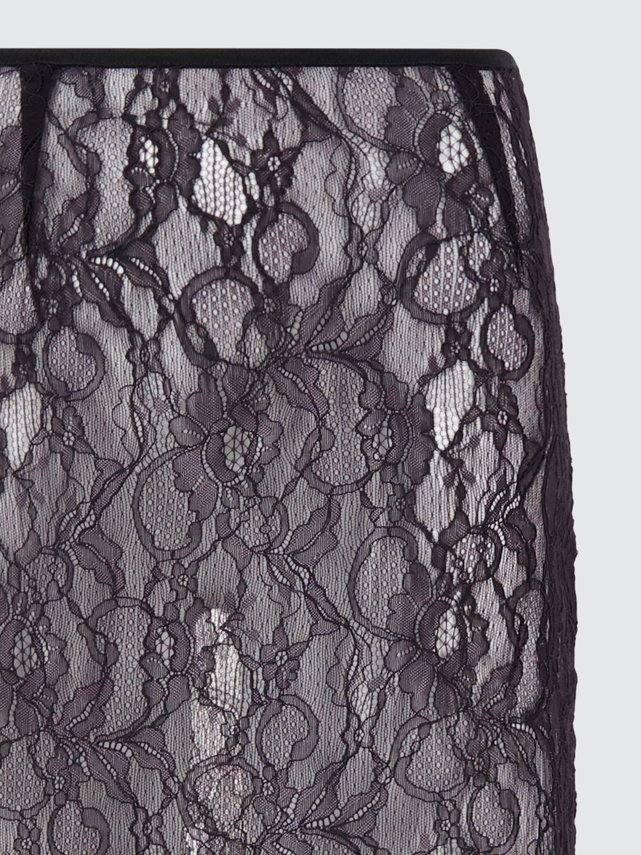 Uno studio sul guardaroba femminile che fonde lusso e audacia caratterizza questa gonna modello longuette realizzata in pizzo chantilly firmata Laneus. Presenta una silhouette slim dal taglio dritto. La modella è alta 180 cm ed indossa una 40/S.