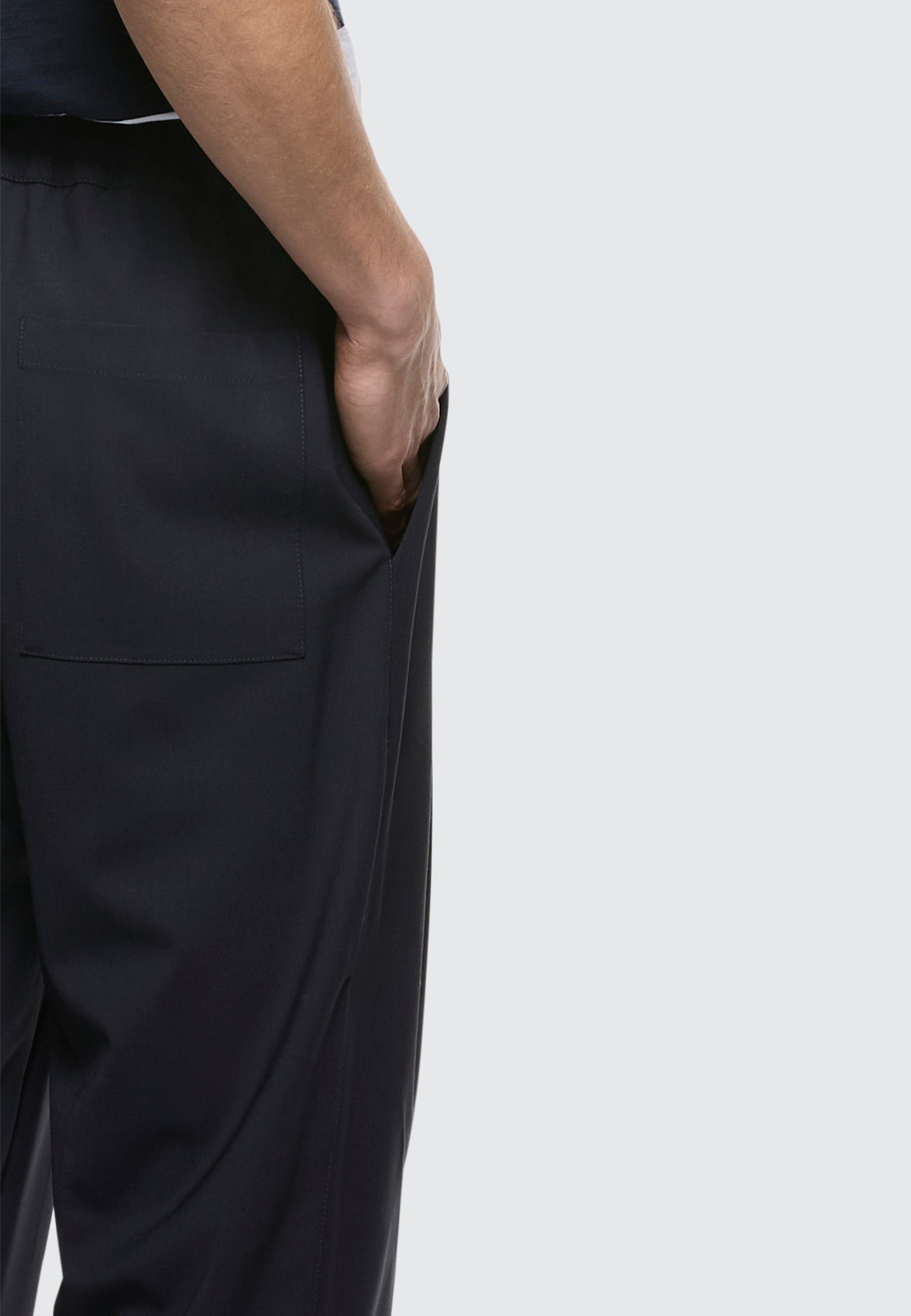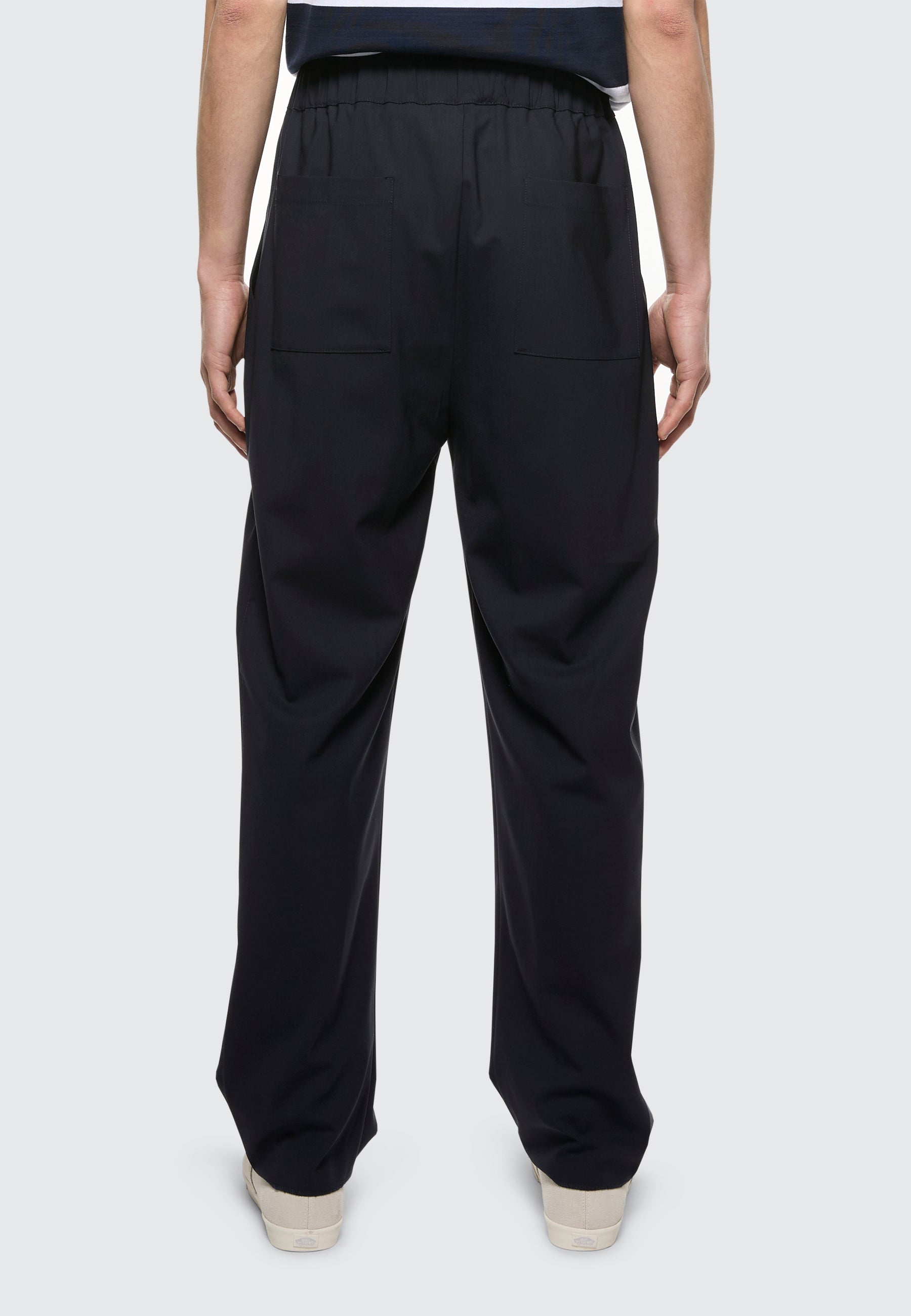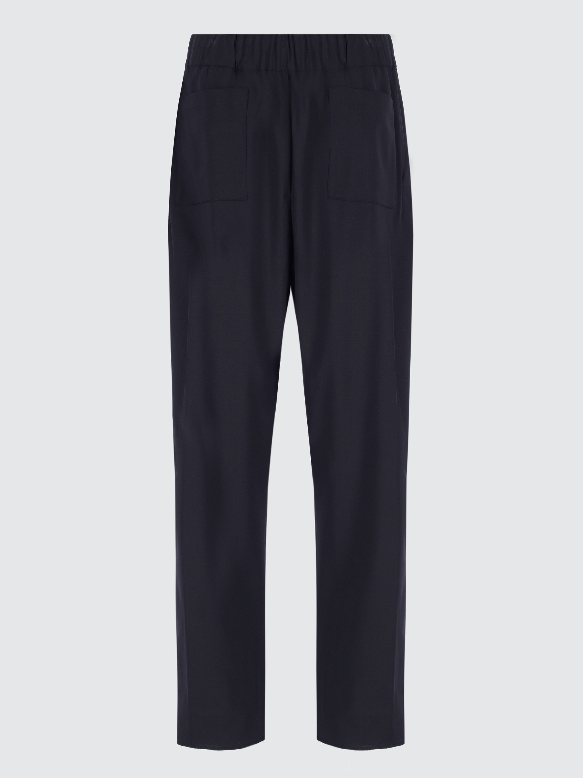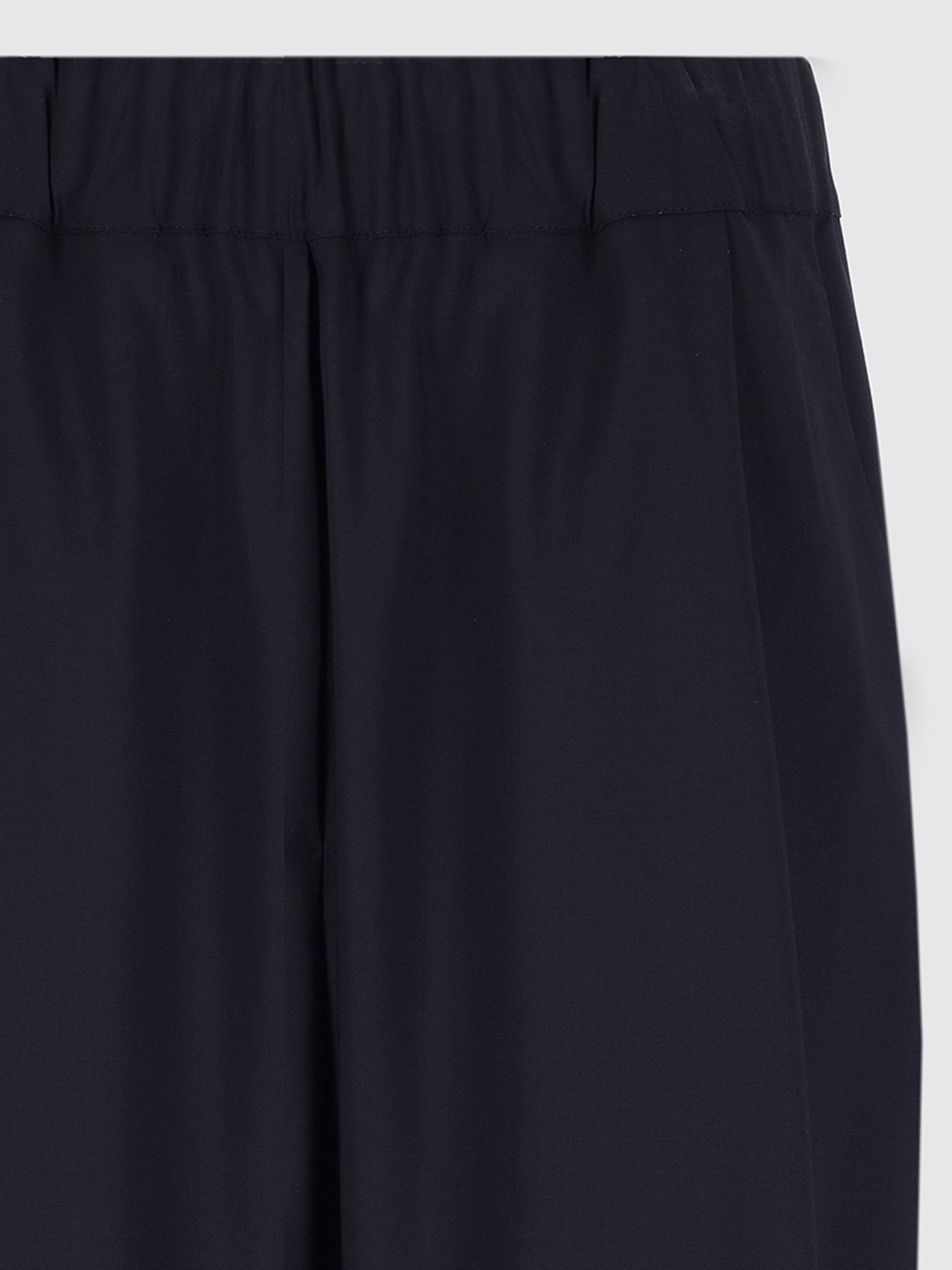 Pantalone a gamba larga monopence di Laneus è realizzato in leggerissima tela di lana, presenta una vita con elastico arricciato e tasca americana. Il modello è alto 190 cm ed indossa una 48/M