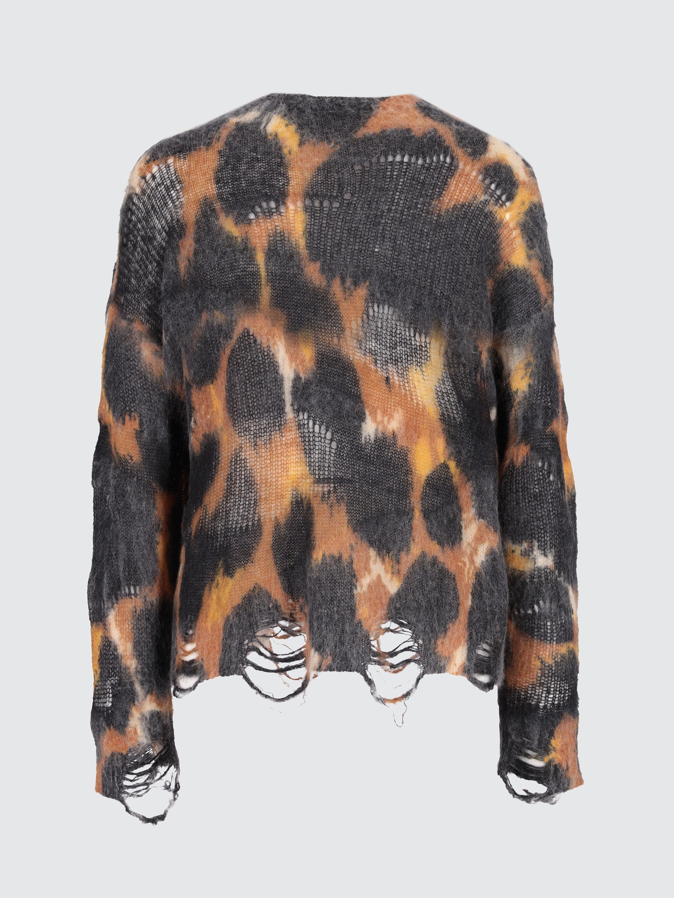 Maglia girocollo oversize firmata Laneus, realizzata in pregiato baby alpaca. Il capo è caratterizzato da una stampa maculata all over e arricchito da un effetto stramato con rotture su fondo, maniche e collo, che donano un'estetica destroyed contemporanea e grintosa. Lavorazione jacquard. Made in Italy.