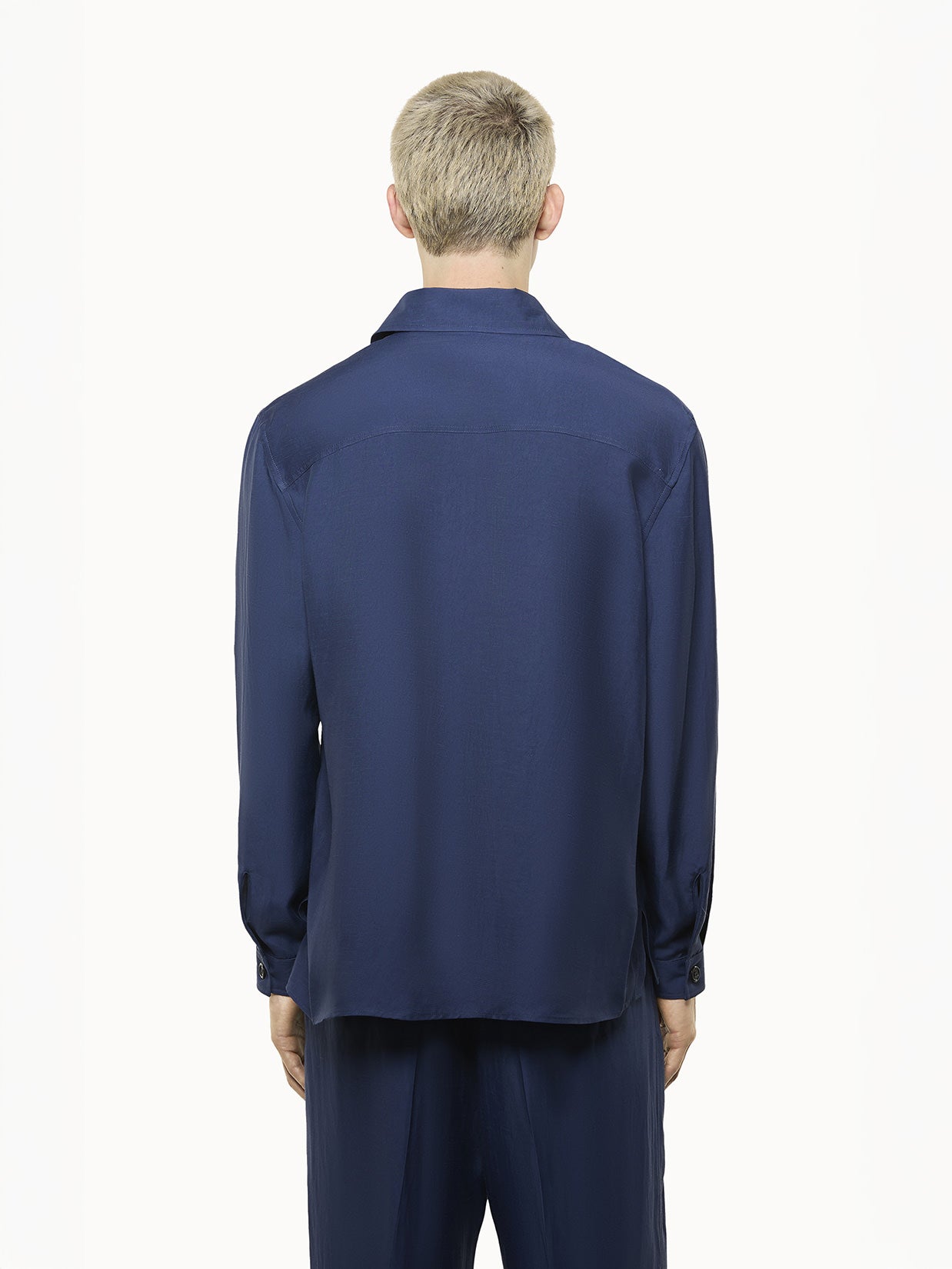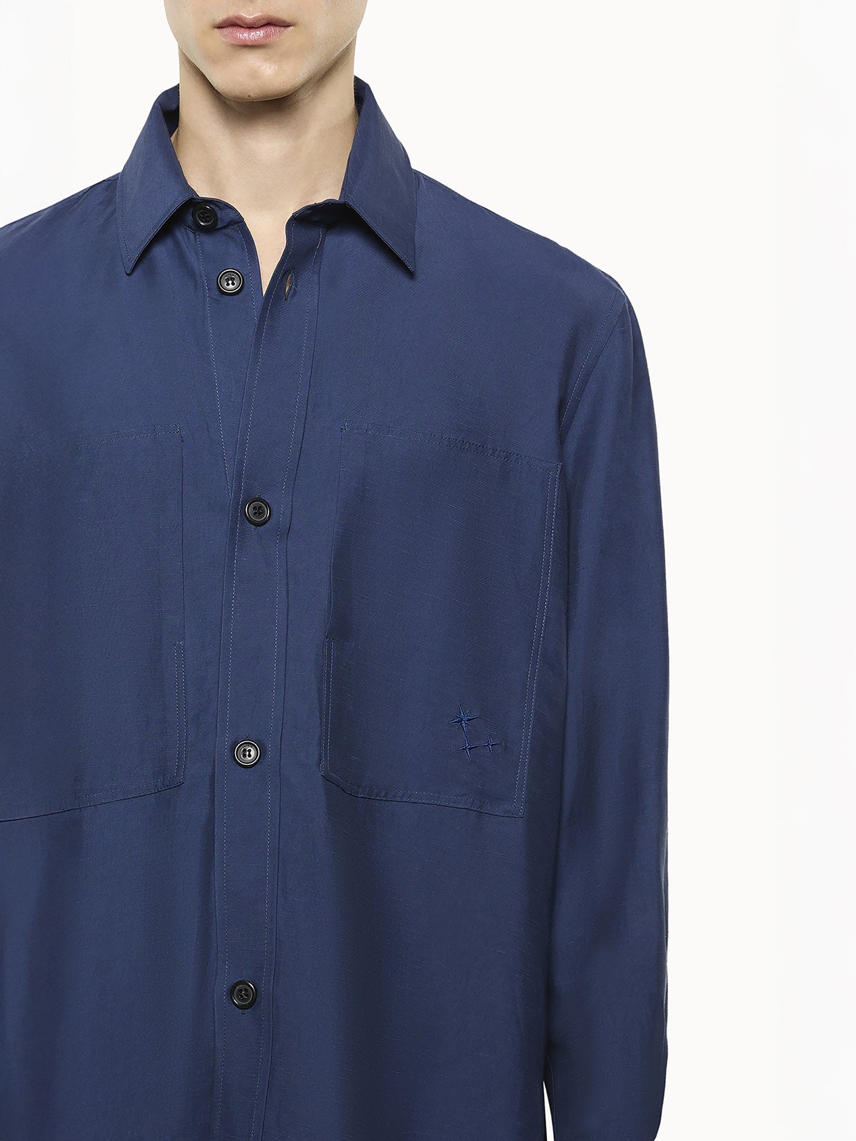 Overshirt in viscosa e lino con bottoni frontali. Doppia maxi tasca caratterizzata da ricamo ton sur ton. Vestibilità over. Made in Italy.