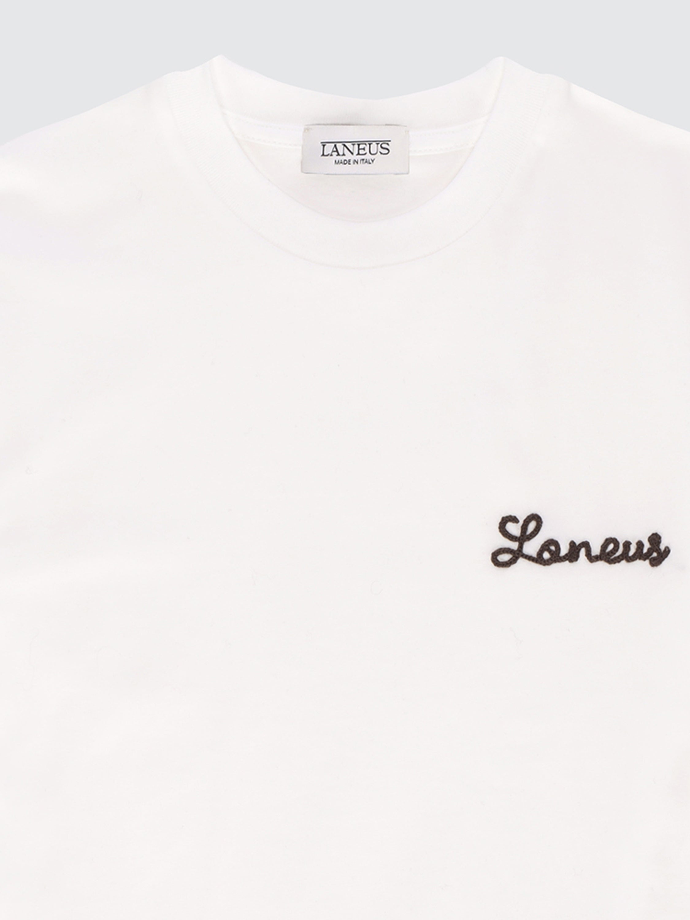 T-shirt da bambino/a firmata Laneus, realizzata in morbido jersey di puro cotone. La silhouette regular presenta maniche corte, girocollo a costine e una raffinata scritta “Laneus” ricamata sul petto in corsivo con punto catenella Cornely.