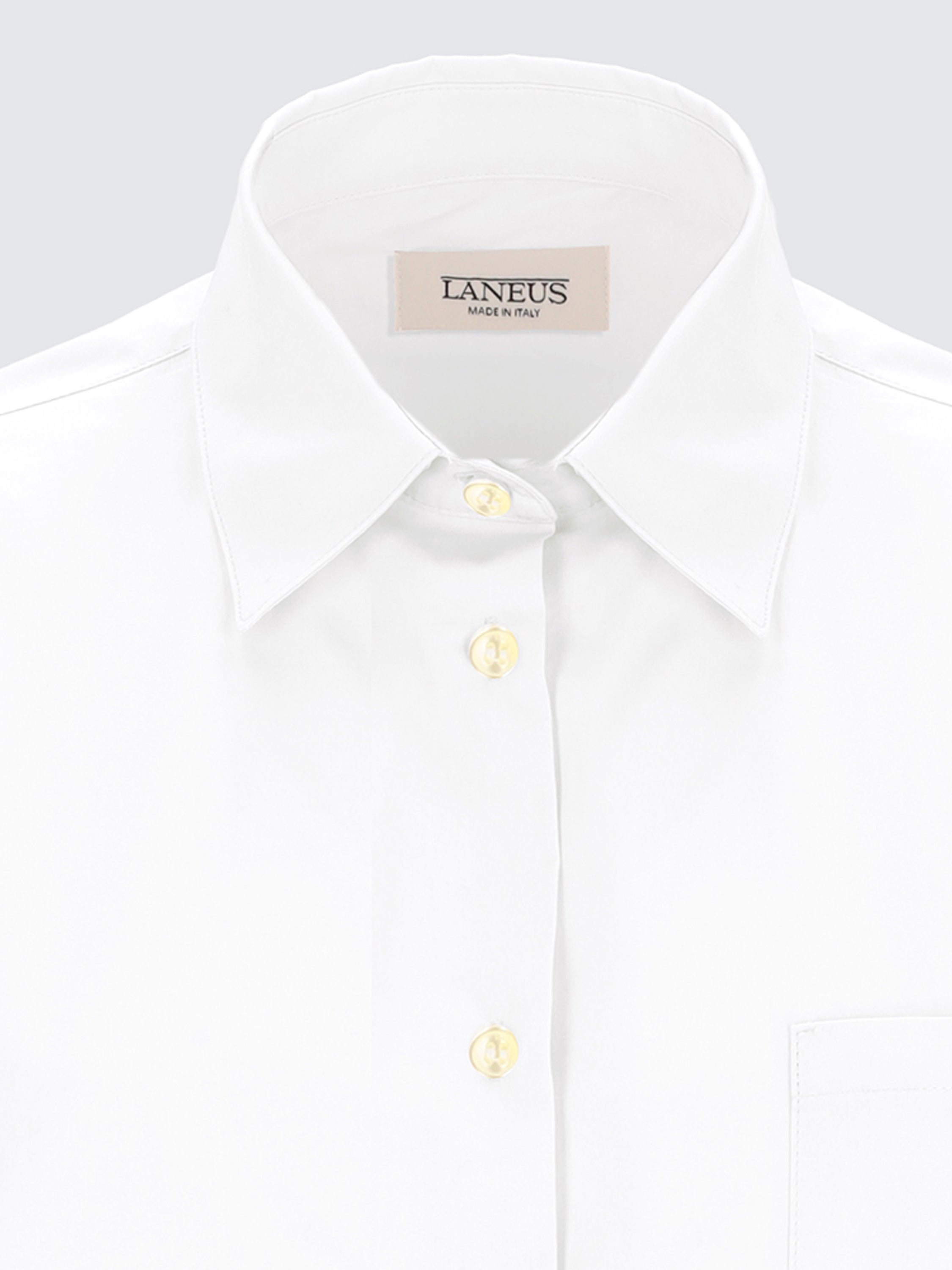 La camicia di Laneus è realizzata in popeline di cotone e presenta una silhouette oversize, un colletto all'italiana con chiusura button-down e un taschino a toppa sul lato. La modella è alta 180 cm ed indossa una 40/S.