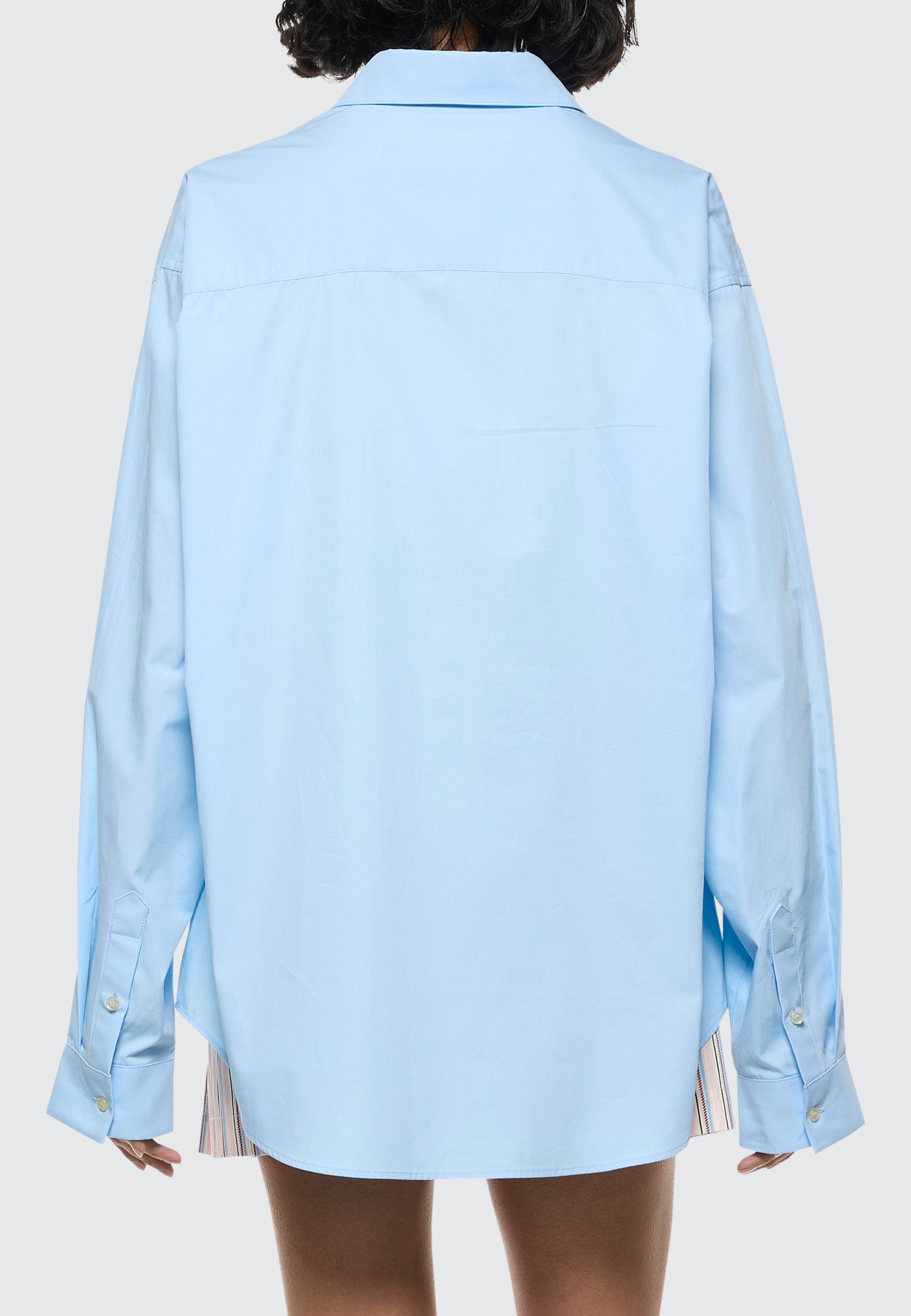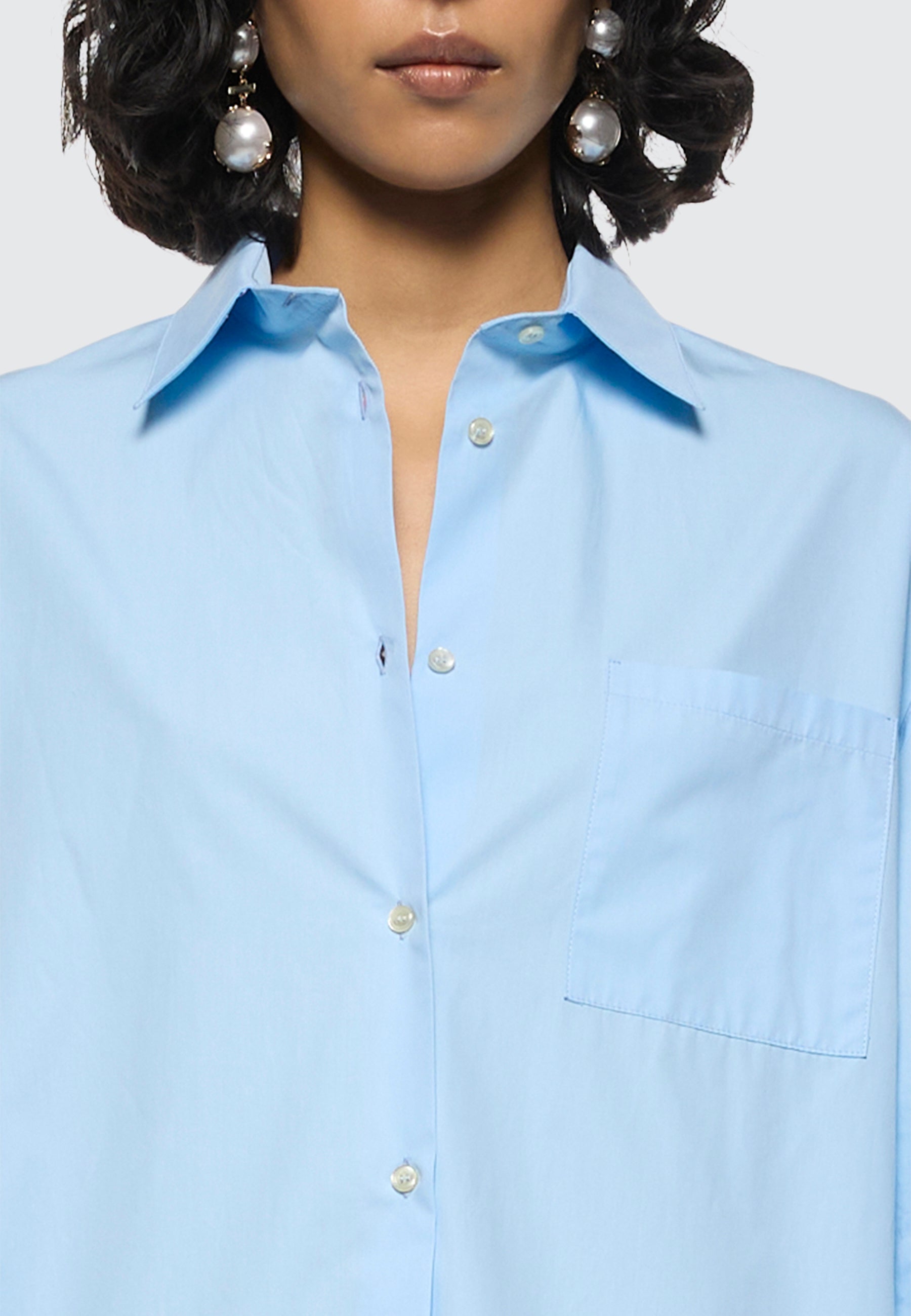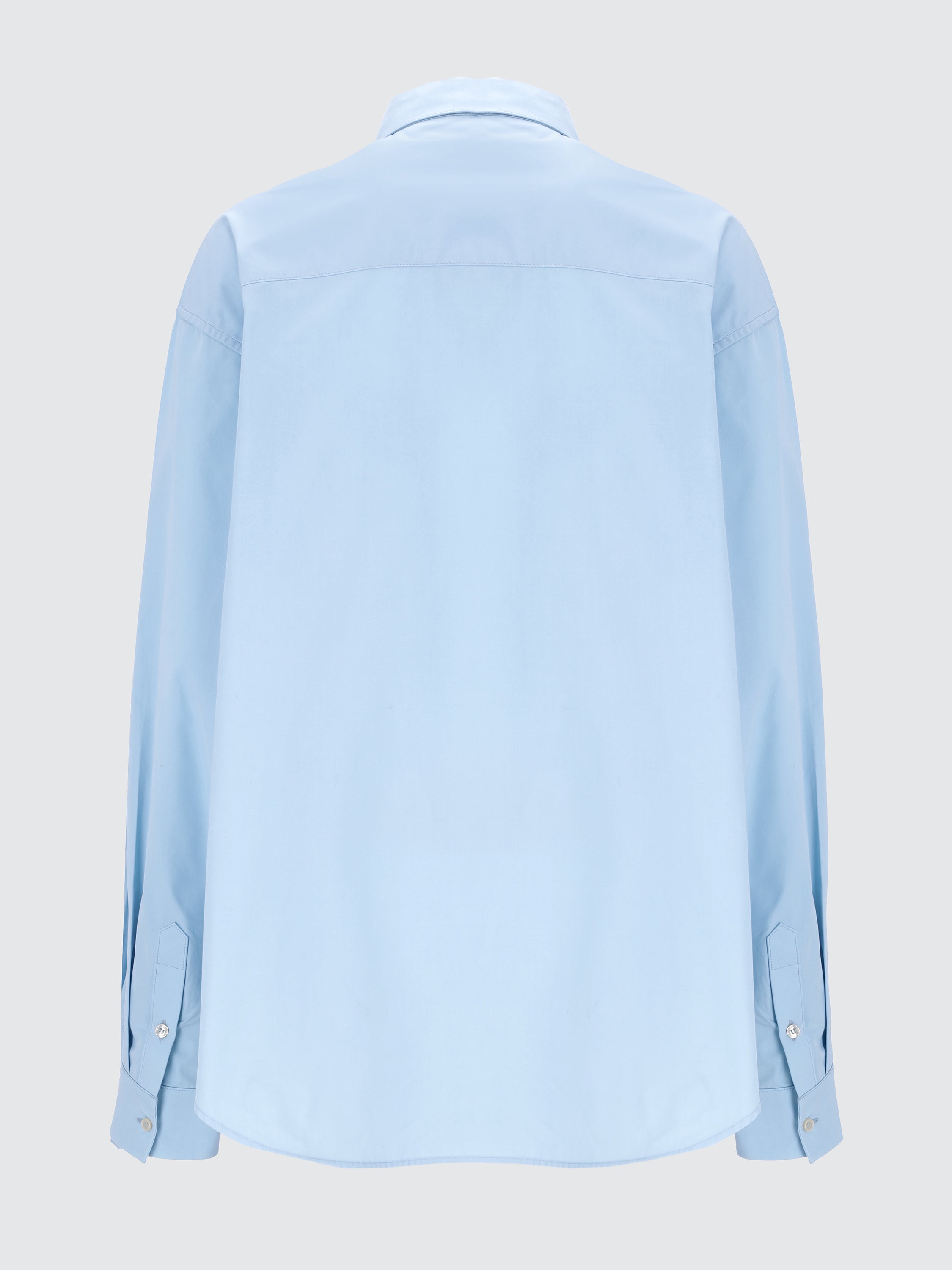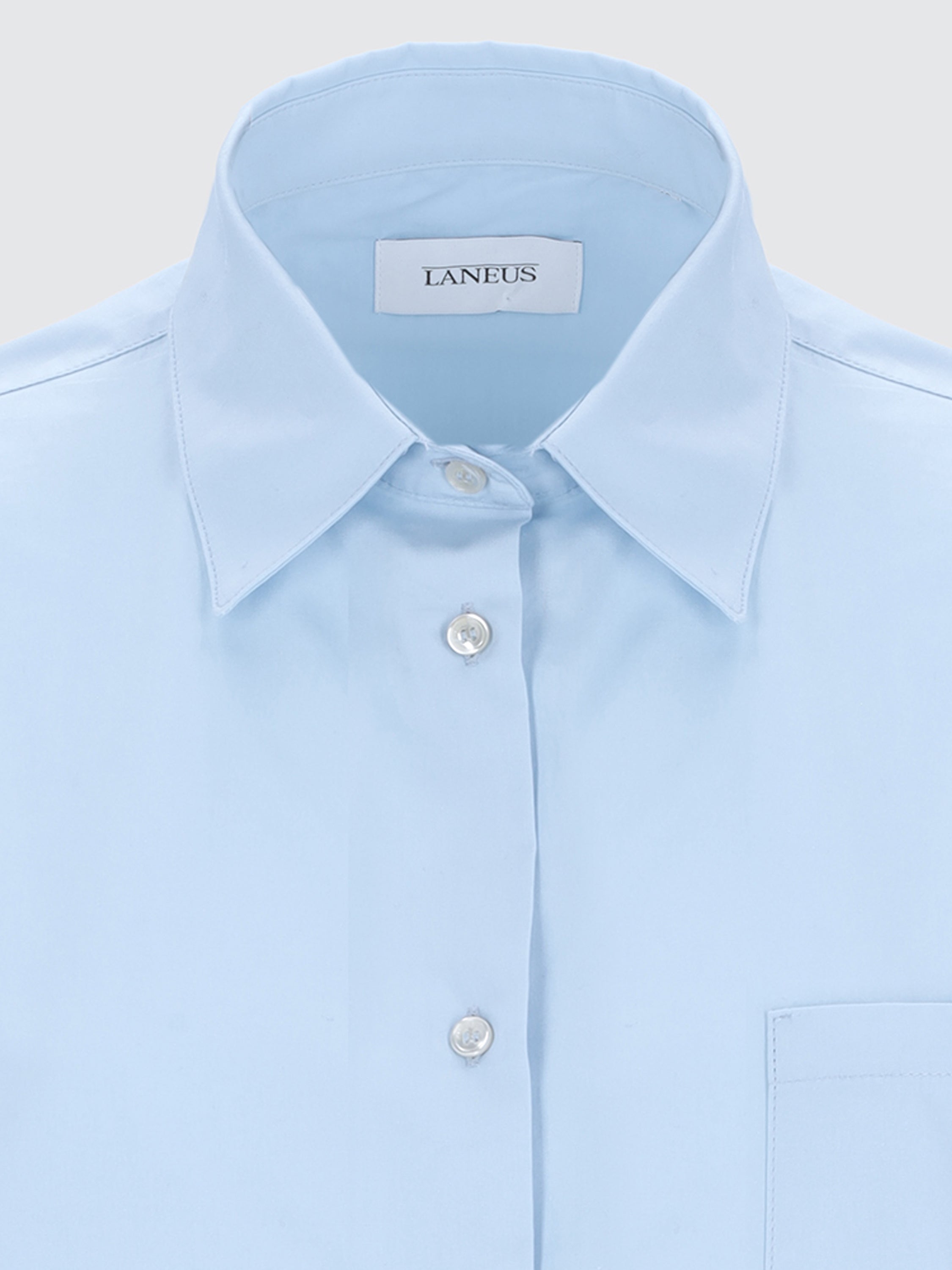 La camicia di Laneus è realizzata in popeline di cotone e presenta una silhouette oversize, un colletto all'italiana con chiusura button-down e un taschino a toppa sul lato. La modella in foto è alta 180 cm ed indossa una 40/S.