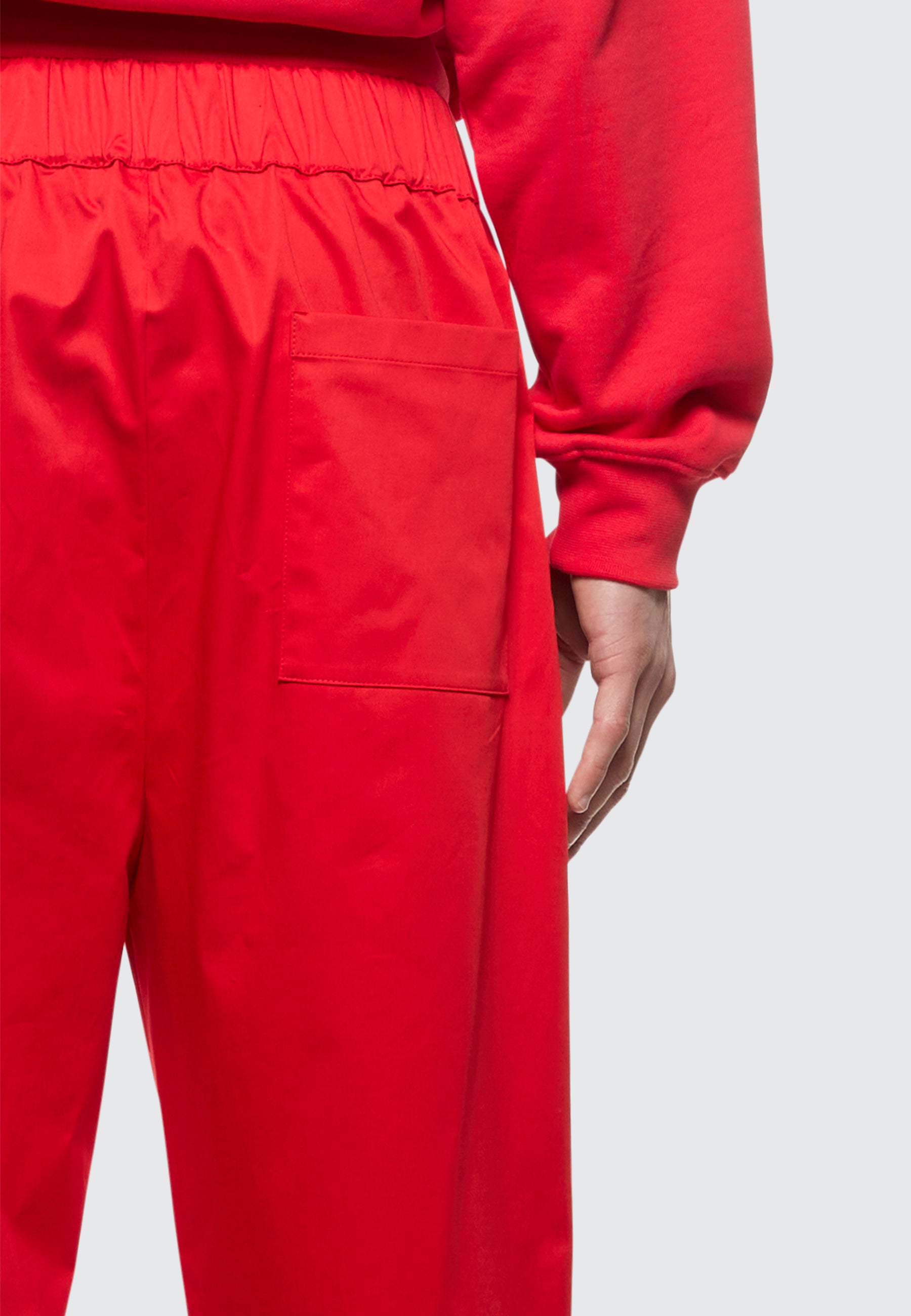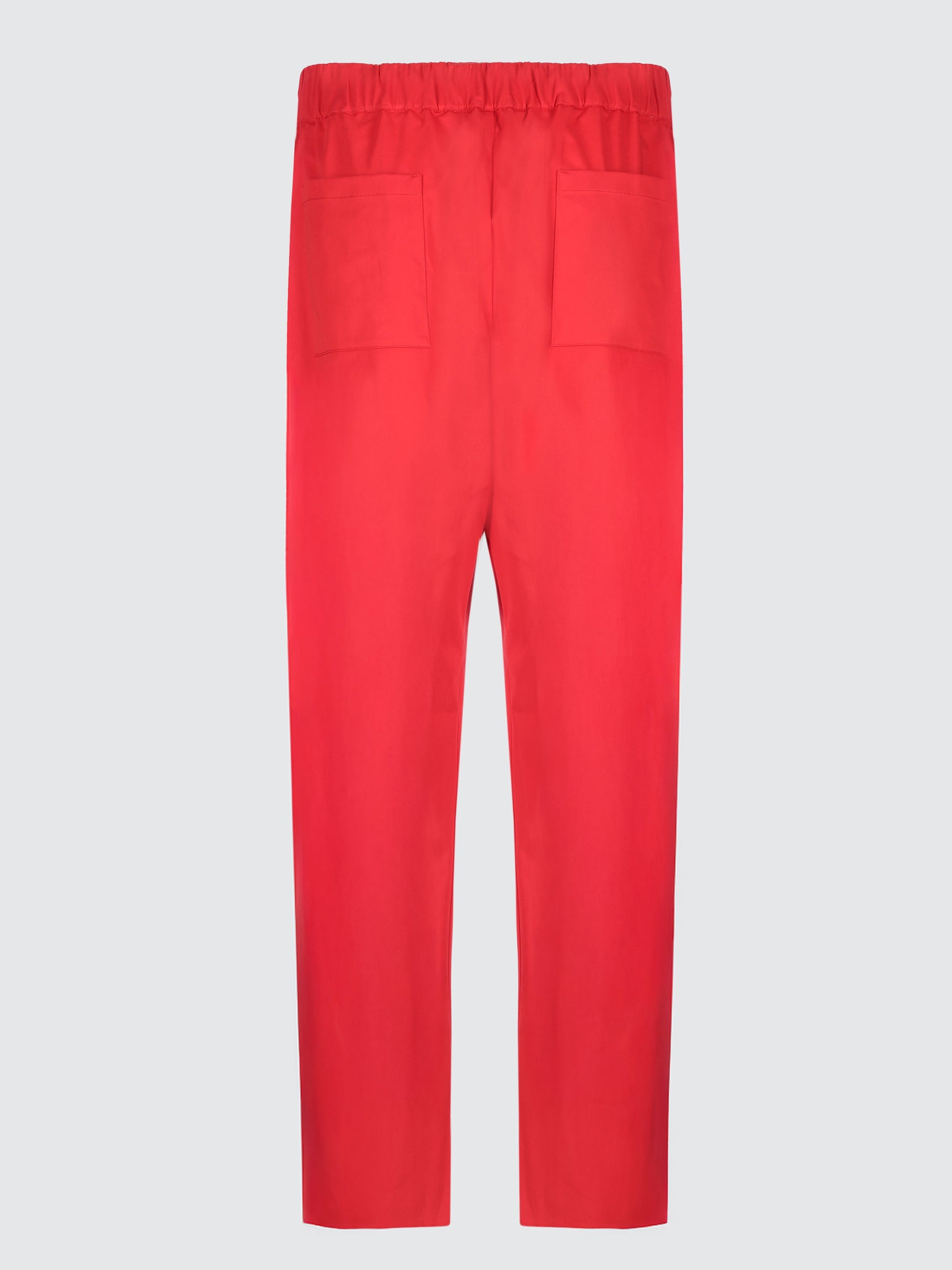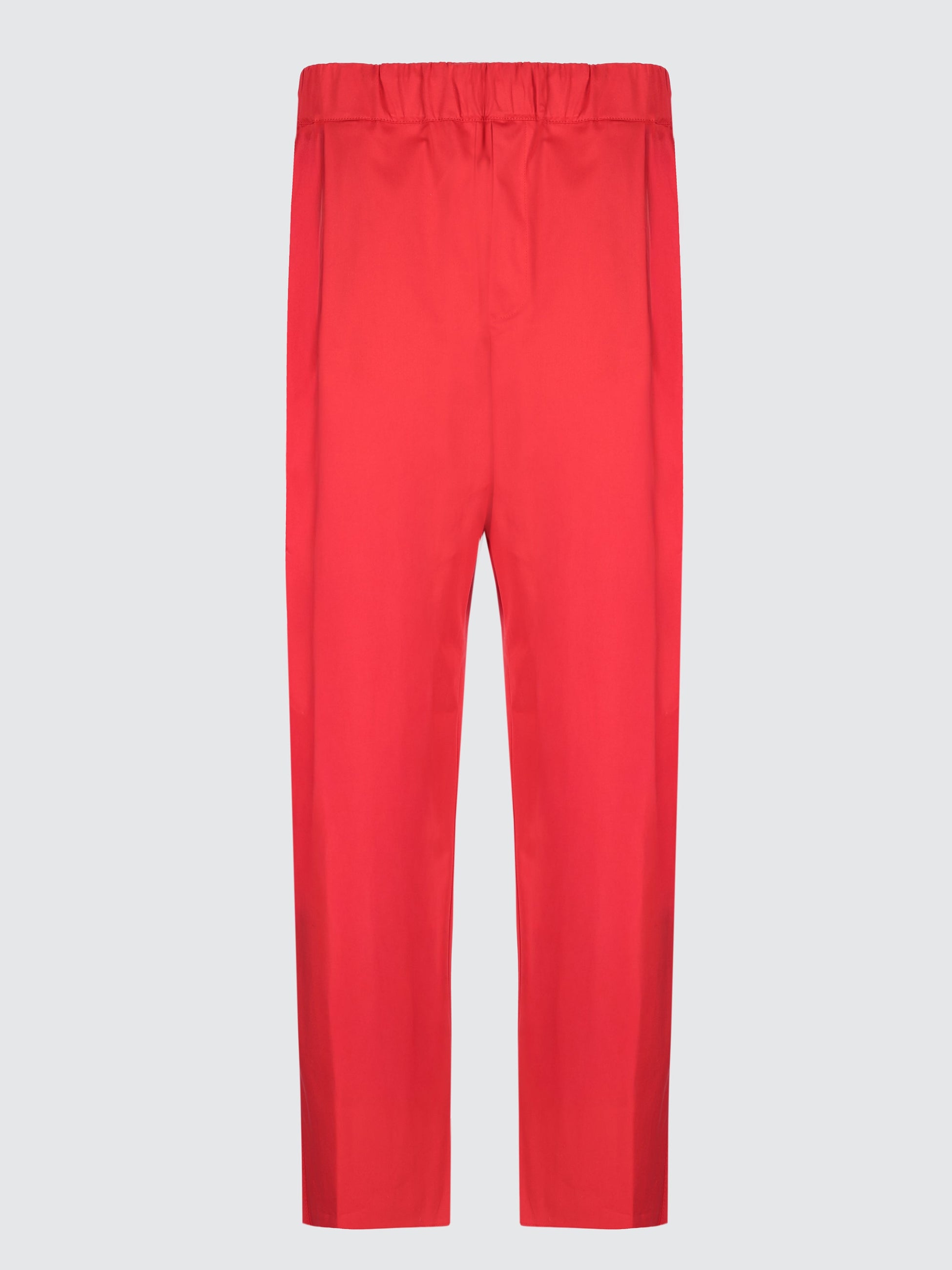 Pantalone a gamba larga monopence di Laneus è realizzato in pregiato raso di cotone, presenta una vita con elastico arricciato e tasca americana. Il modello in foto è alto 190 cm ed indossa una 48/M.