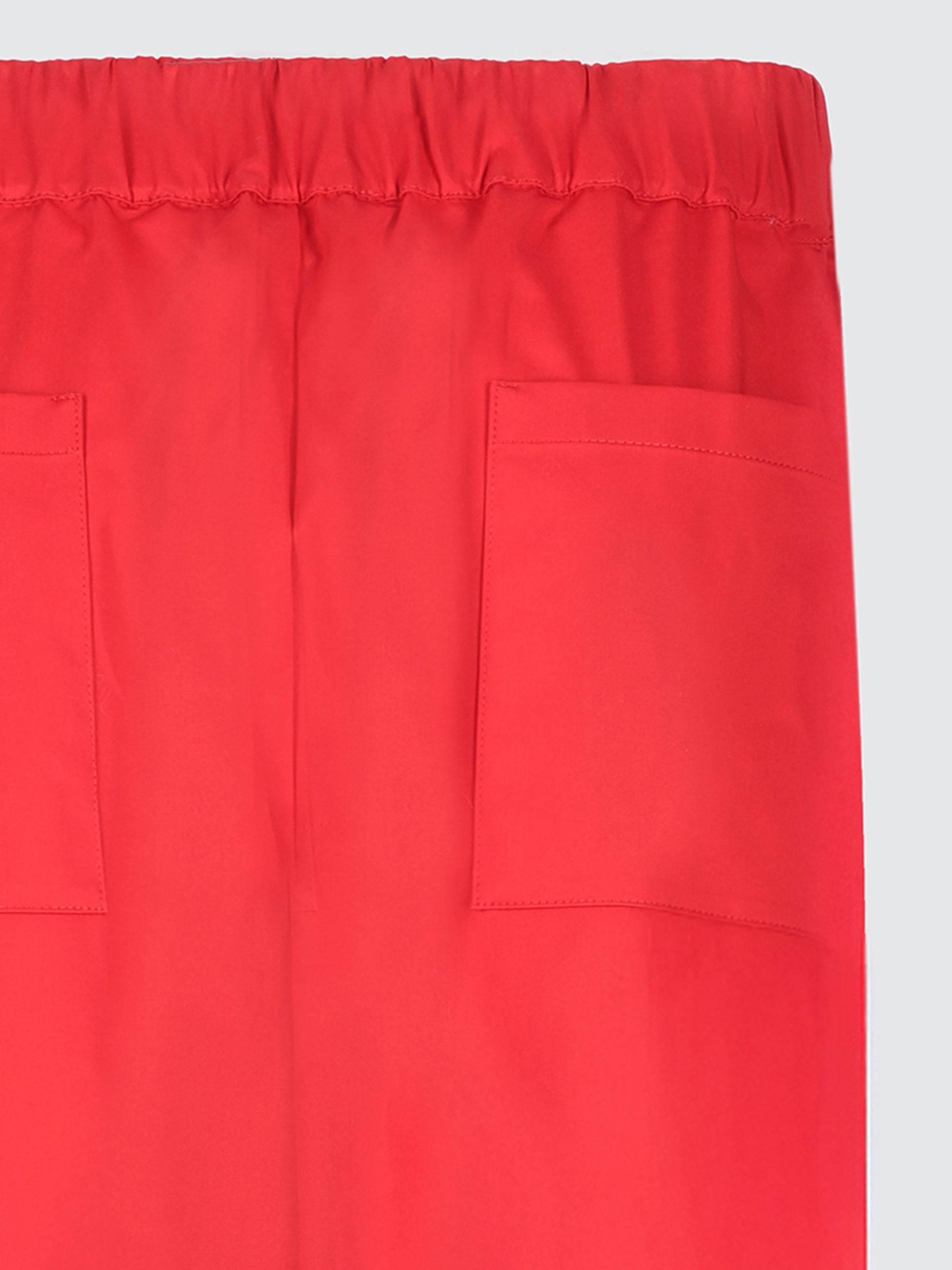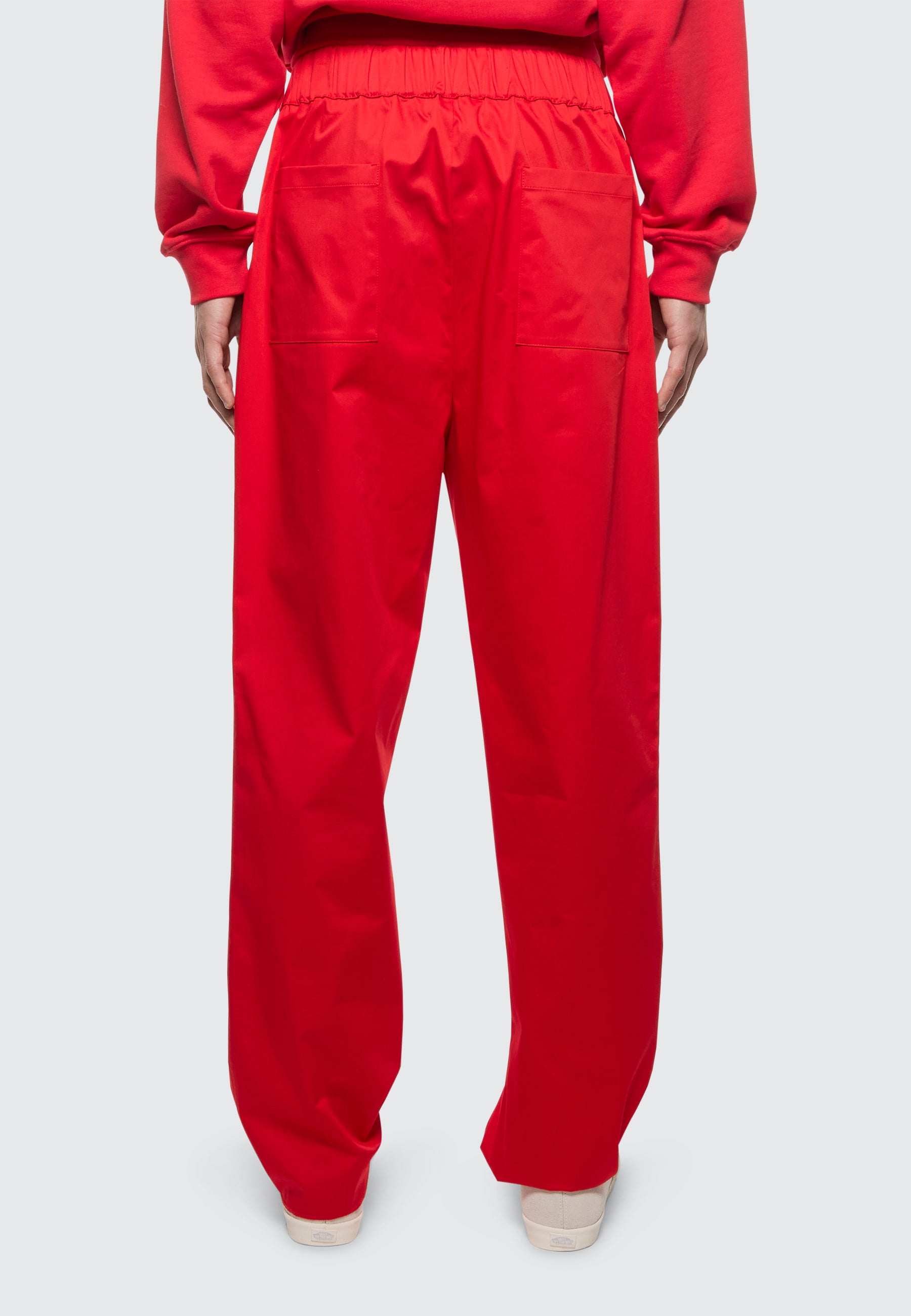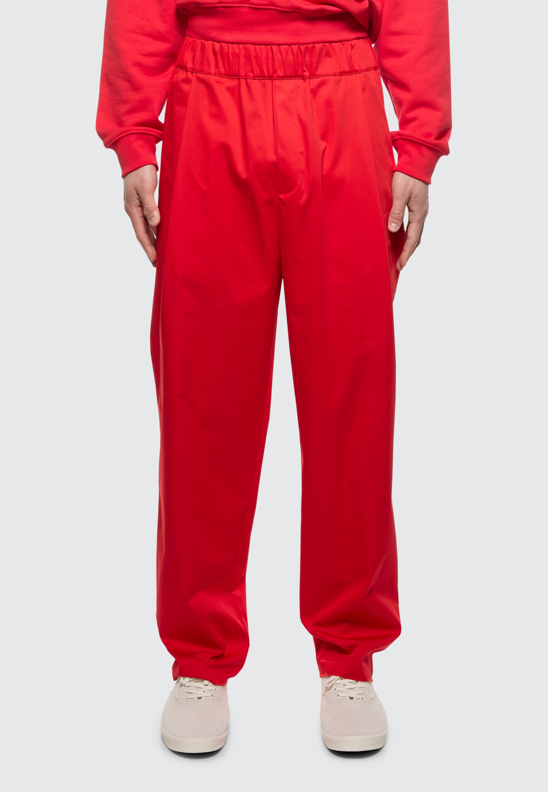 Pantalone a gamba larga monopence di Laneus è realizzato in pregiato raso di cotone, presenta una vita con elastico arricciato e tasca americana. Il modello in foto è alto 190 cm ed indossa una 48/M.
