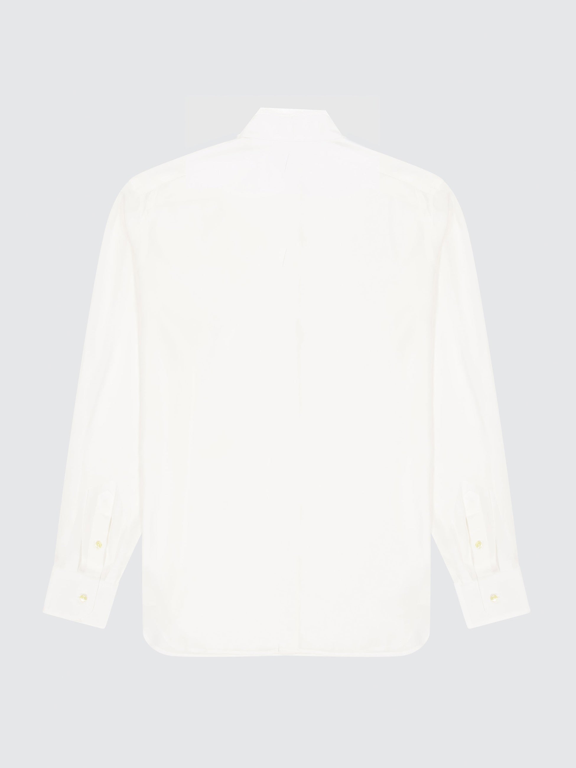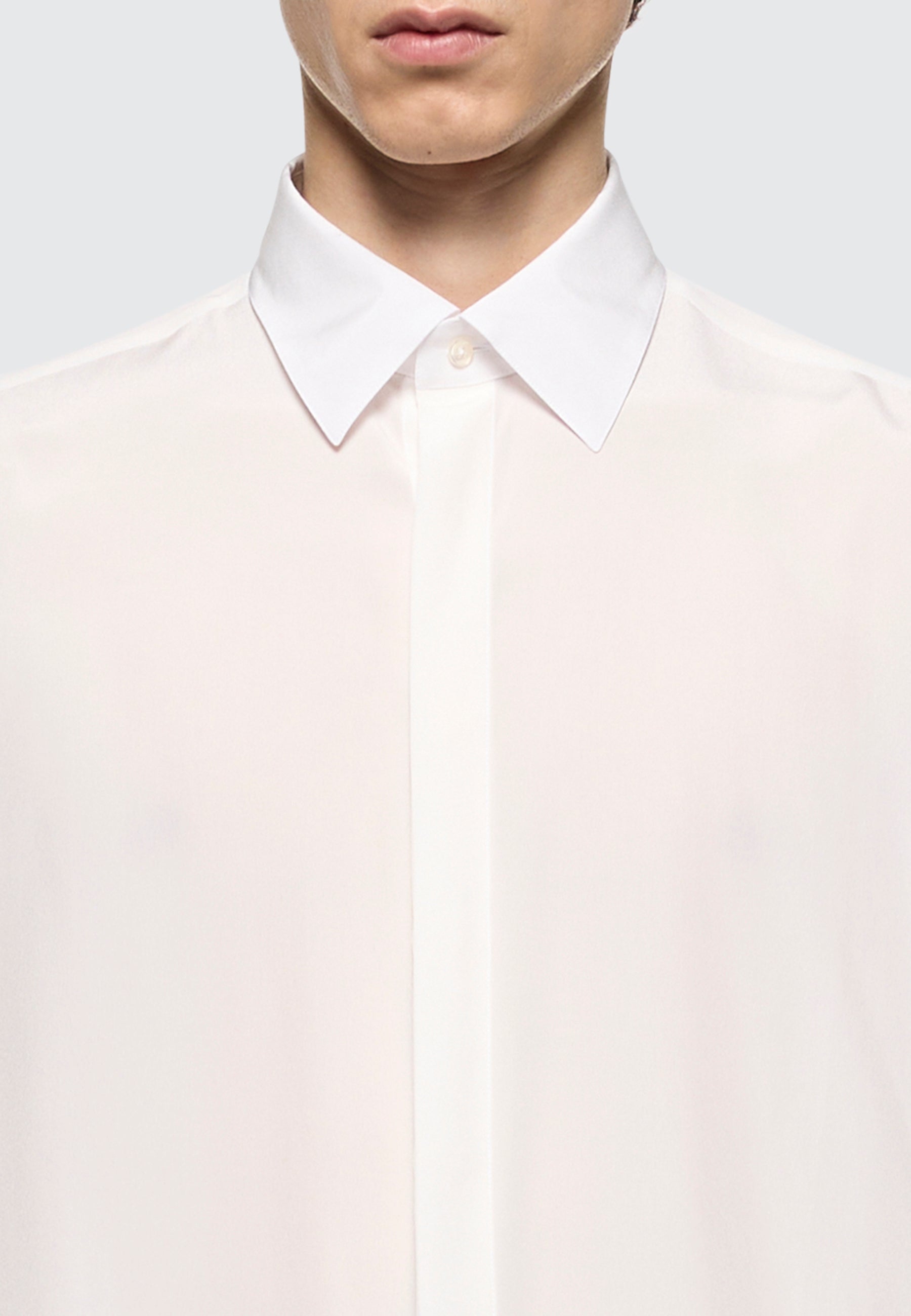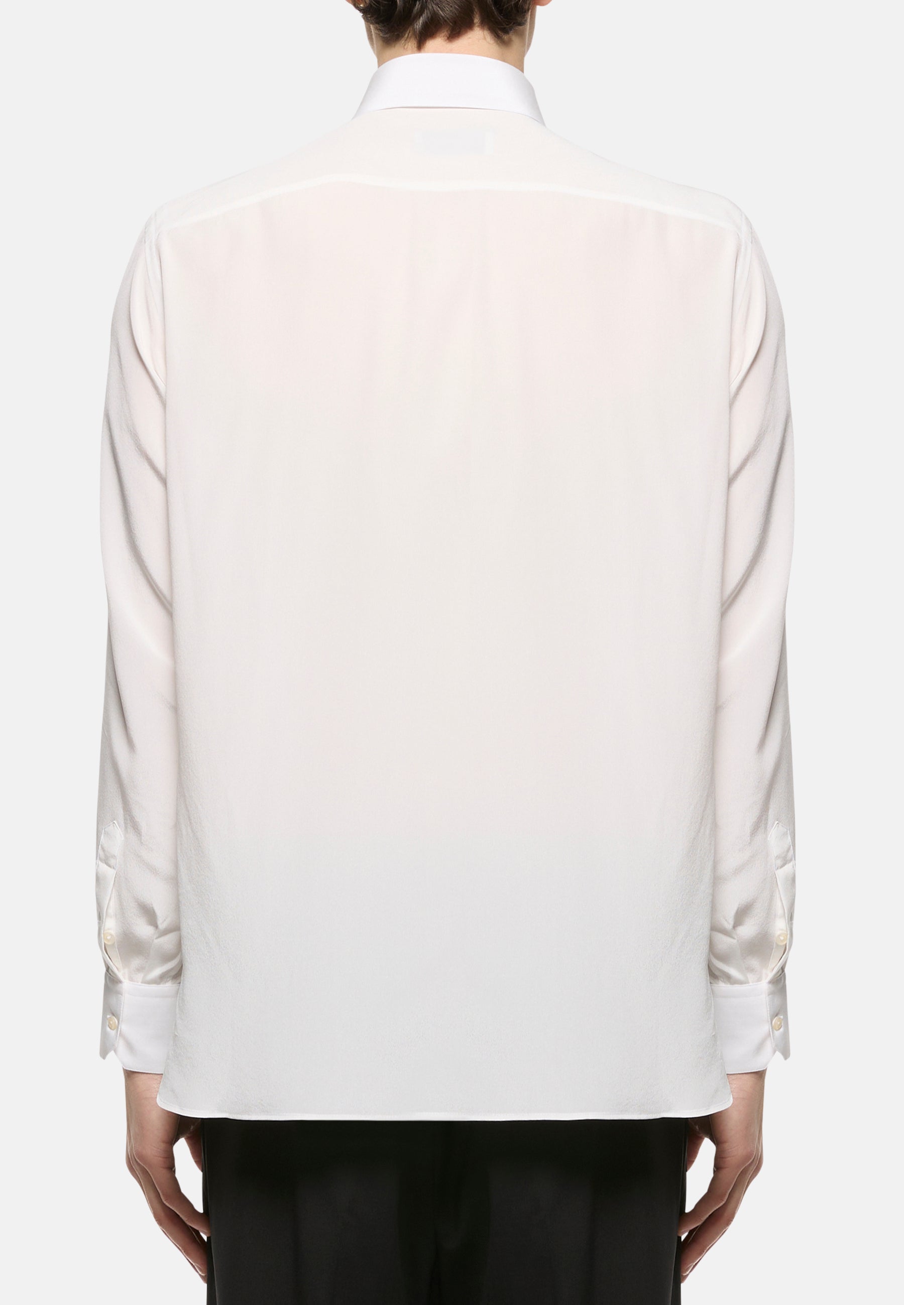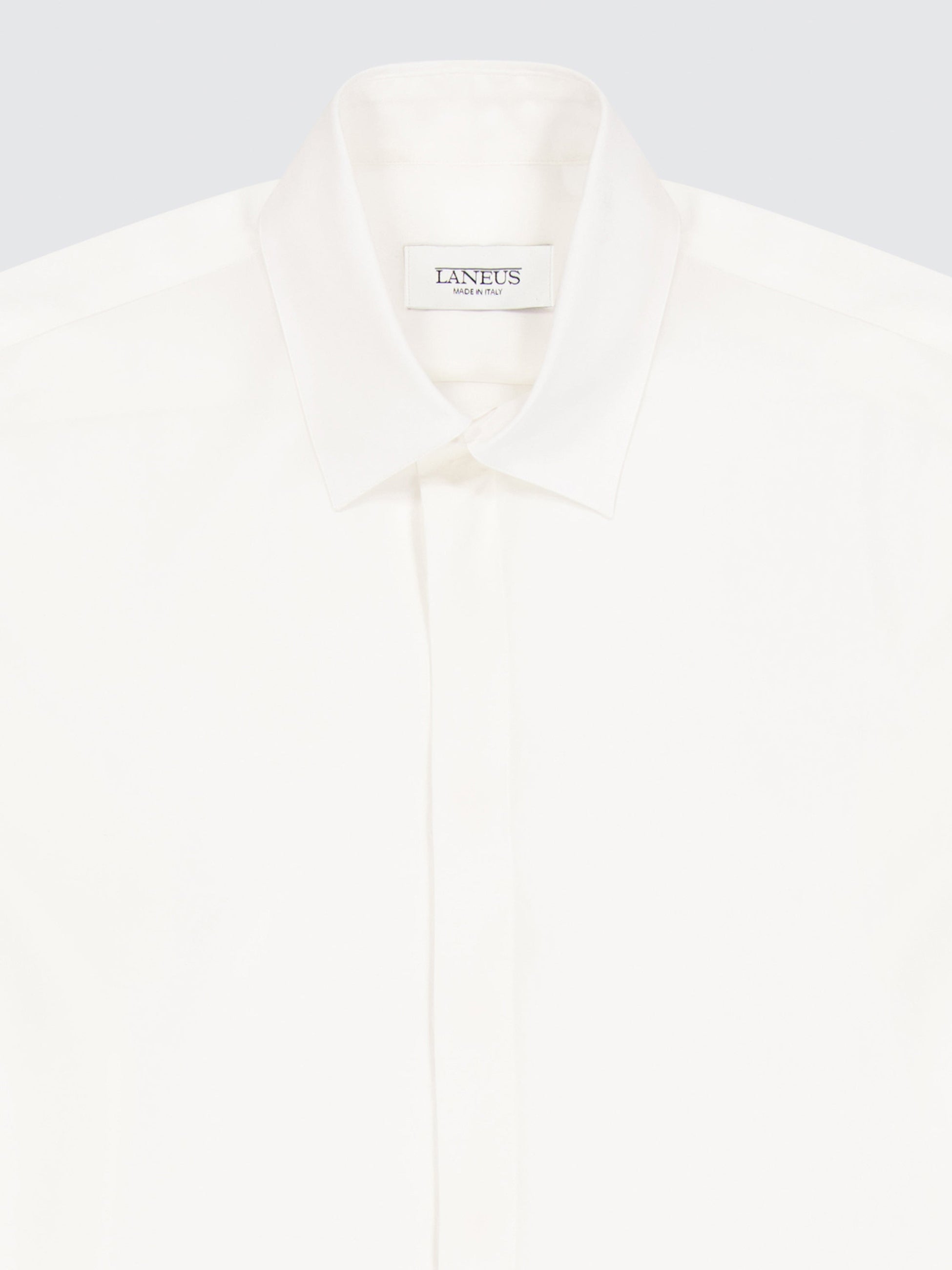 Ogni modello di Laneus combina il meglio dell’artigianato italiano con le migliori materie prime. Questa camicia è realizzata in crepe de chine di seta con finitura leggera e presenta una silhouette comoda a maniche lunghe, un’abbottonatura frontale nascosta da fessino e un colletto all'italiana. Il modello è alto 190 cm ed indossa una CM40/M