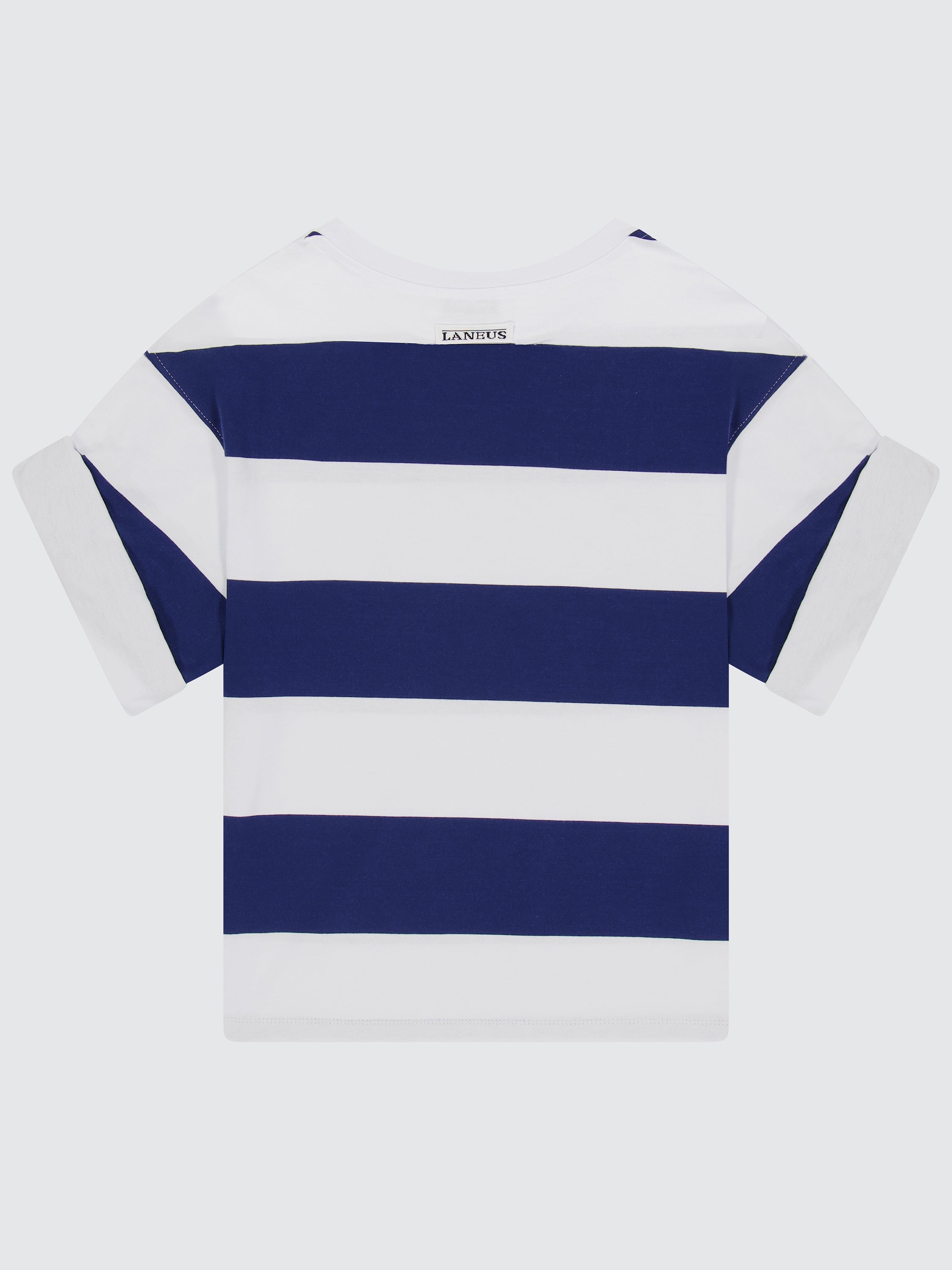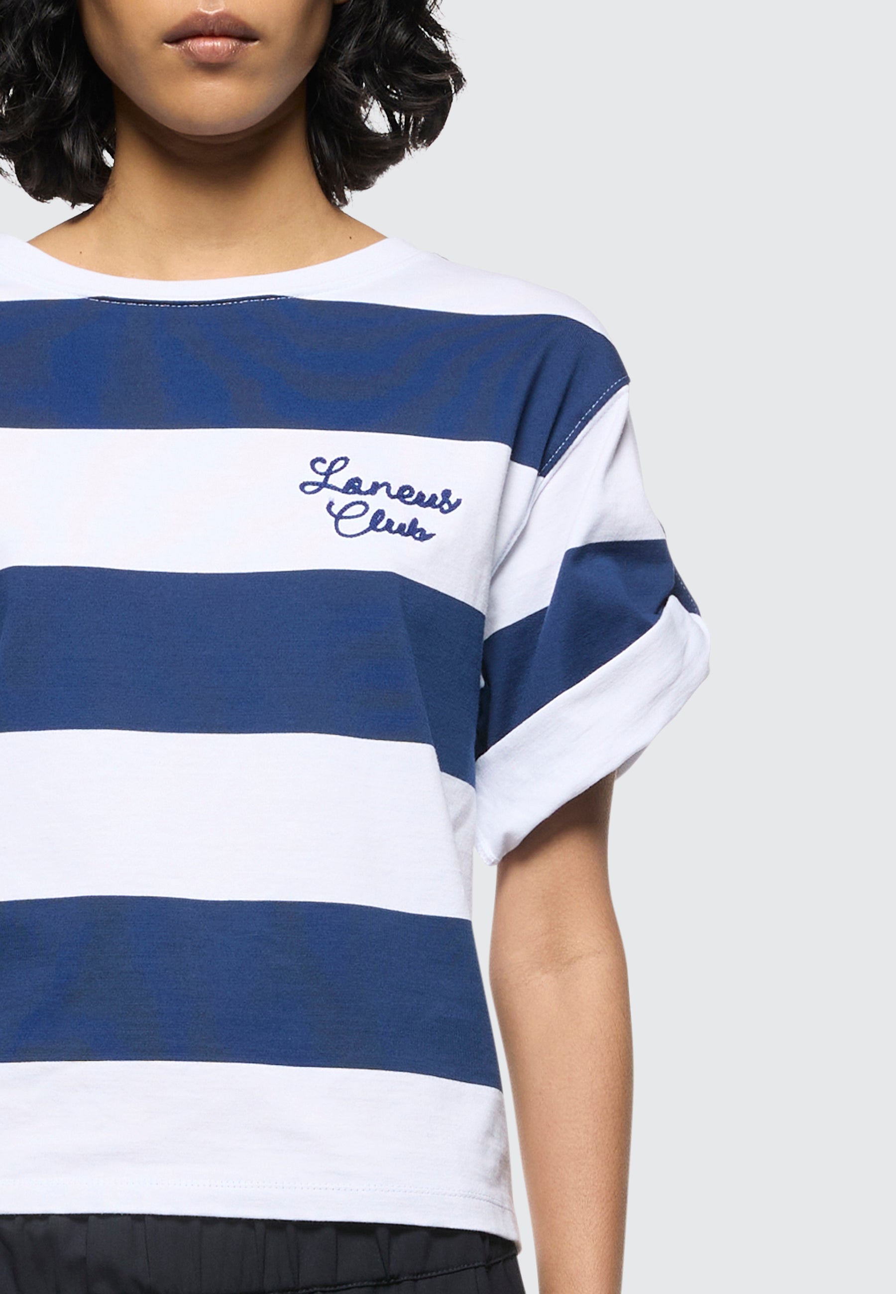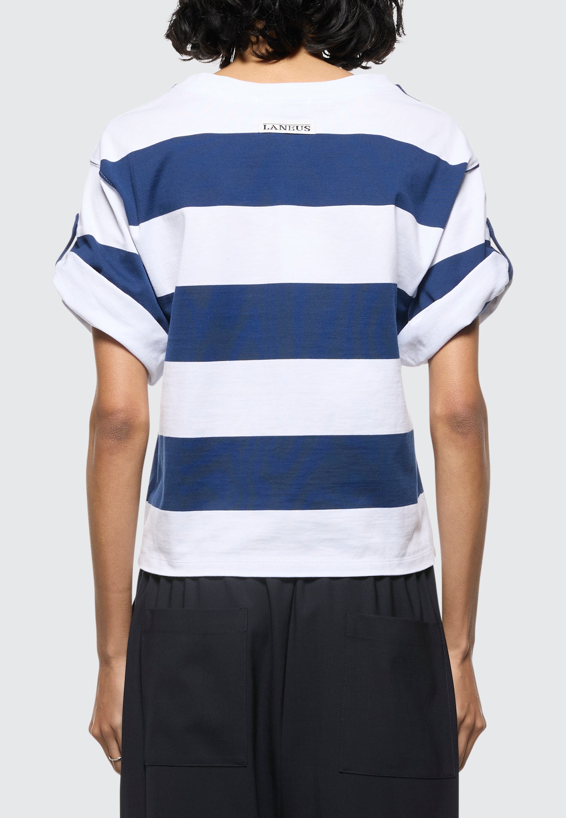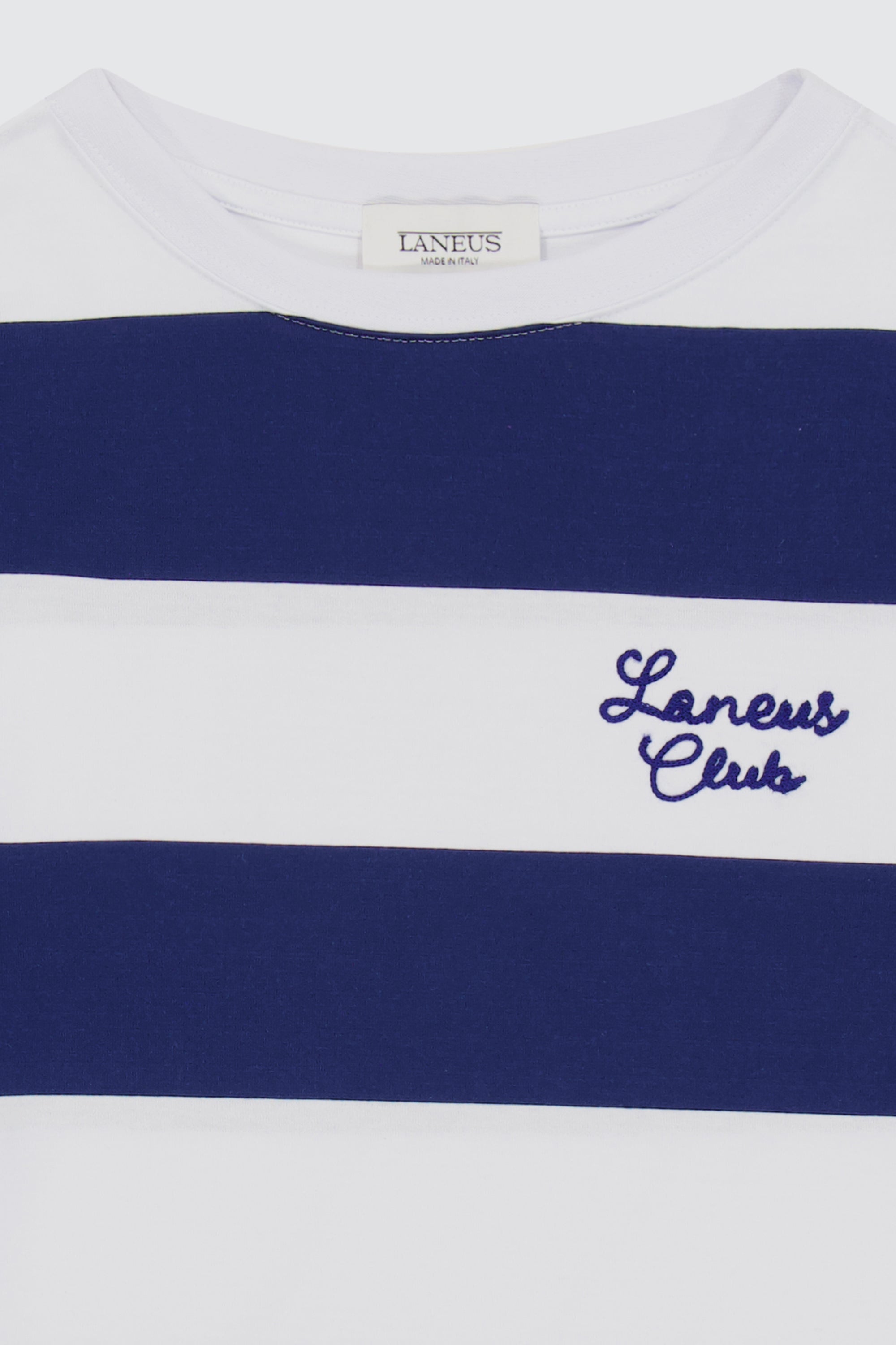 Questa T-shirt a maniche corte di Laneus è realizzata in Italia in puro jersey di cotone. Il modello girocollo stile marina dal fit regular e caratterizzato da una manica corta risvoltata e bloccata da una cappiolina, presenta il logo del brand ricamato sul lato. La modella in foto è alta 180 cm ed indossa una S.