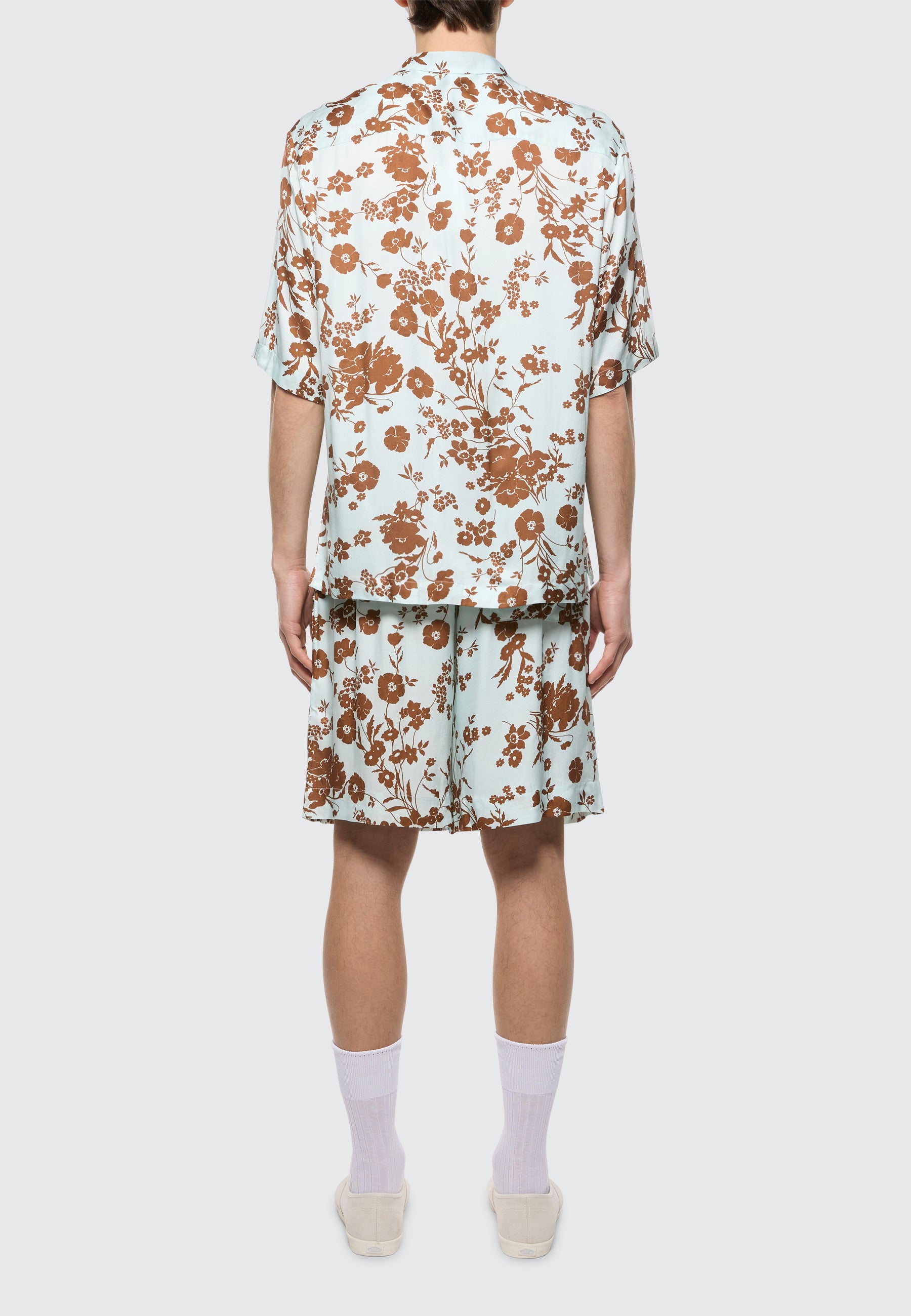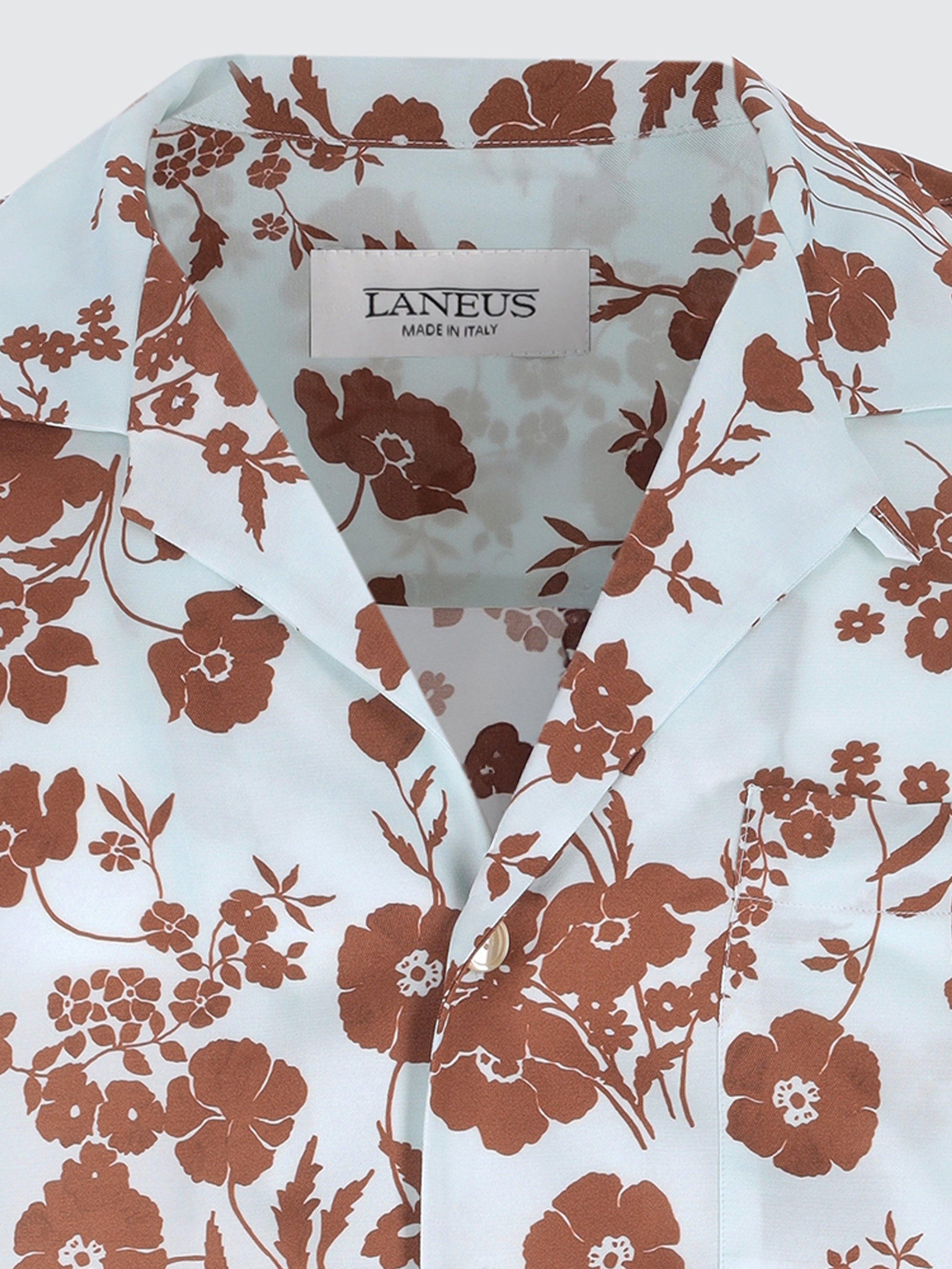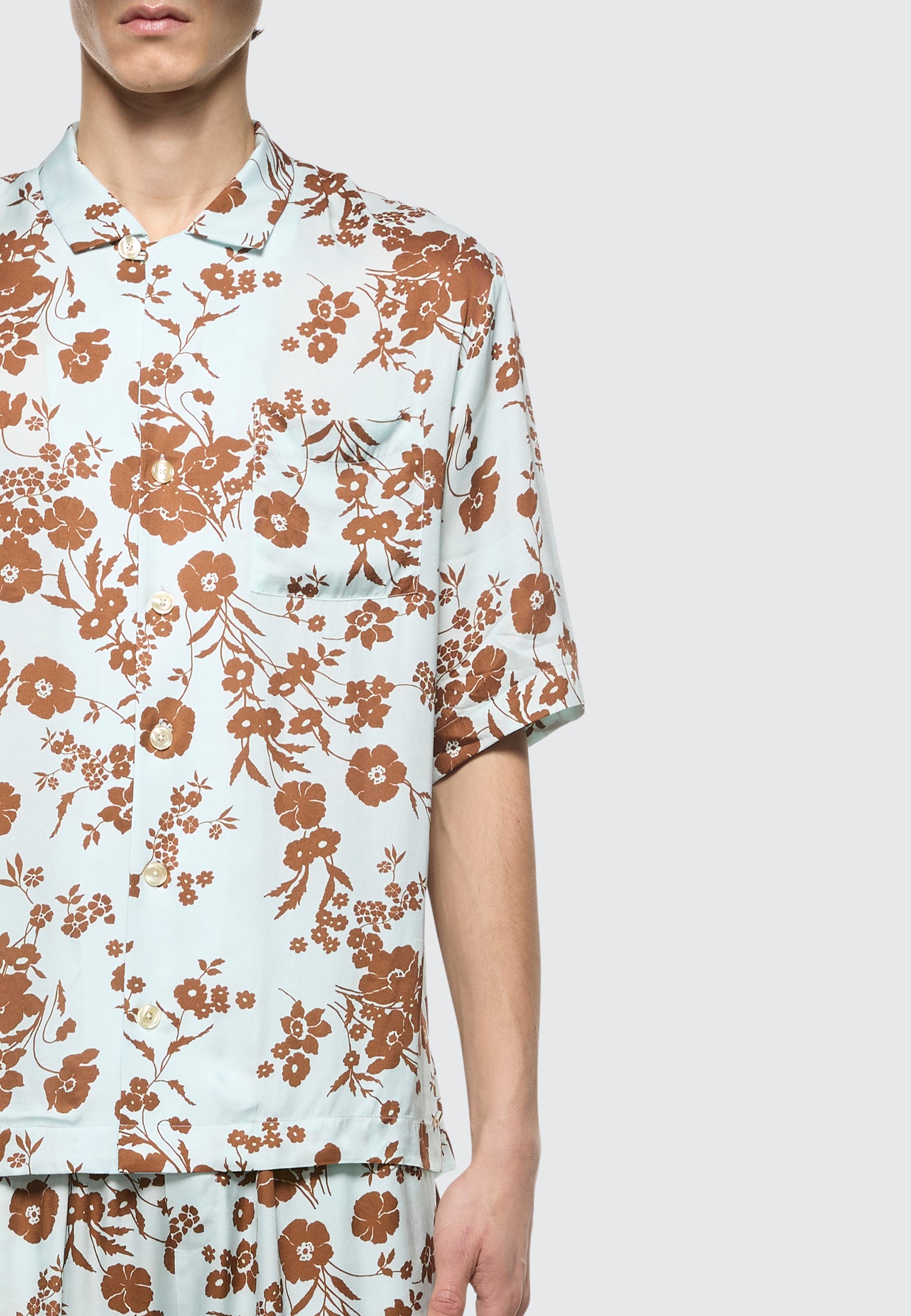 La camicia bowling di Laneus presenta una silhouette boxy con taschino a toppa sul davanti e un motivo floreale all over. Il modello è alto 190 cm ed indossa una 48/M