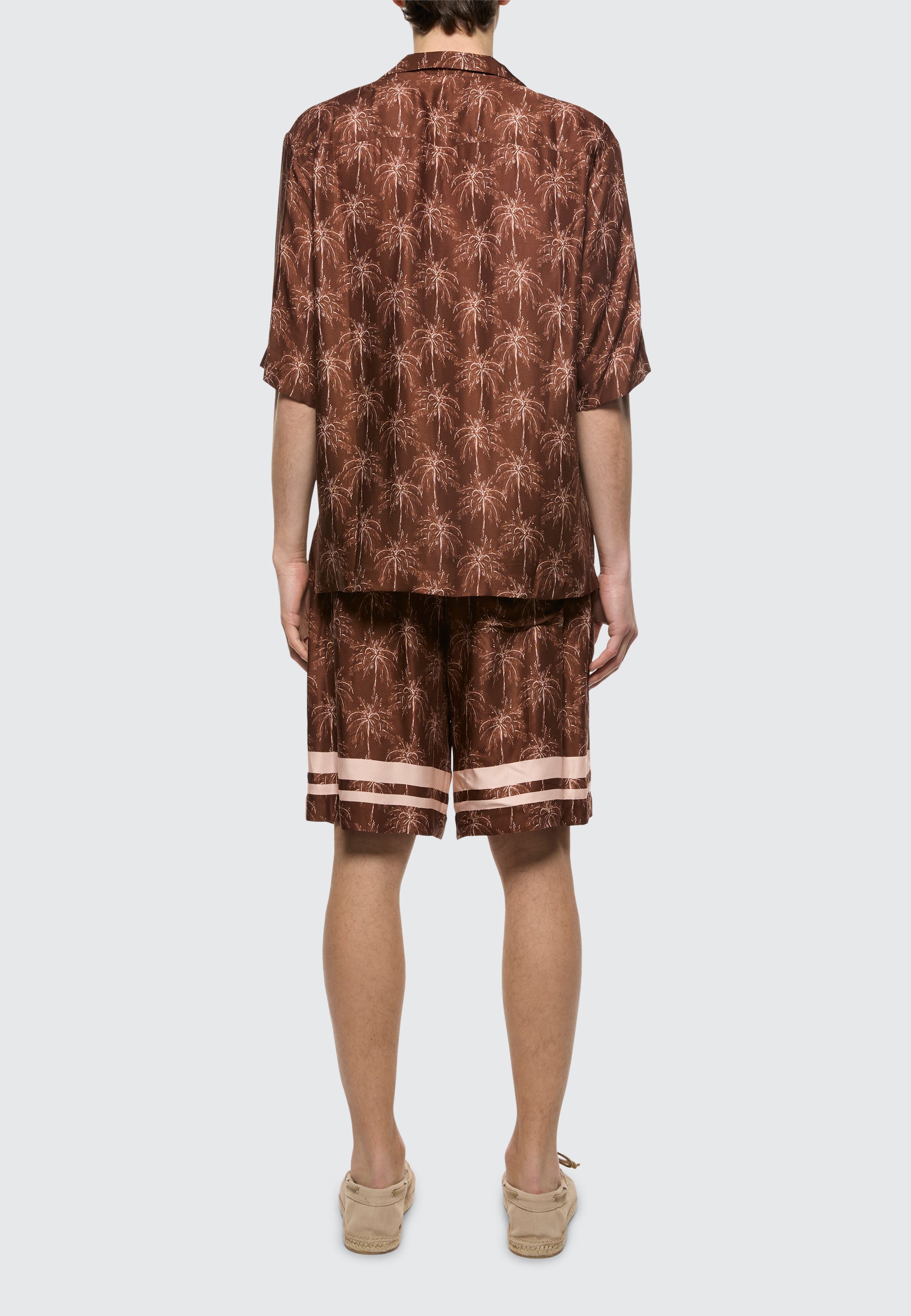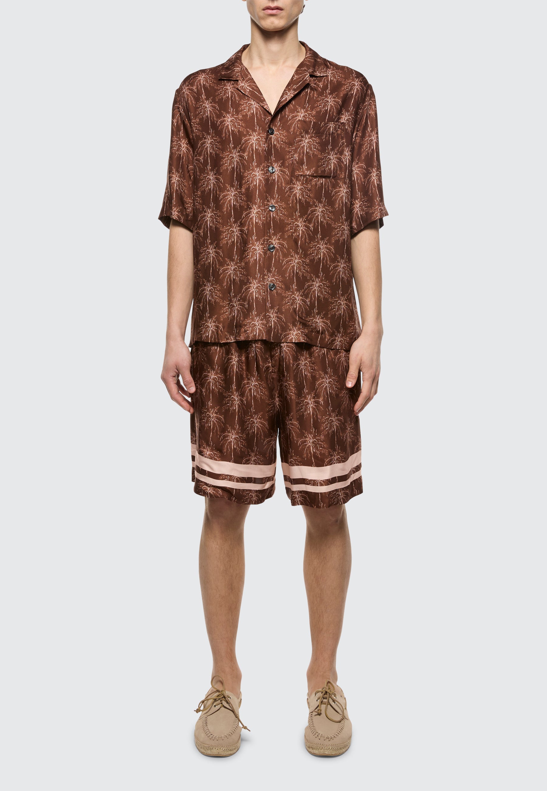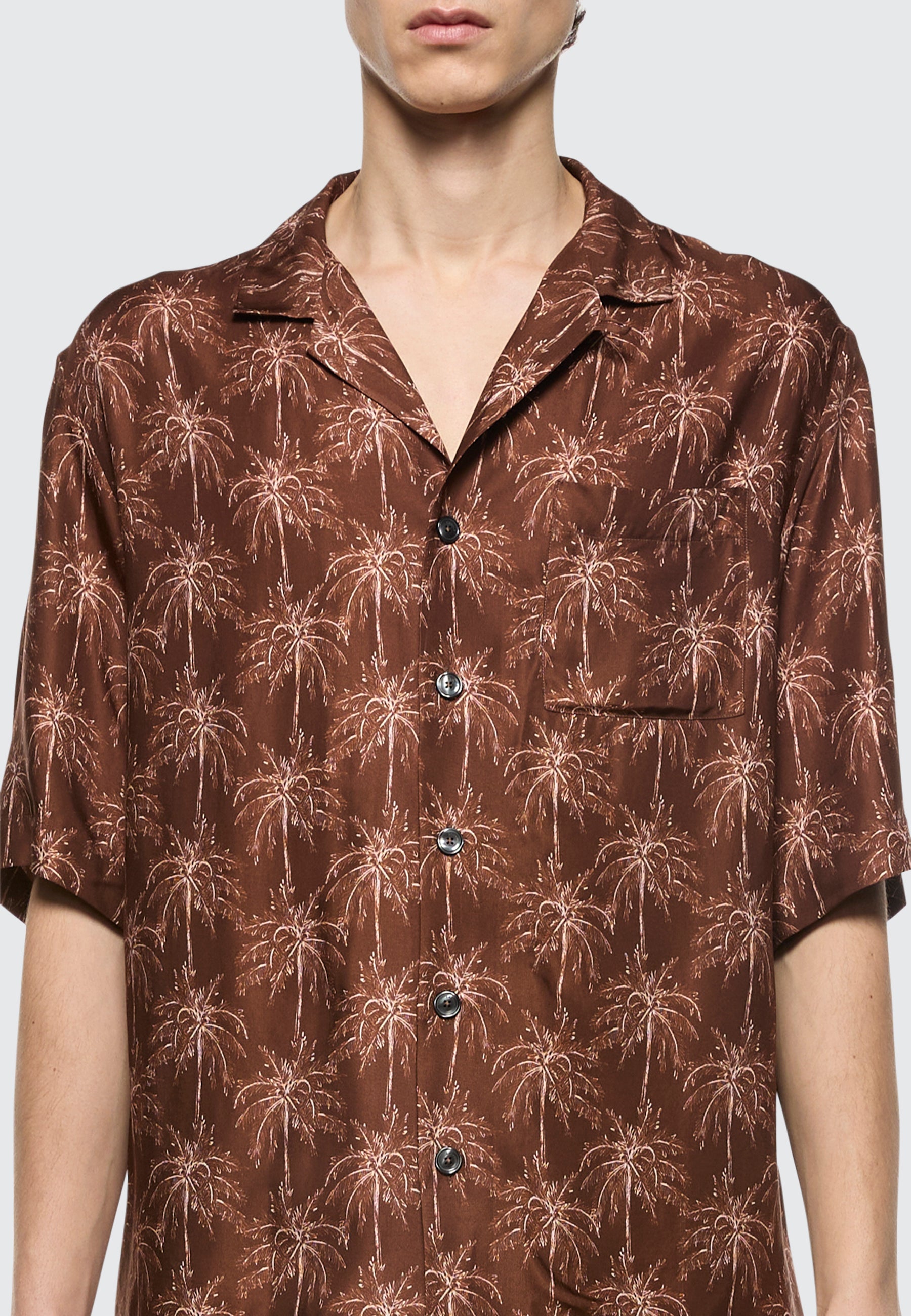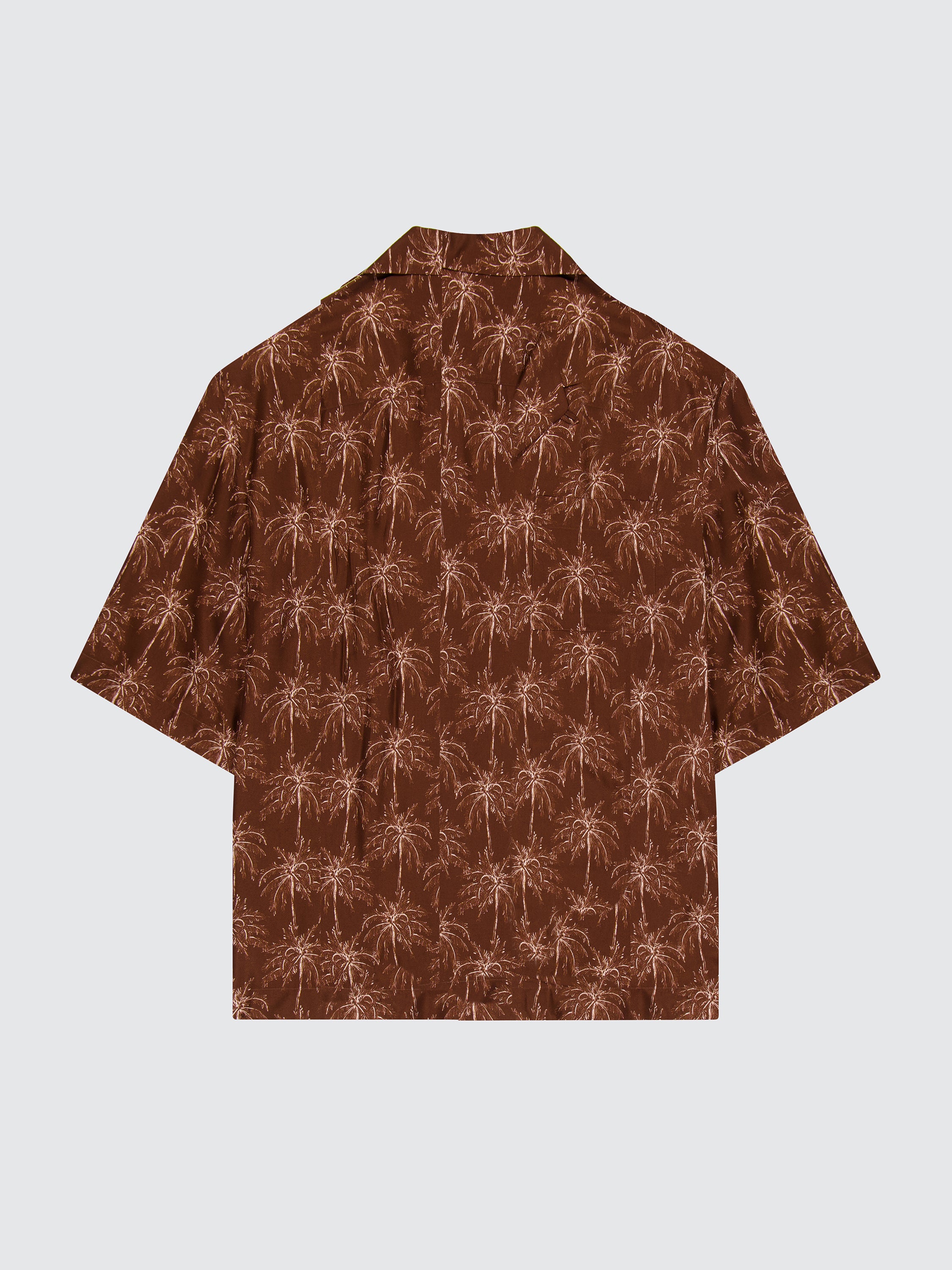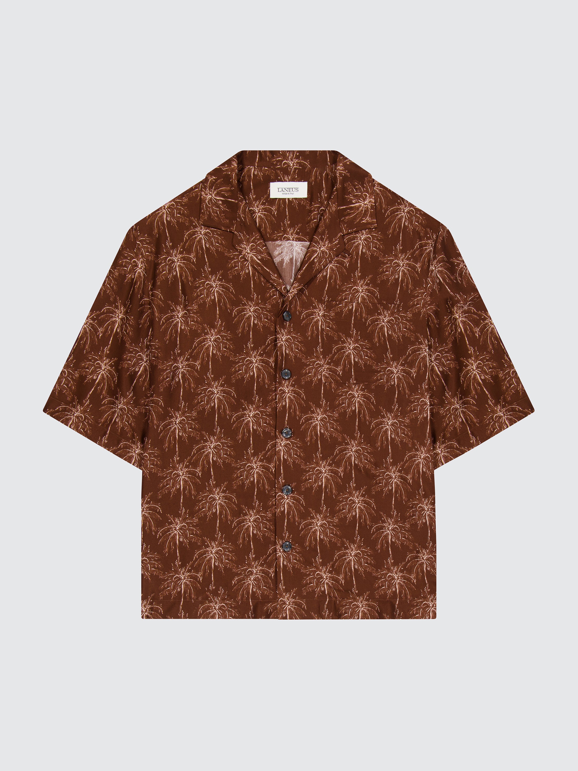 La camicia bowling di Laneus presenta una silhouette boxy con taschino a toppa sul davanti e un motivo tropicale all over. Il modello in foto è alto 190 cm ed indossa una 48/M.