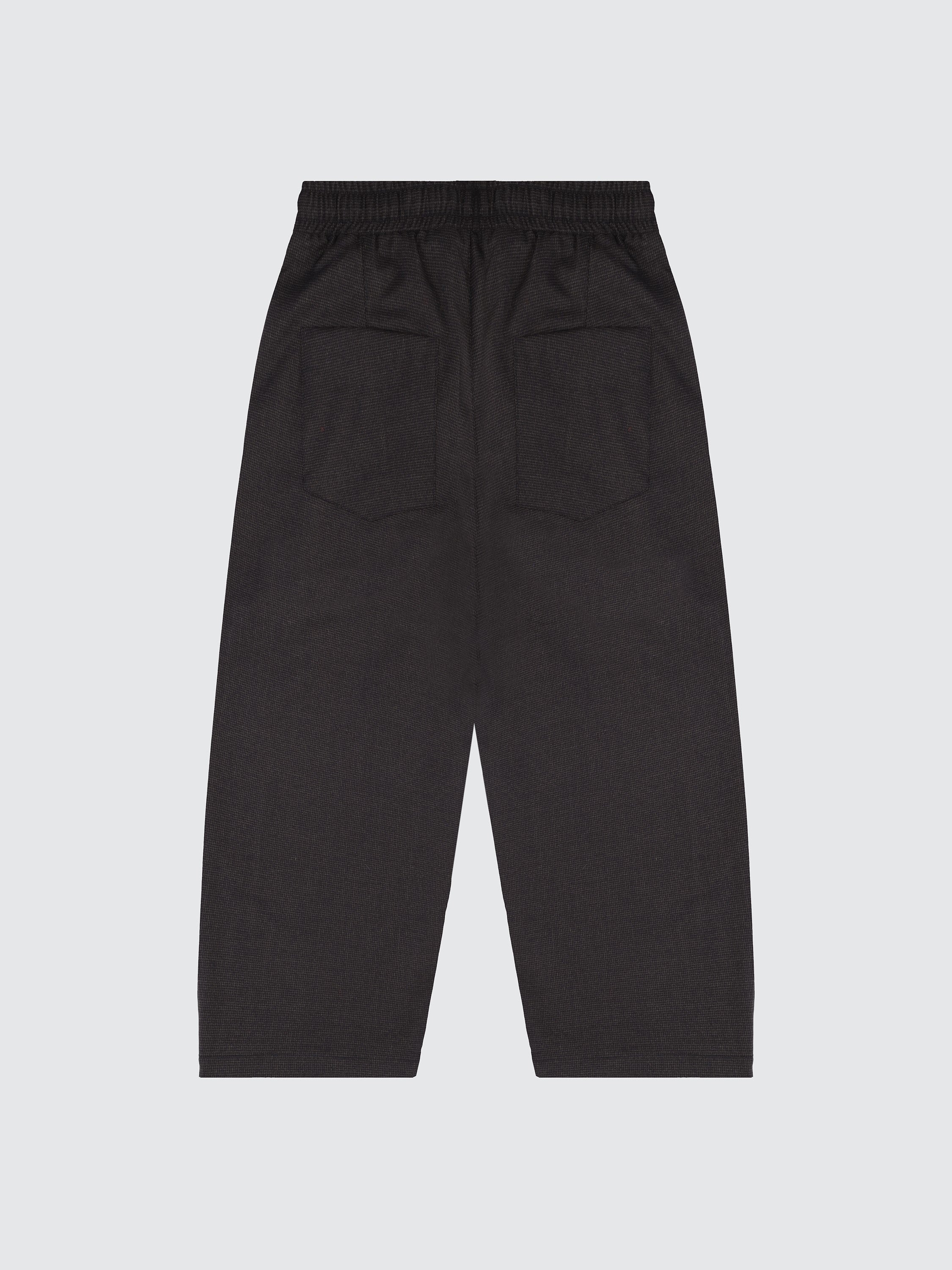 Pantalone bambino firmato Laneus, realizzato in un raffinato tessuto misto lana con motivo microcheck. Il design presenta una gamba ampia, piega frontale e chiusura con bottone e zip. Un capo d’ispirazione sartoriale, perfetto per look eleganti ma confortevoli.